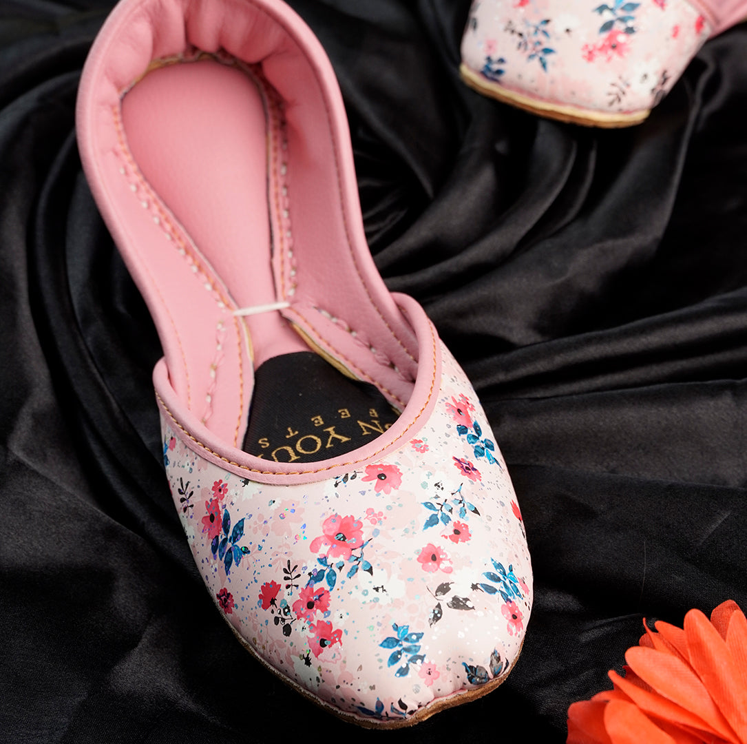 Add a touch of elegance to your outfit with these blush pink floral juttis. Featuring a soft inner lining for maximum comfort and a pastel pink base decorated with vibrant floral prints in red, blue, and black, these handcrafted flats are perfect for both casual and festive wear. The cushioned sole ensures all-day comfort, while the stylish design makes them a versatile choice to pair with ethnic attire or western outfits.