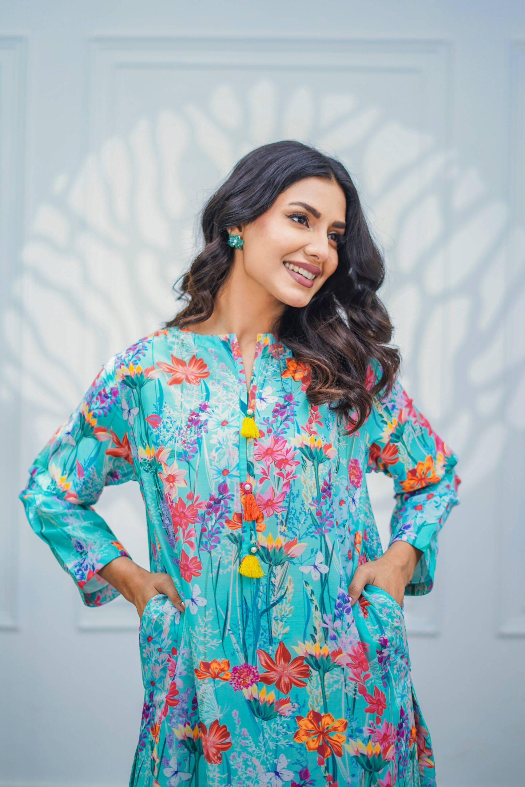 Crafted from airy Swiss Lawn, this serene ensemble is adorned with delicate tassels and moti details, adding a touch of timeless charm. Effortless, graceful, and inspired by nature’s beauty.