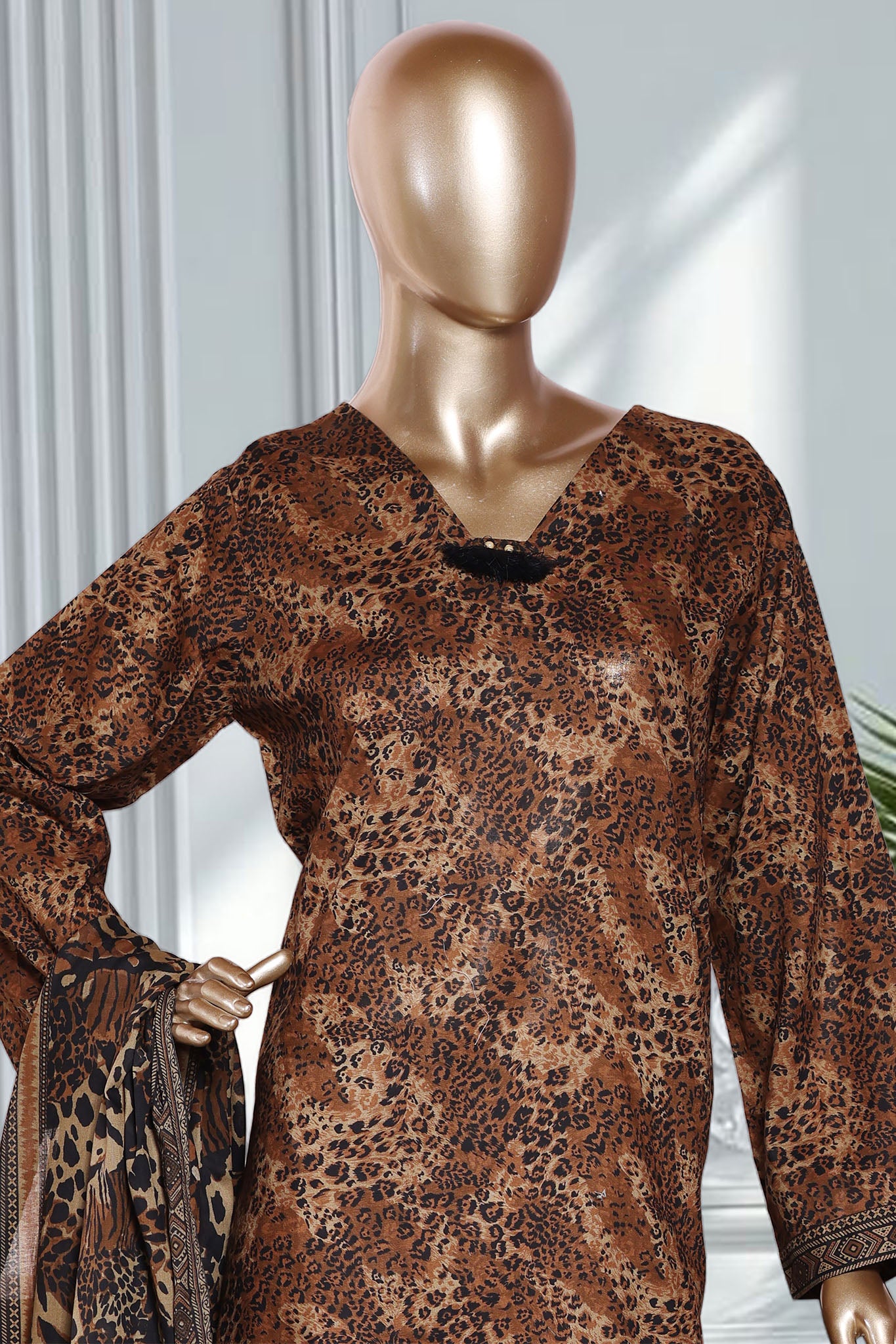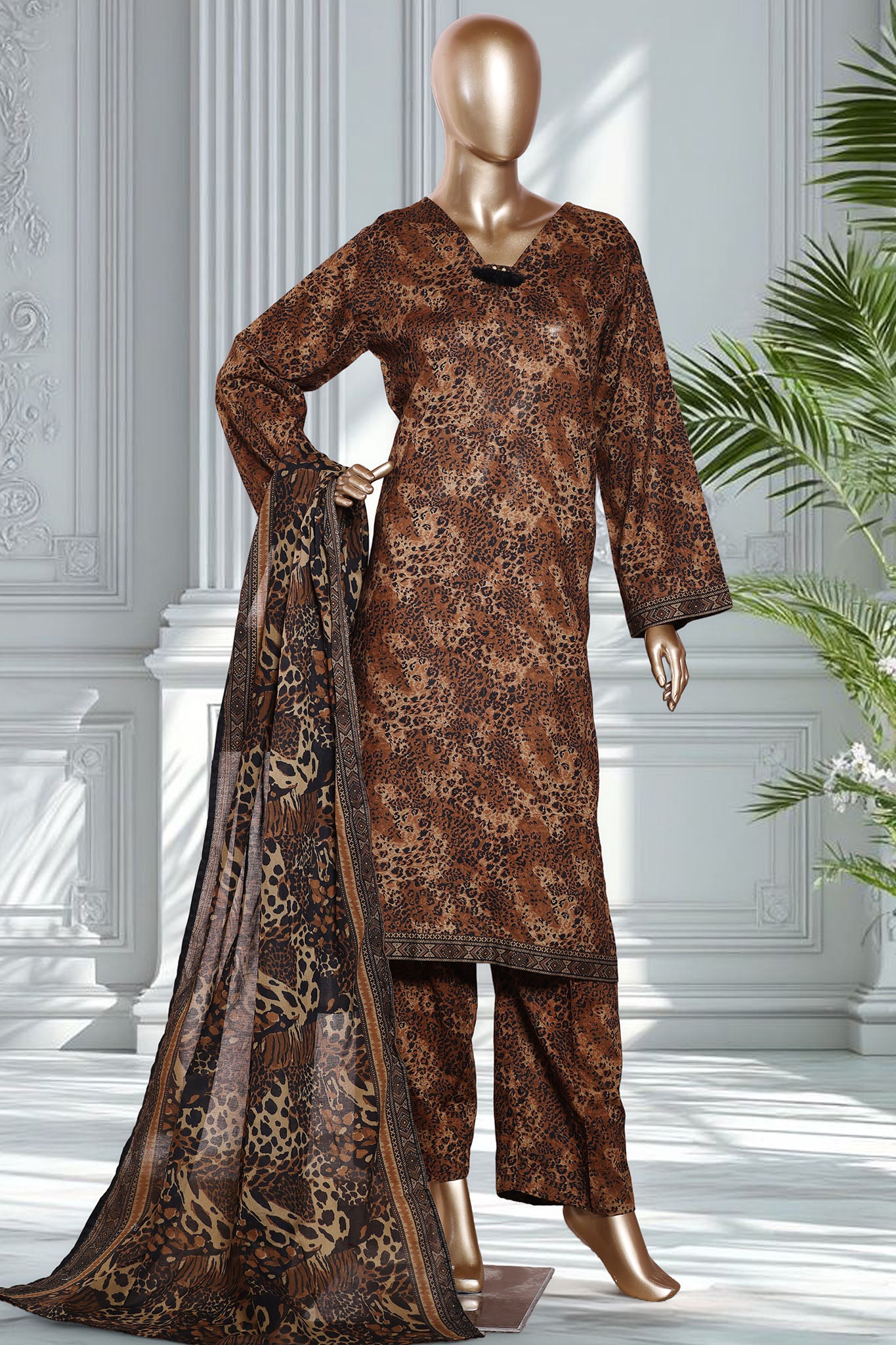 Bin Saeed Stitched 3 Piece Exclusive Printed Lawn Vol-02 Suit-LSM-2767-BROWN