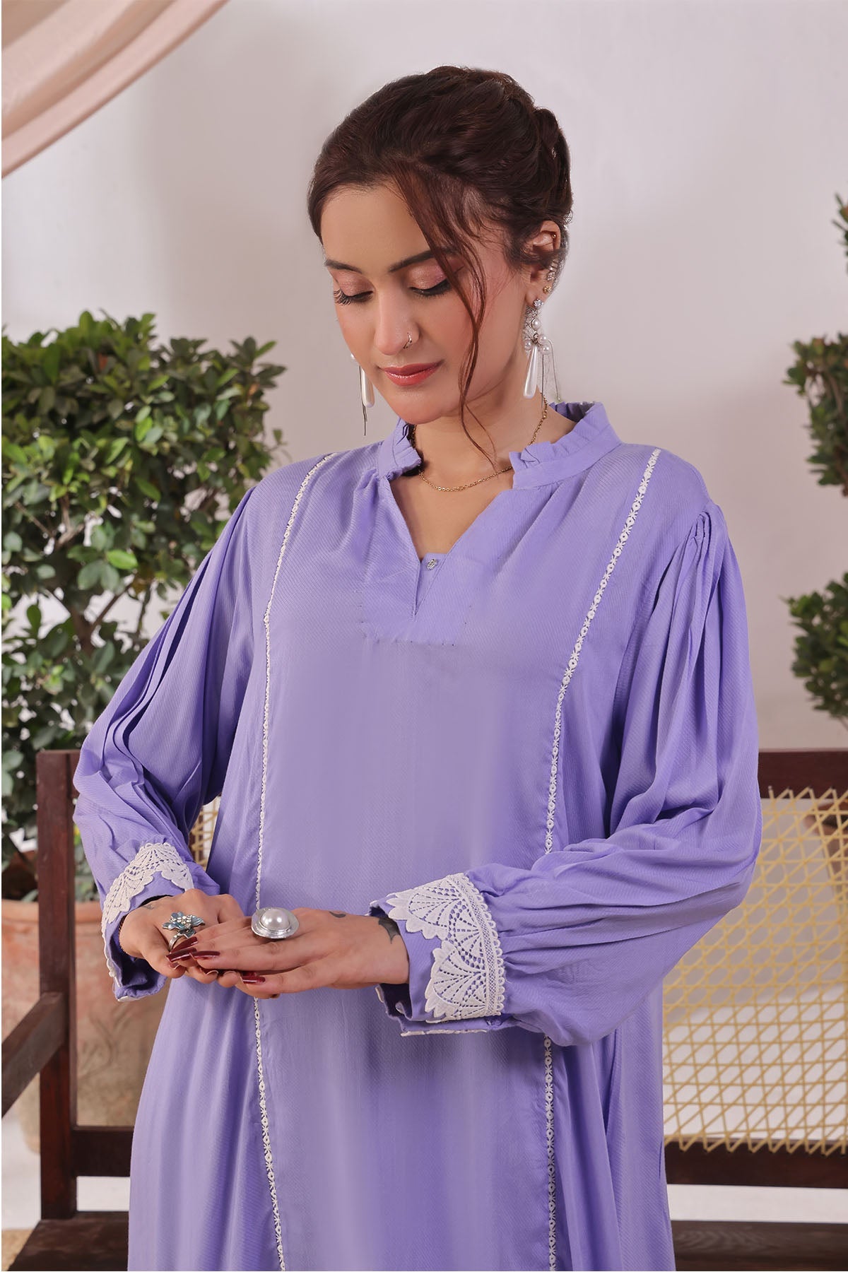 Top: Lavender Rod Silk Kurta With Crotia Laces