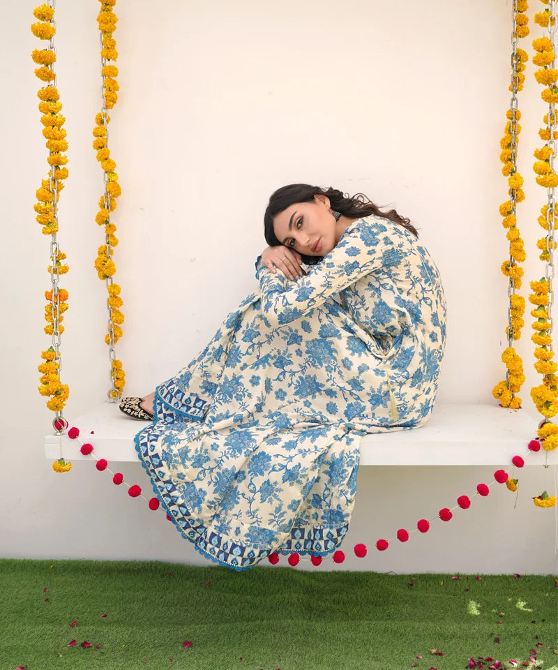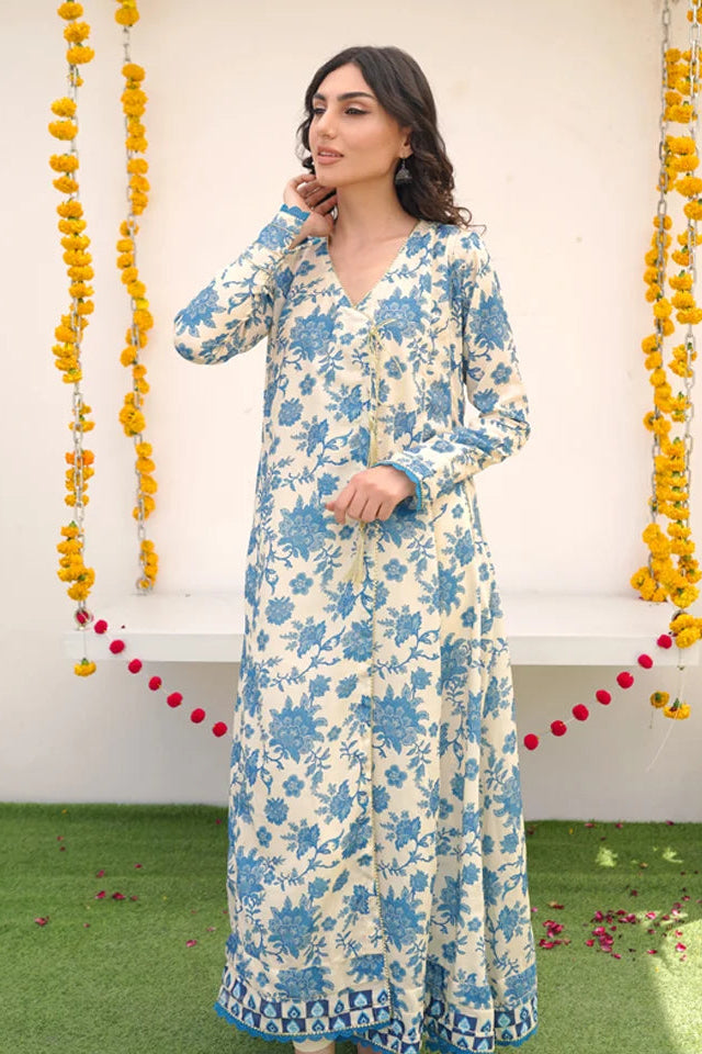 This 1-piece printed jacquard flared kalidar angrakha frock having neckline lace detail with dori tassel. It's minimal print and striking aspect makes it your must have pick this Eid to feel ethereal and elegant at the same time.