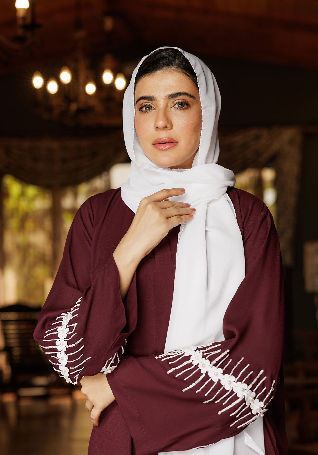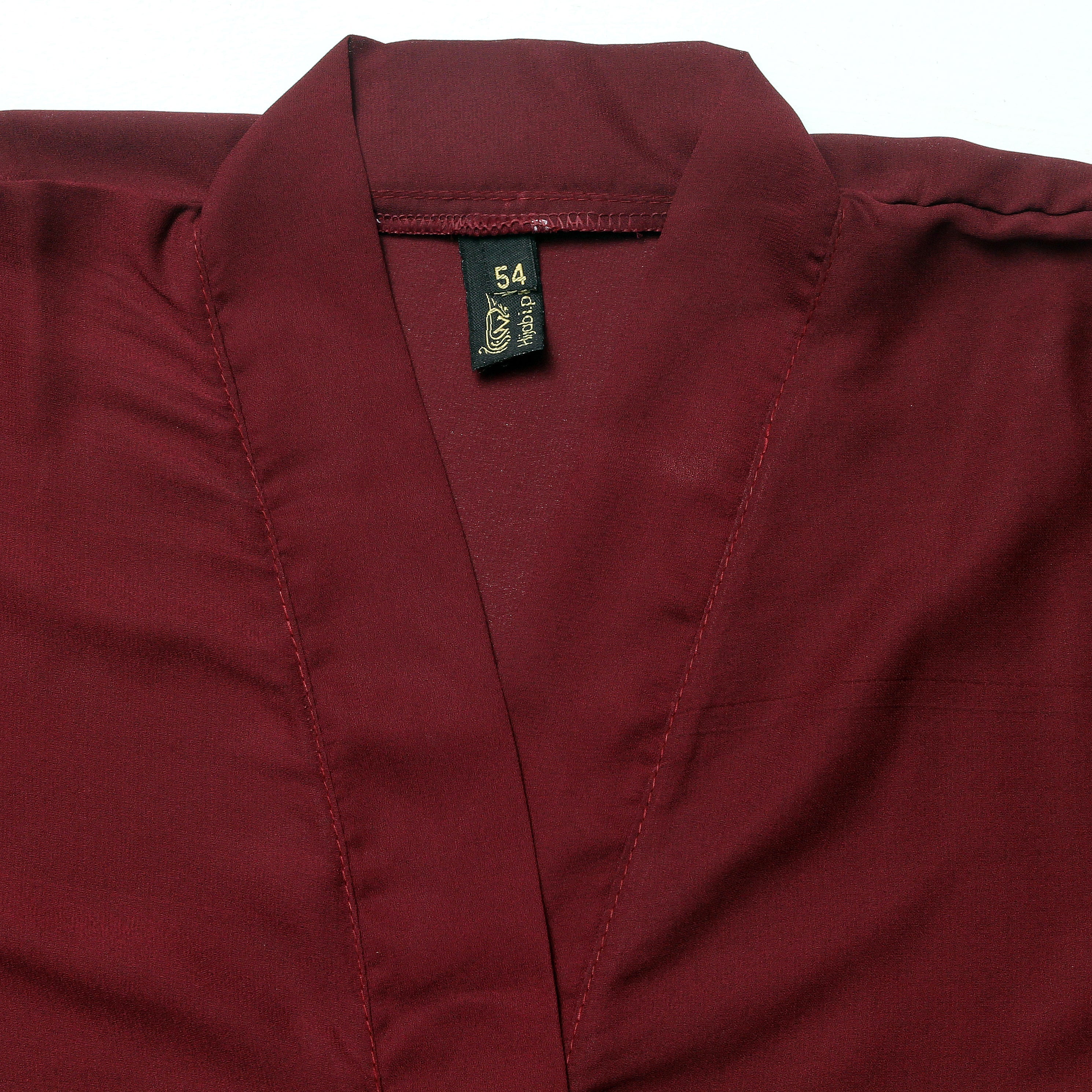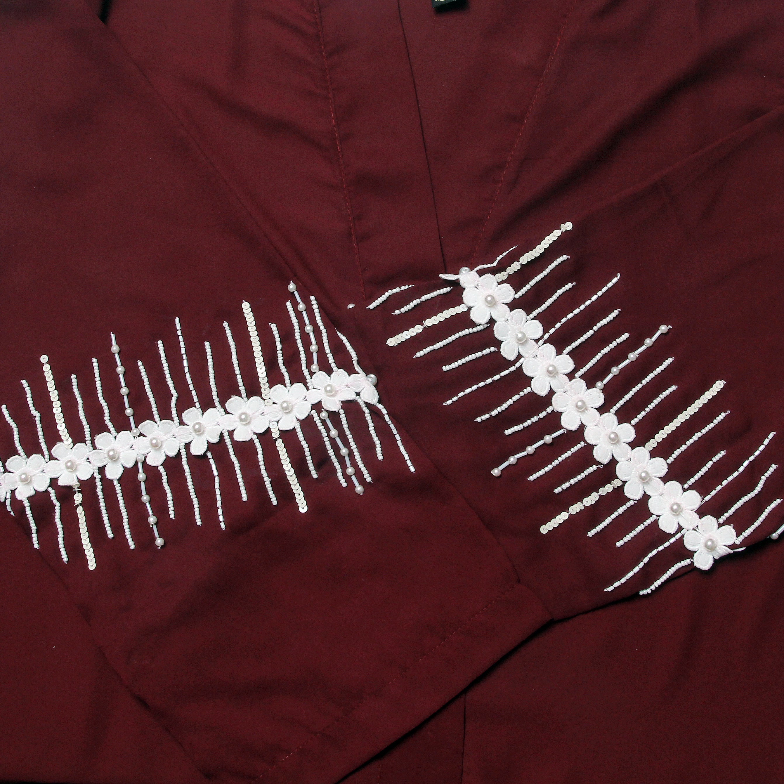 This elegant maroon abaya crafted from premium Nida fabric offers a graceful drape and comfortable wear. The exquisite handwork on the sleeves adds a refined touch of artistry, making it perfect for sophisticated occasions. Its timeless design combines modesty with subtle luxury, ensuring you stand out with understated elegance.