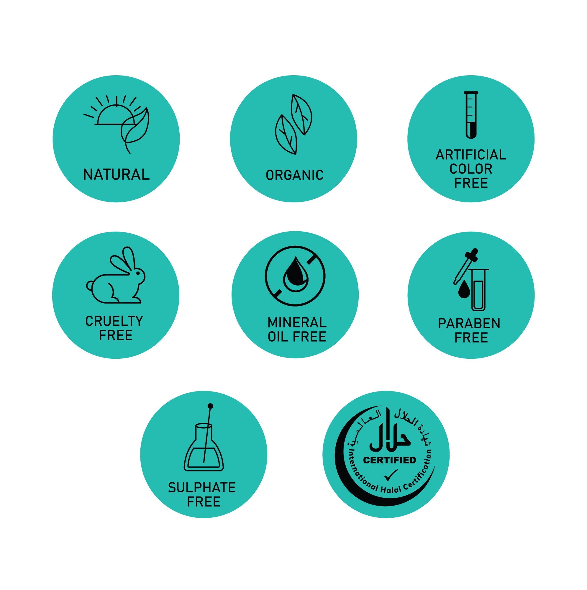 This product is: Natural, Organic, Artificial Color Free, Cruelty Free, Mineral Oil Free, Paraben Free, Sulphate Free, Halal