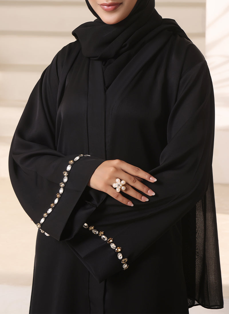 Discover timeless elegance with the Noir Luxe Abaya by Hijab ul Hareem. Crafted from premium Nida fabric, this black abaya features exquisite handwork detailing on the sleeves, adding a touch of sophistication and charm. Perfect for formal events or evening wear, it embodies the graceful essence of Hijab ul Hareem?s modern modest fashion.