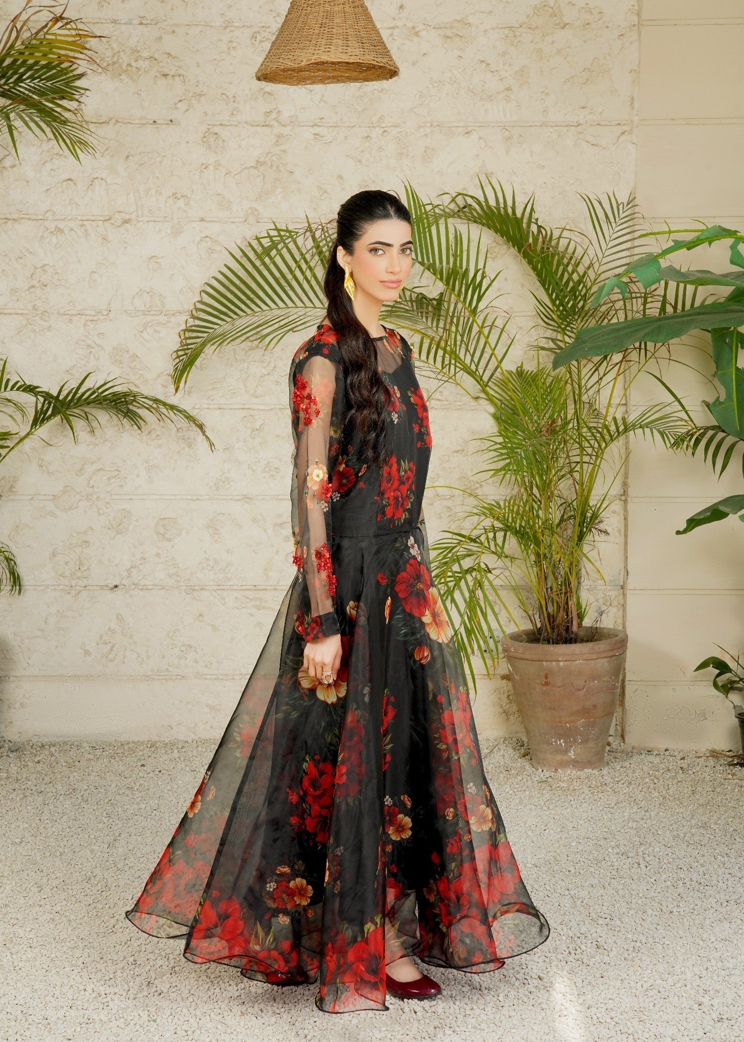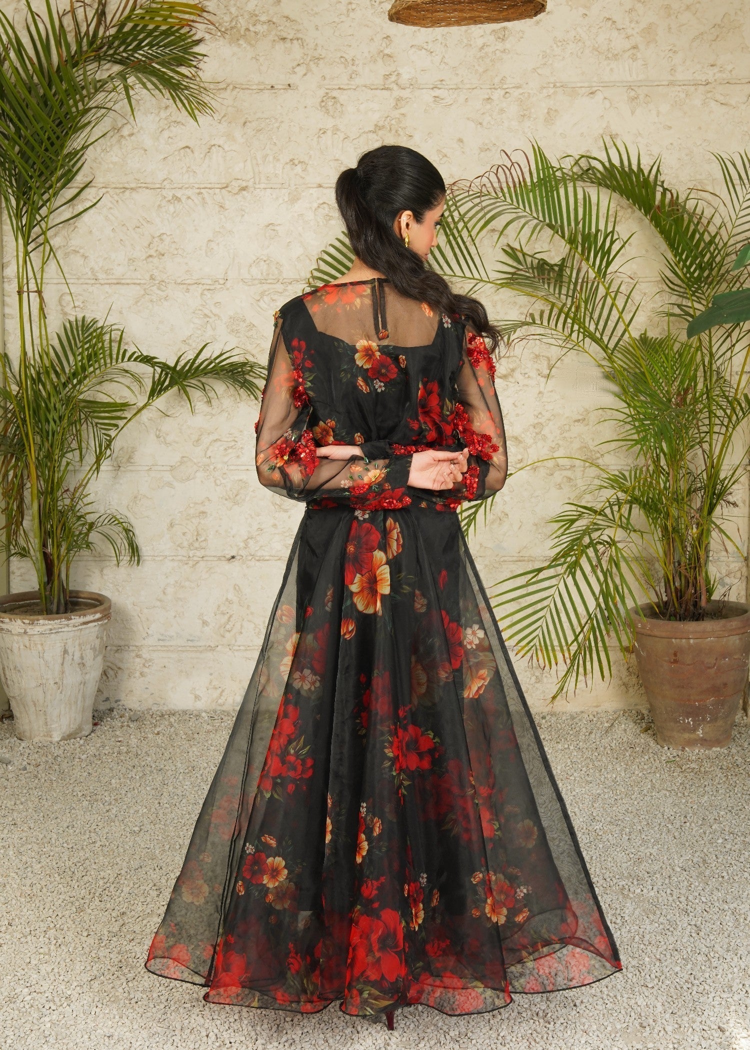 The Organza Printed Red Floral Peshwas is a stunning and regal piece, designed to make a bold statement. The fabric is crafted from delicate organza, which has a light, sheer quality that adds an ethereal, graceful touch to the garment. The rich red hue, complemented by a beautiful floral print, creates a striking contrast, adding vibrancy and elegance to the overall look. The Peshwas style, characterized by its long, flowing silhouette 160" flared, gives the dress a traditional and royal feel. The design features embellished sleeves adorned with intricate sequins and crystals. These embellishments catch the light, adding a dazzling sparkle and enhancing the luxurious appeal of the Peshwas. The combination of sequins and crystals creates a perfect balance of glamour without overwhelming the design. At the bottom of the flared hem, the Peshwas is finished with pico detailing, which provides a neat, polished edge while subtly enhancing the overall shape of the garment. The flared bottom adds volume and movement to the dress, making it an ideal choice for special occasions where elegance and grace are key