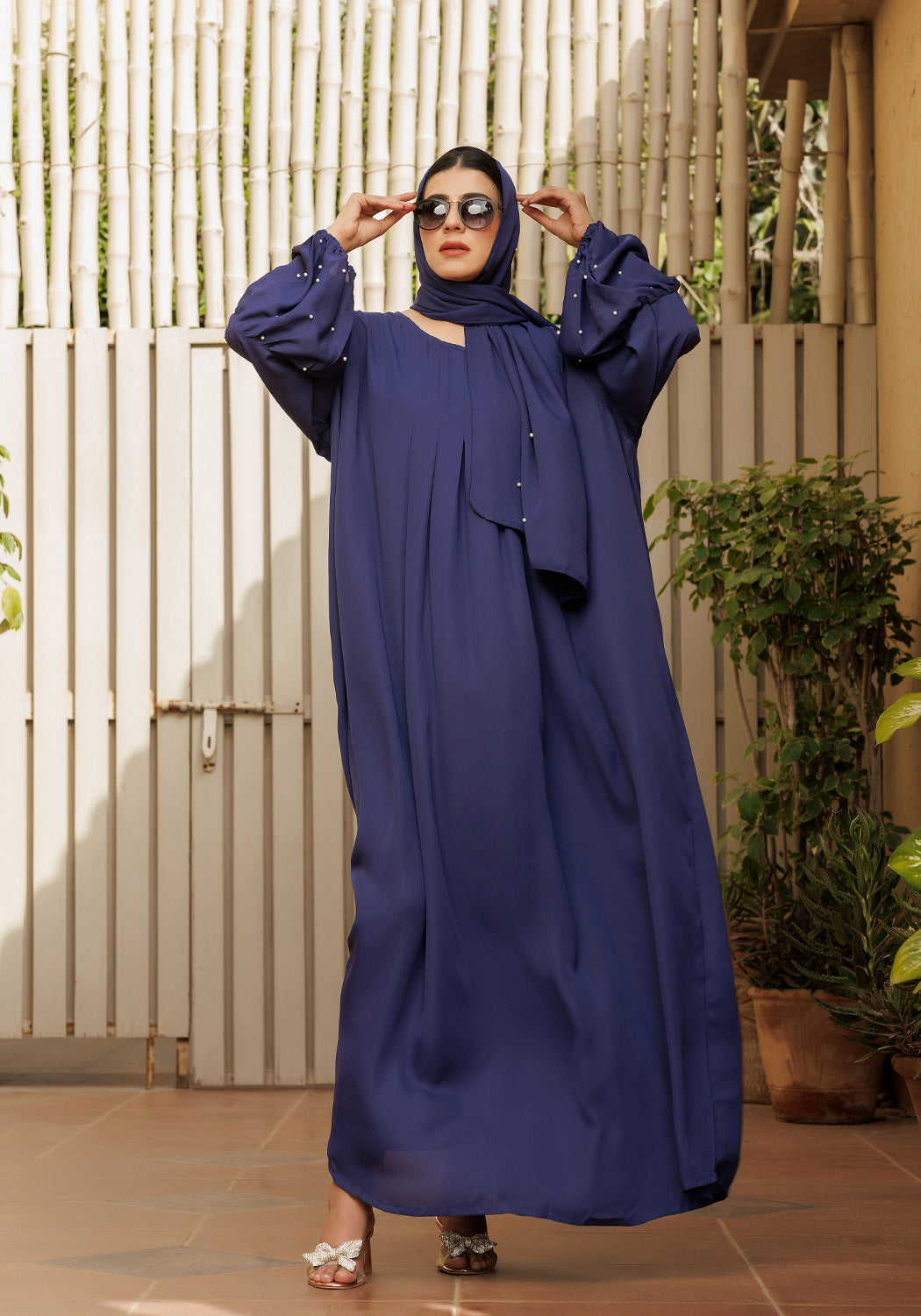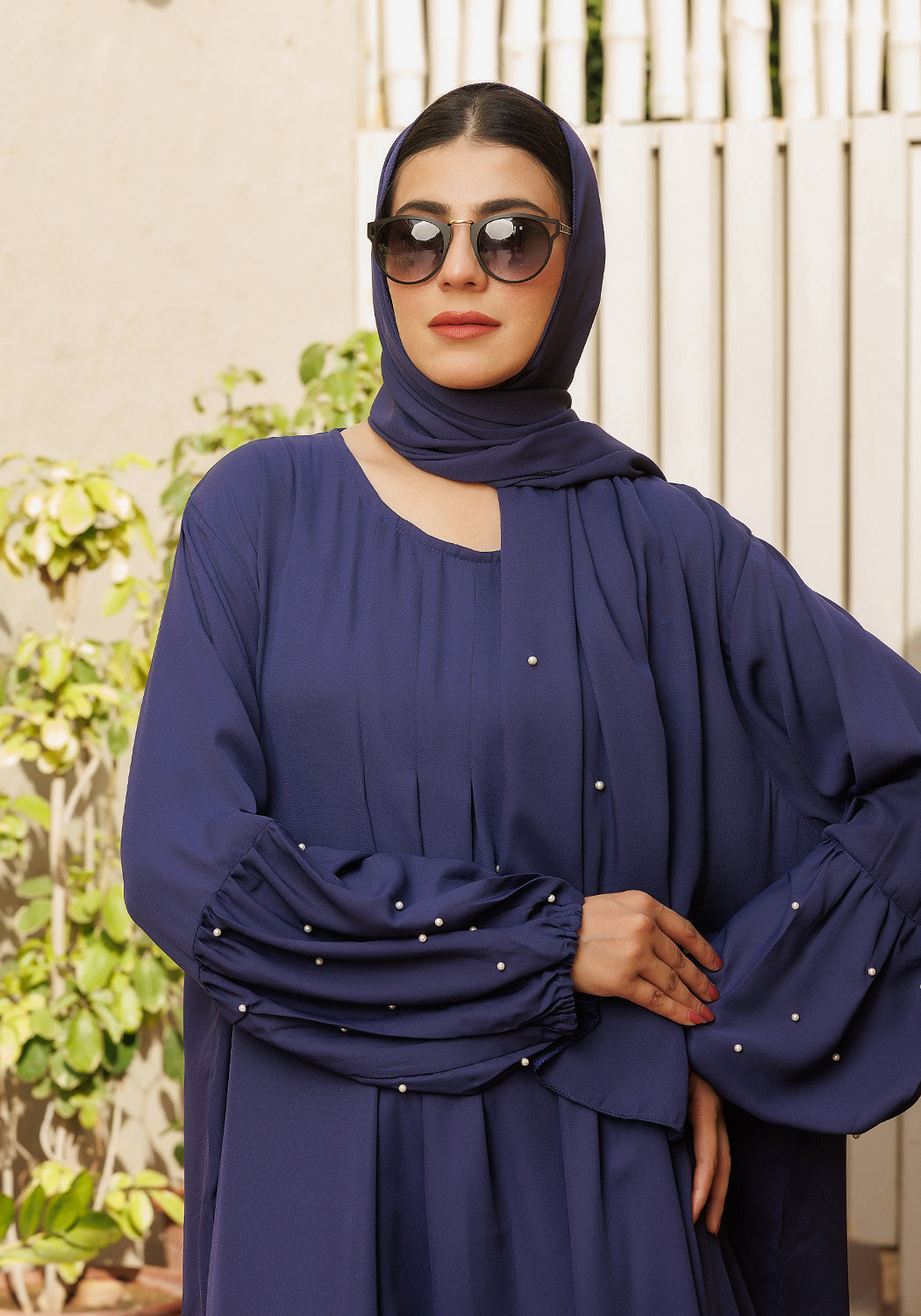 Enhance your wardrobe with this beautiful royal blue abaya. Made with high-quality material, it offers both comfort and style. The pure white pearls add a touch of elegance, perfect for any occasion. Invest in this versatile piece and elevate your fashion game.