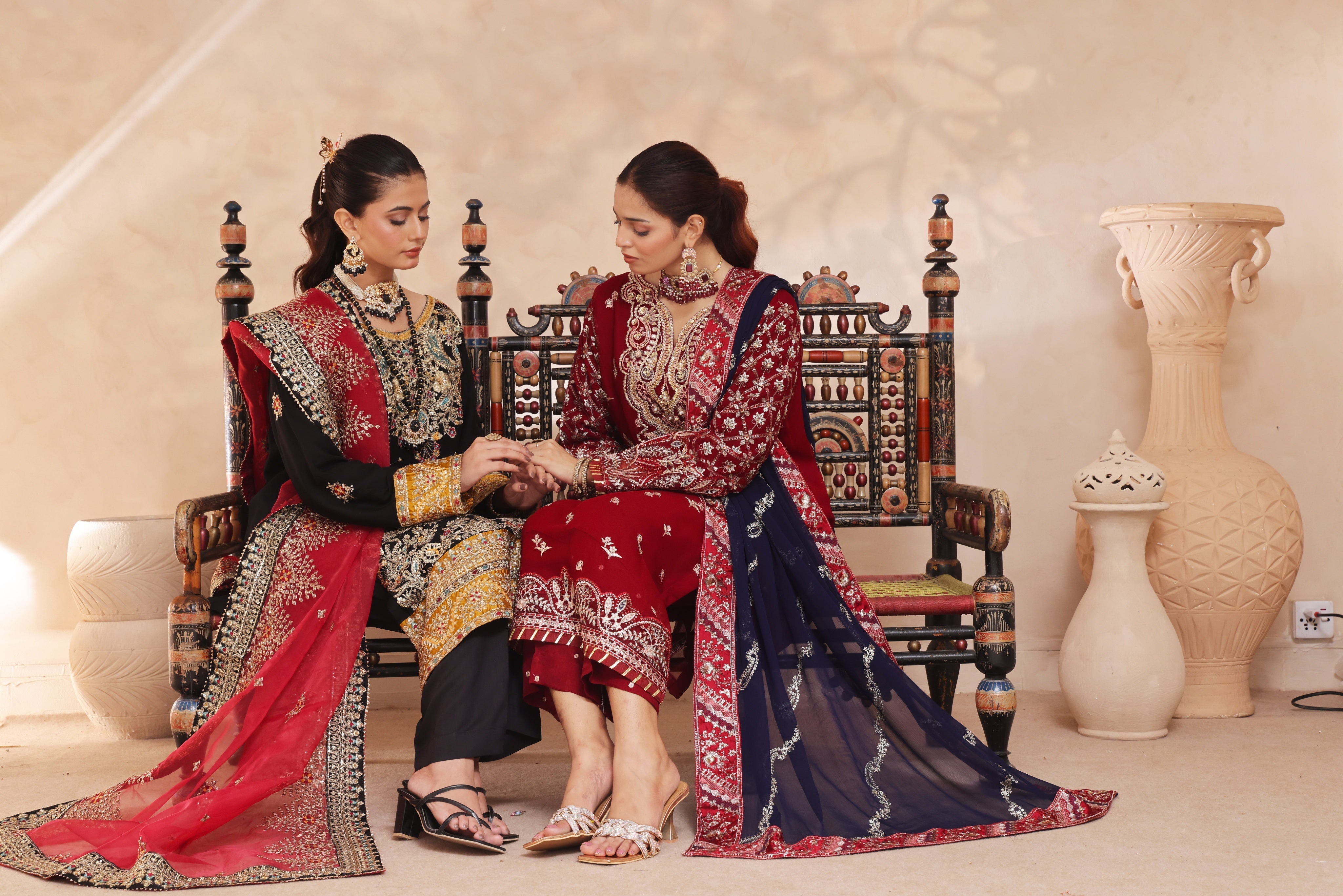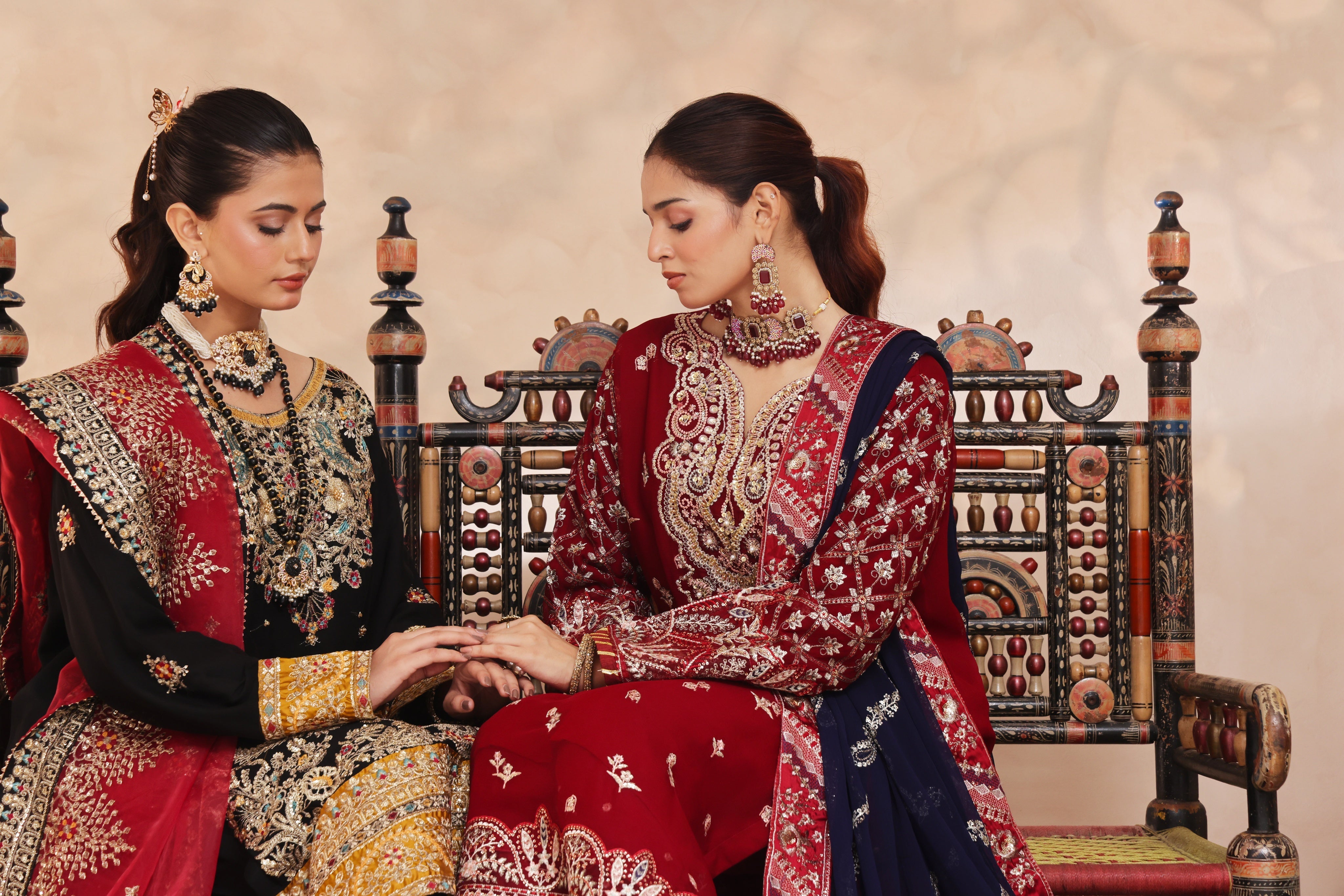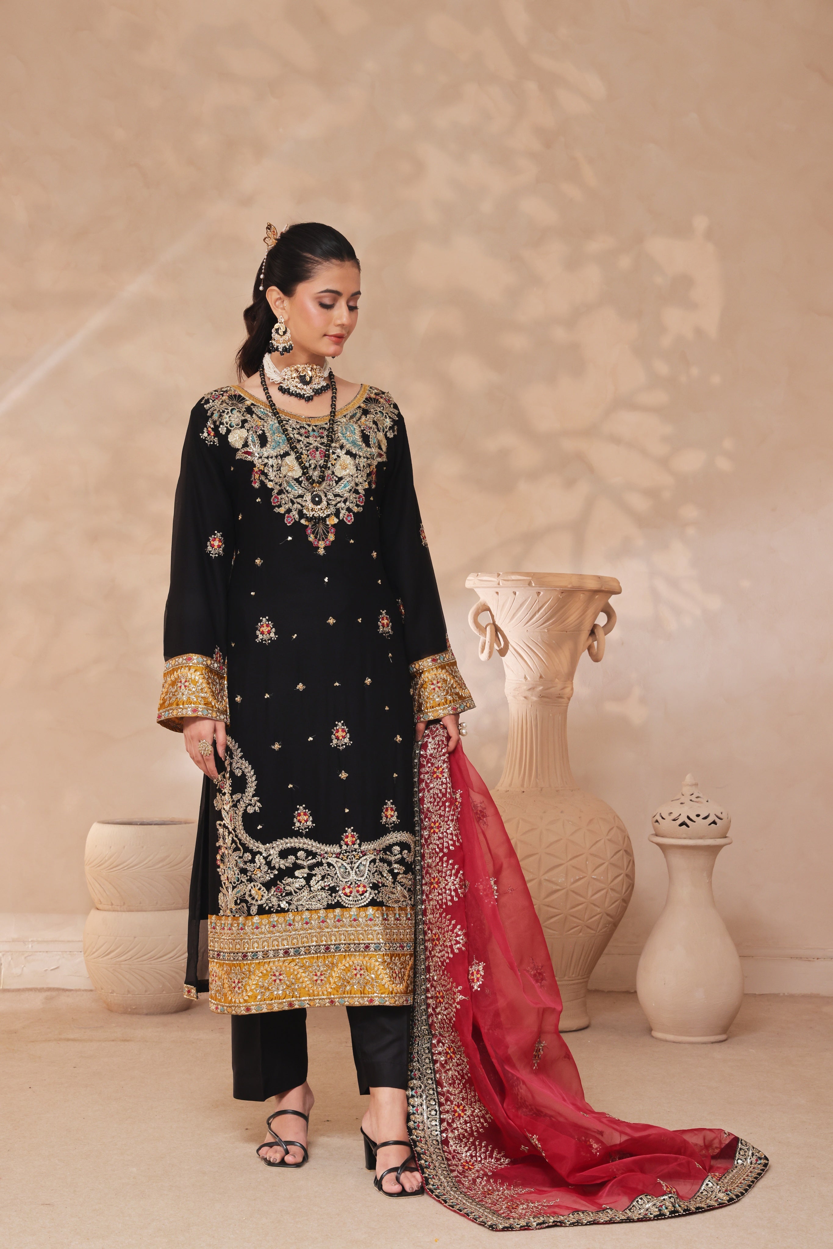 Woman in traditional embroidered black and gold embroidered outfit with red dupatta
