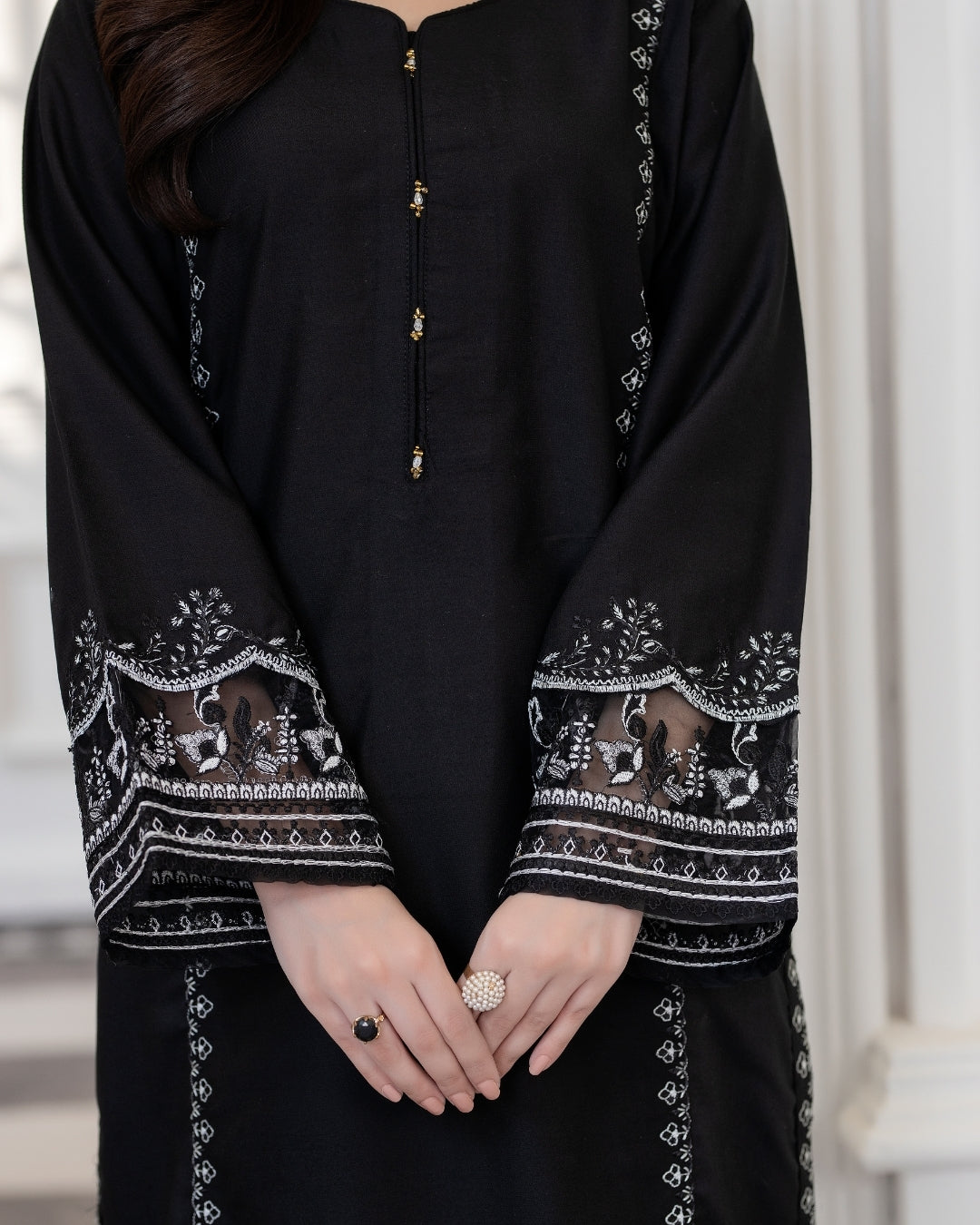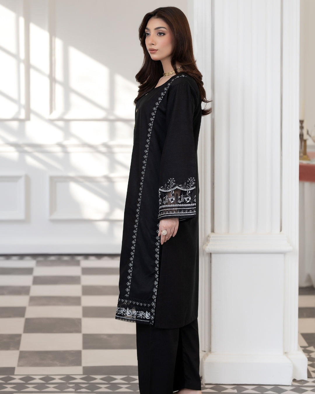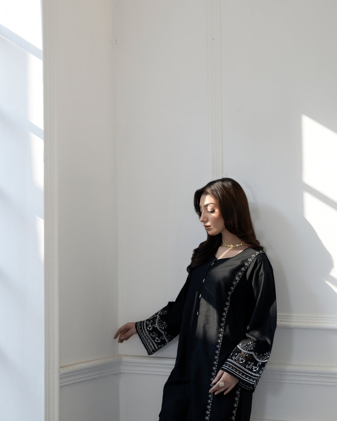 This exquisite Daily/Basic Wear Kurta Set is a winter wardrobe essential. The Straight Cut Kurta in luxurious Cotton Satin features intricate embroidered detailing. Paired with a classic Straight Trouser in comfortable Cotton fabric, this 2-piece set in sleek Black exudes elegance. Elevate your everyday style with this wardrobe staple from Flutterby.