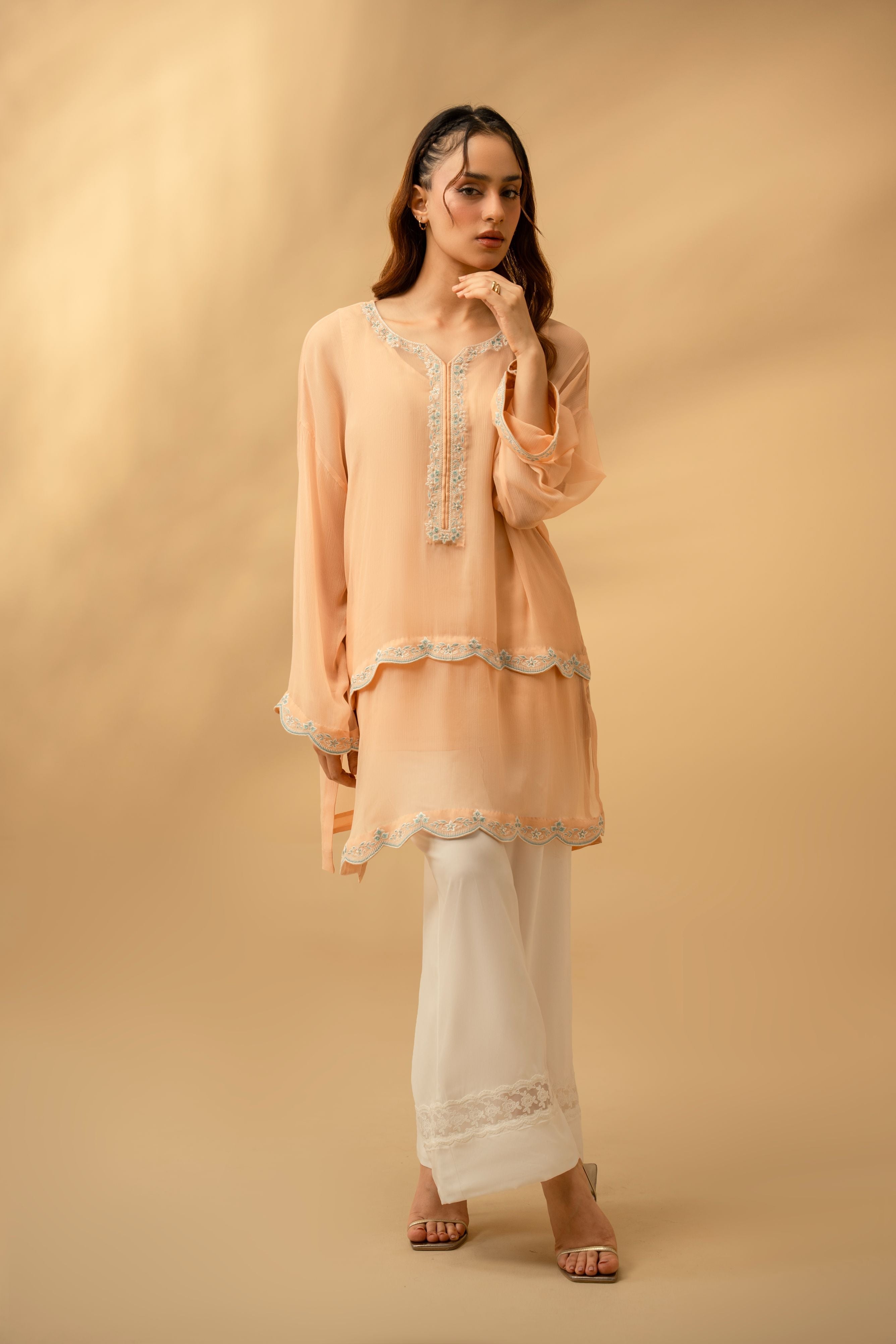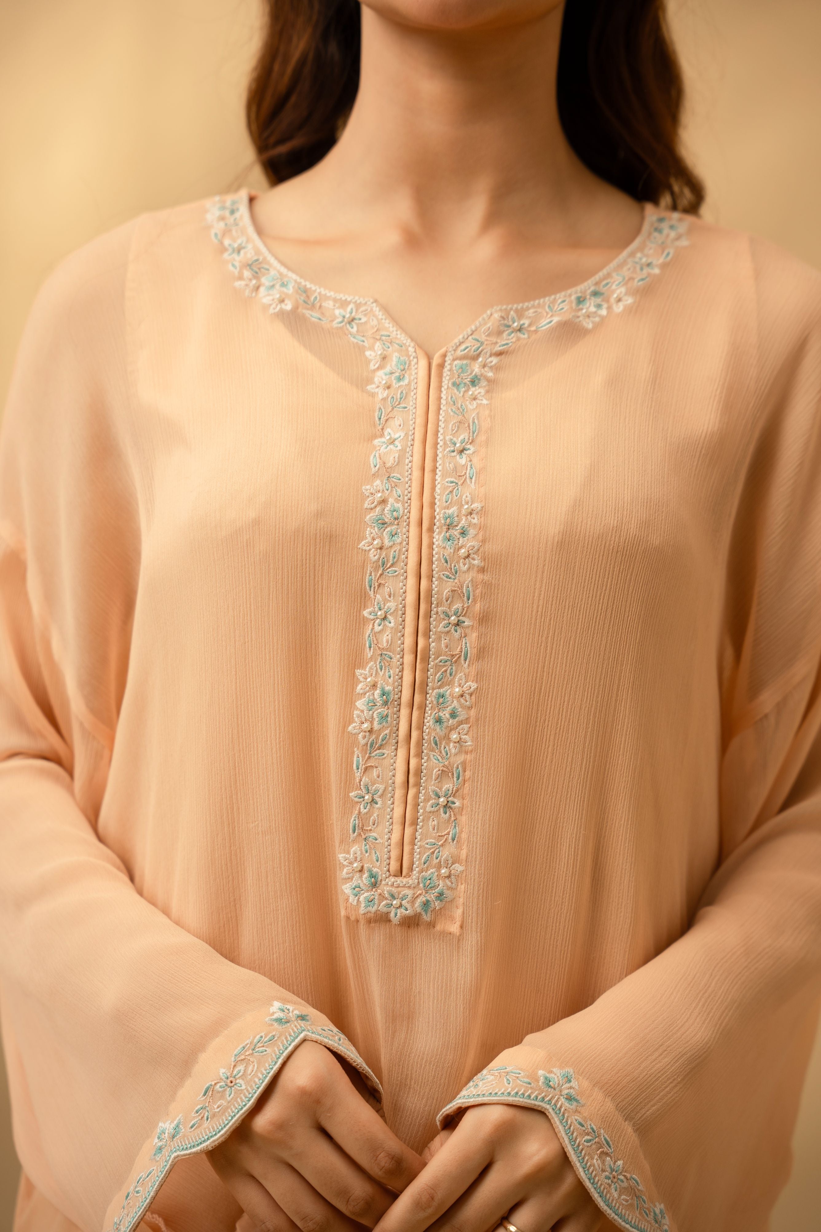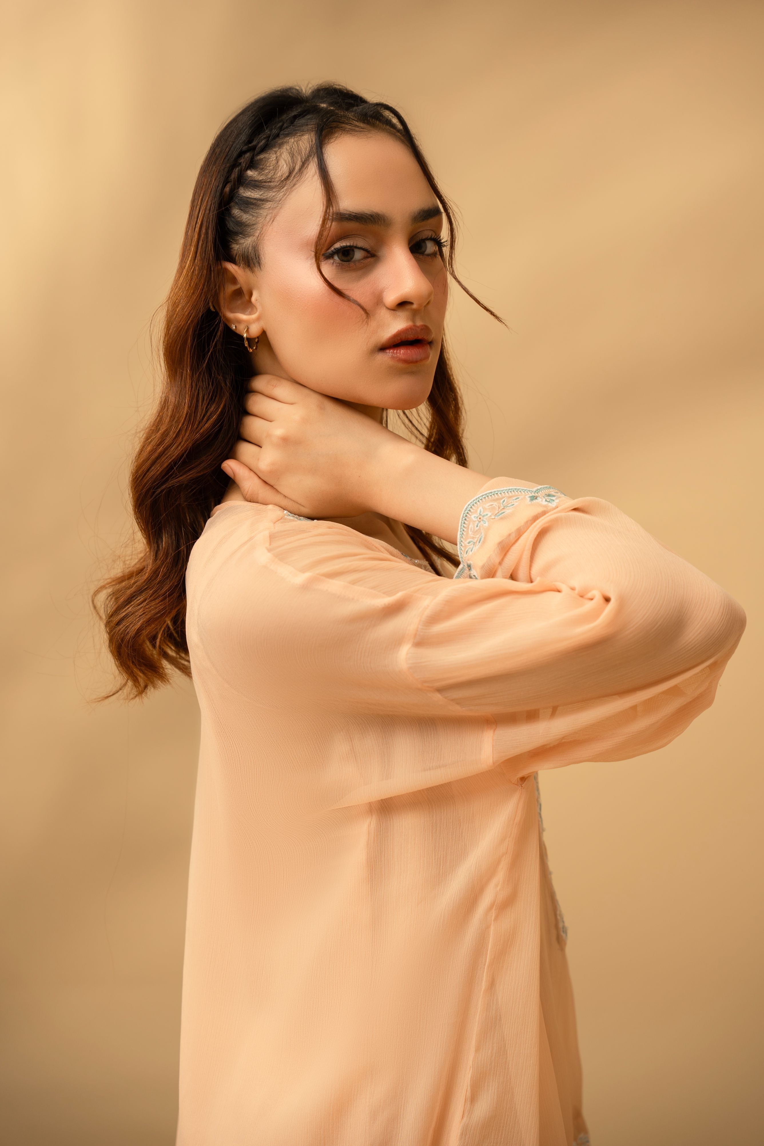 Gossamer is a masterclass in weightless sophistication, designed for the woman who finds luxury in the finest details. This peach-toned ensemble is not merely a garment but an intentional architecture for the self-crafted for delightful gatherings where elegance is felt through every movement. It stands as a tribute to stillness, where soft hues meet the intricate precision of neo-traditional artistry.
