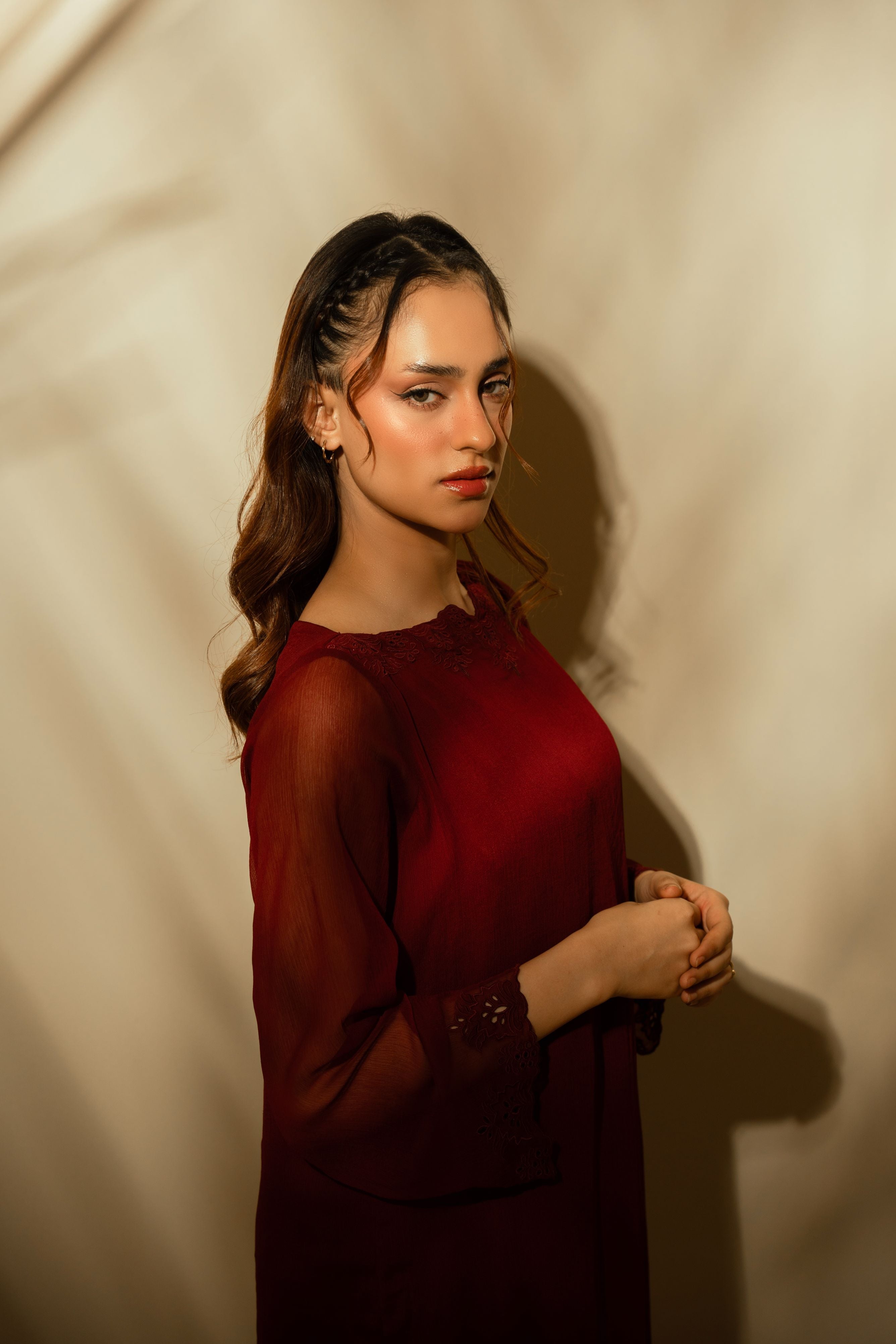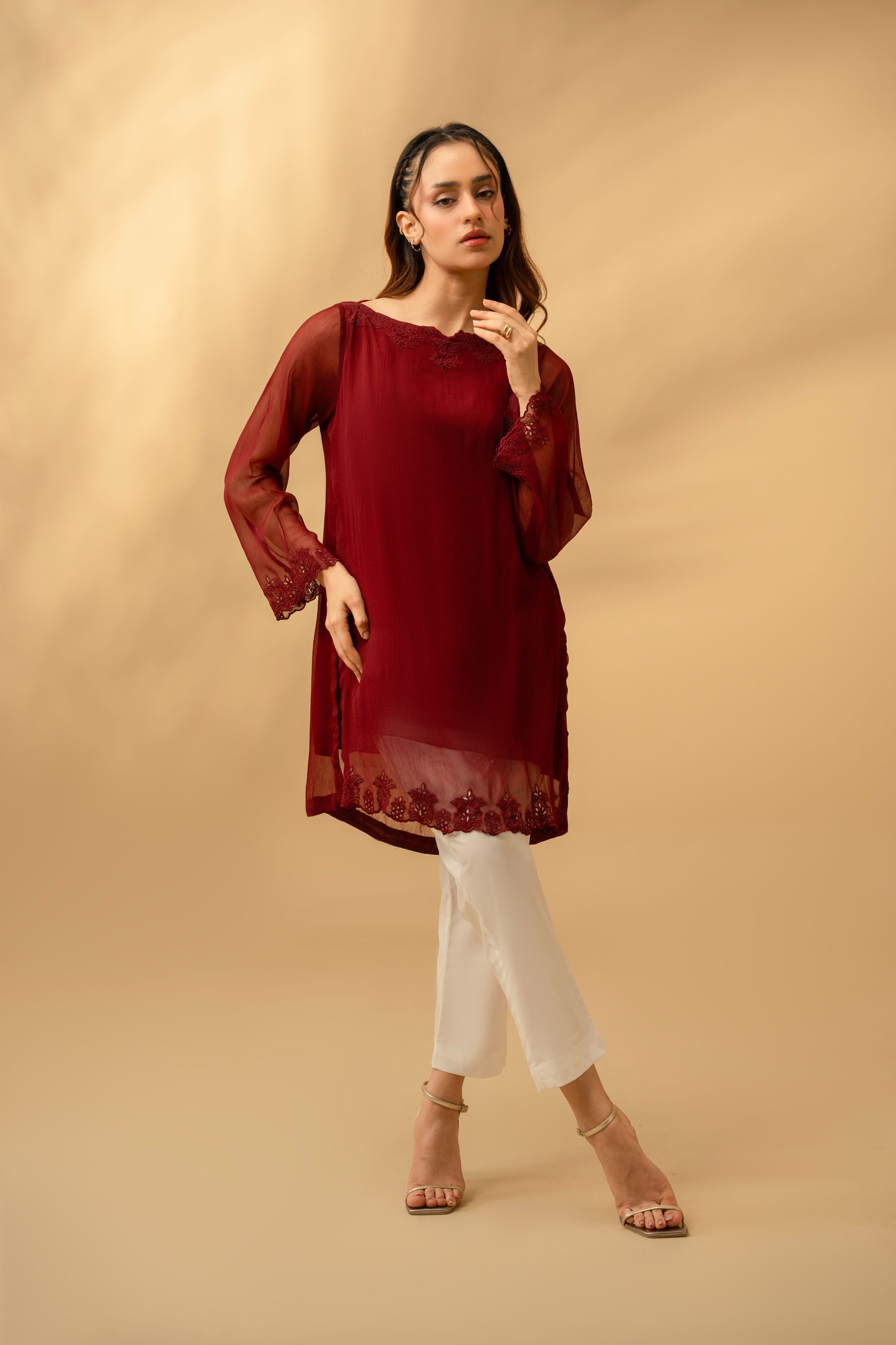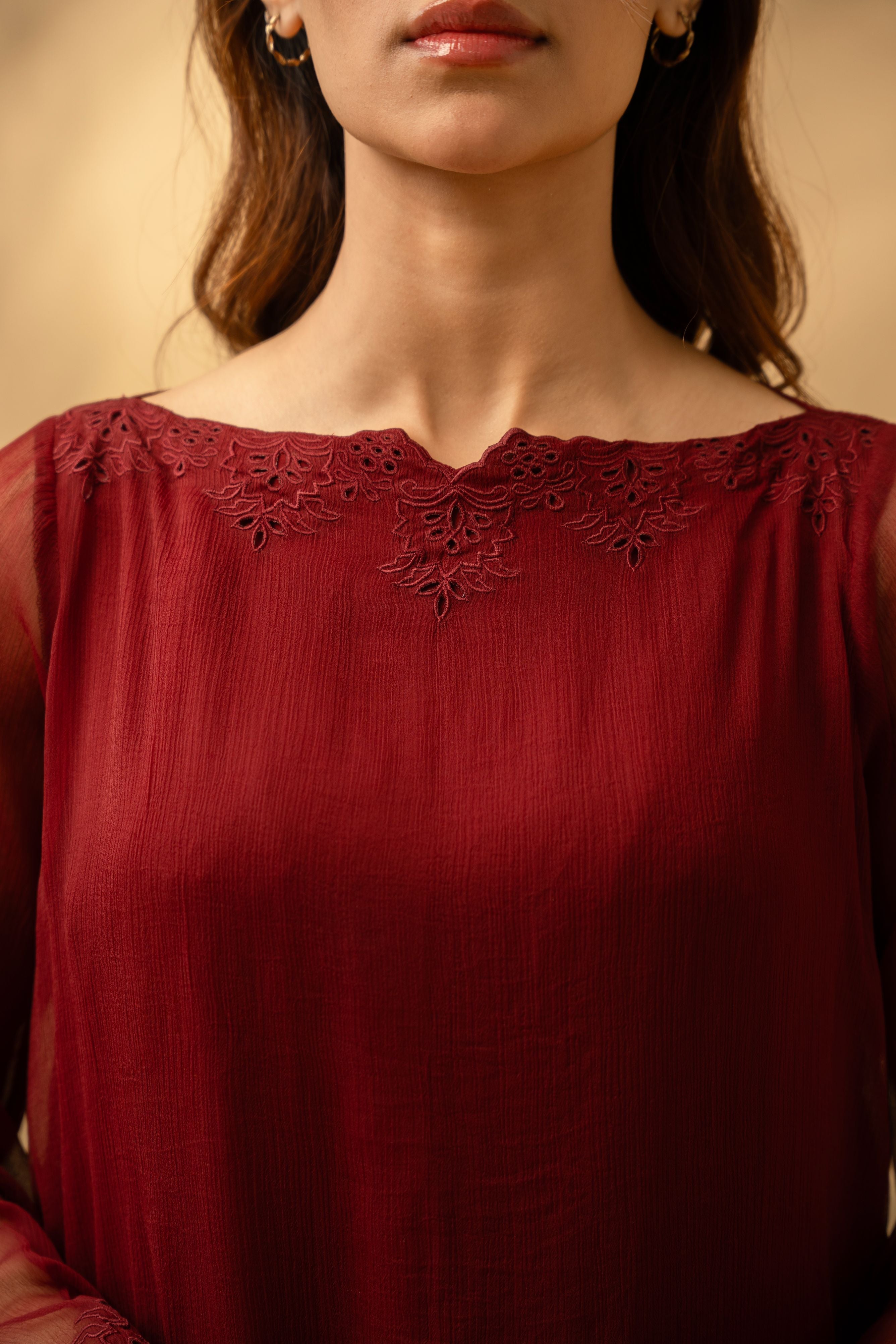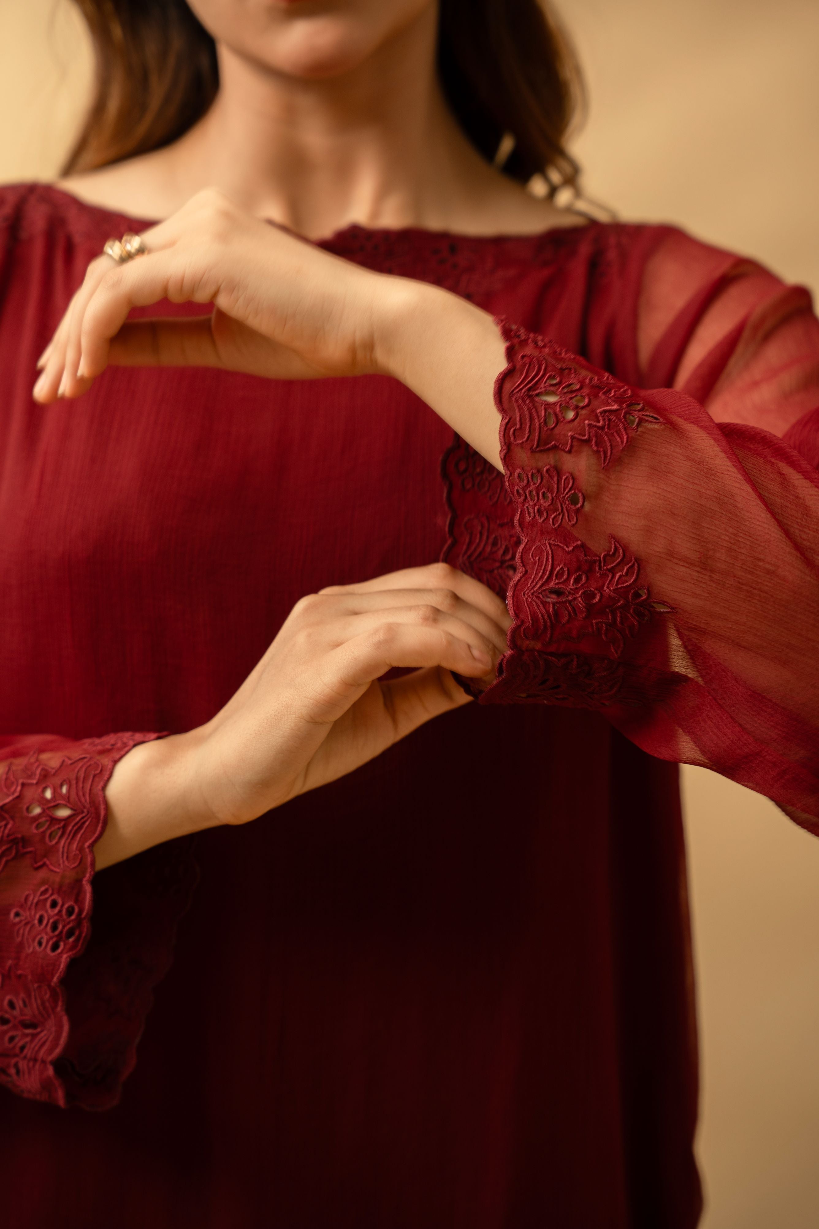 Crafted from a premium georgette-crepe blend, the fabric is breathable, soft to the touch, and fluid in movement, allowing the silhouette to fall with natural grace. Delicate fine-needle embroidery in soft teal and ivory is thoughtfully placed along the neckline and cuffs, subtly framing the face while adding depth without excess.