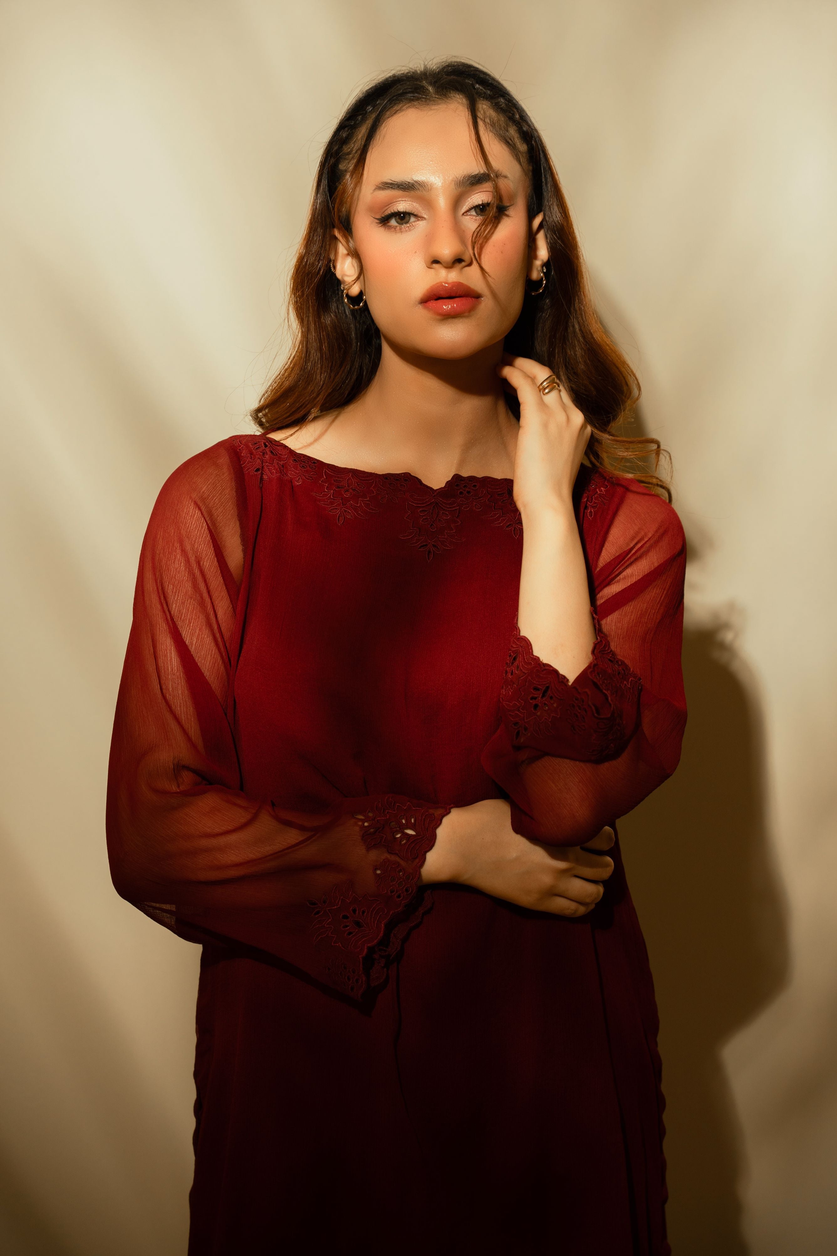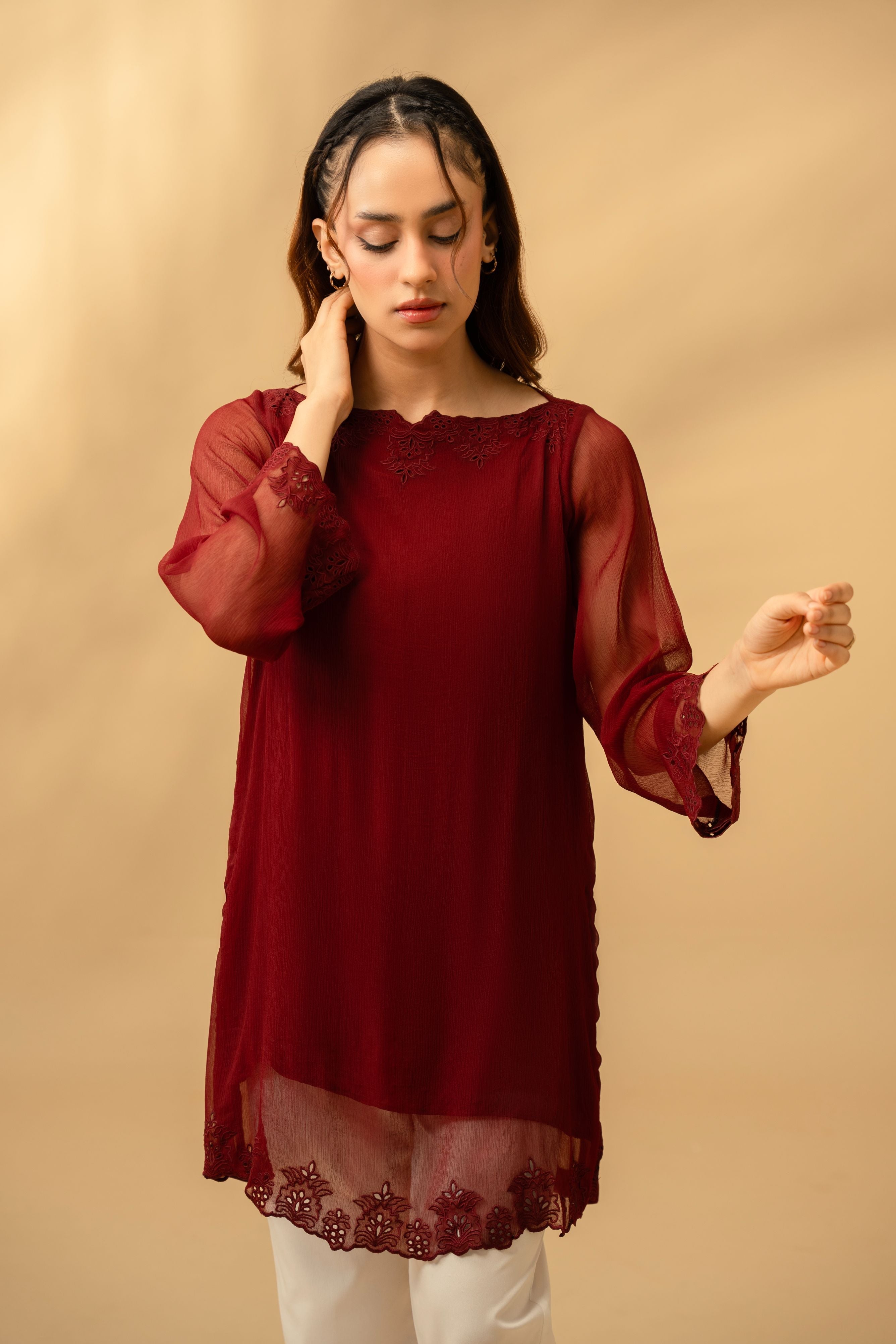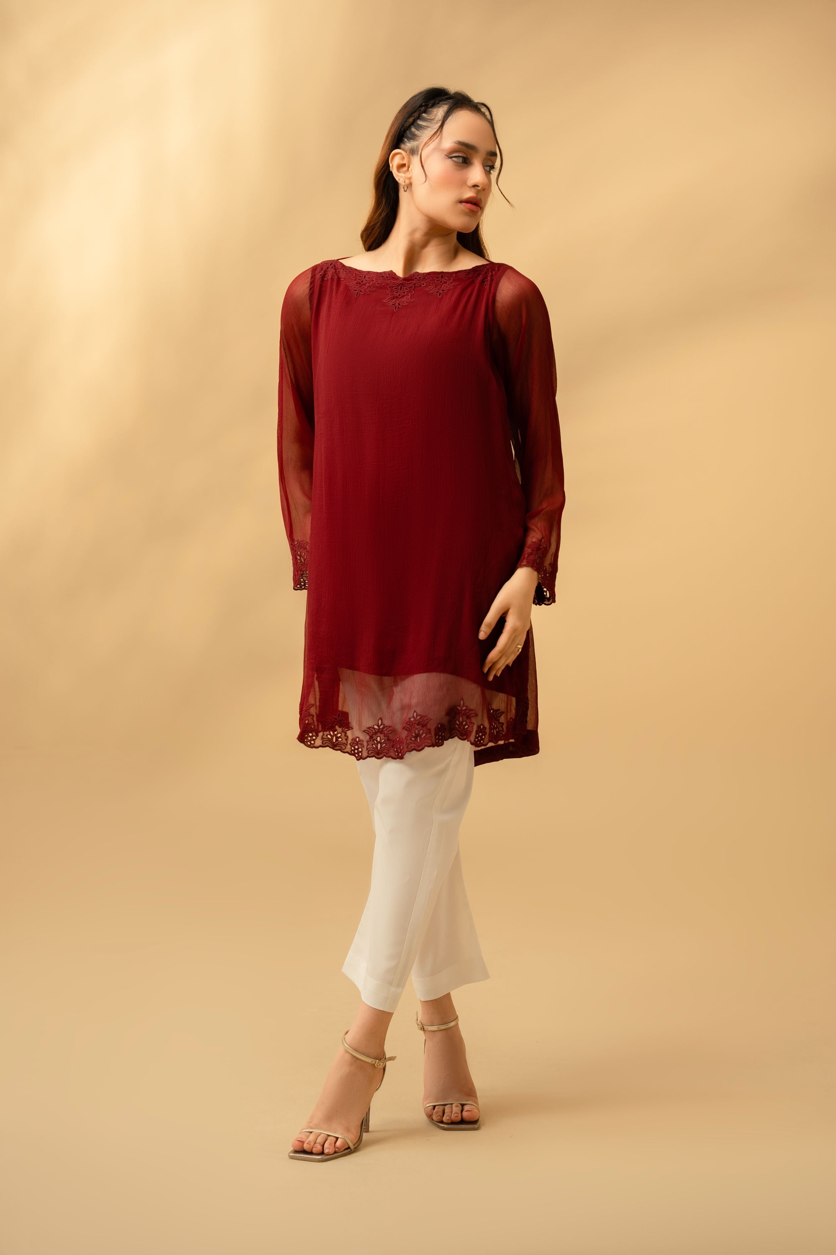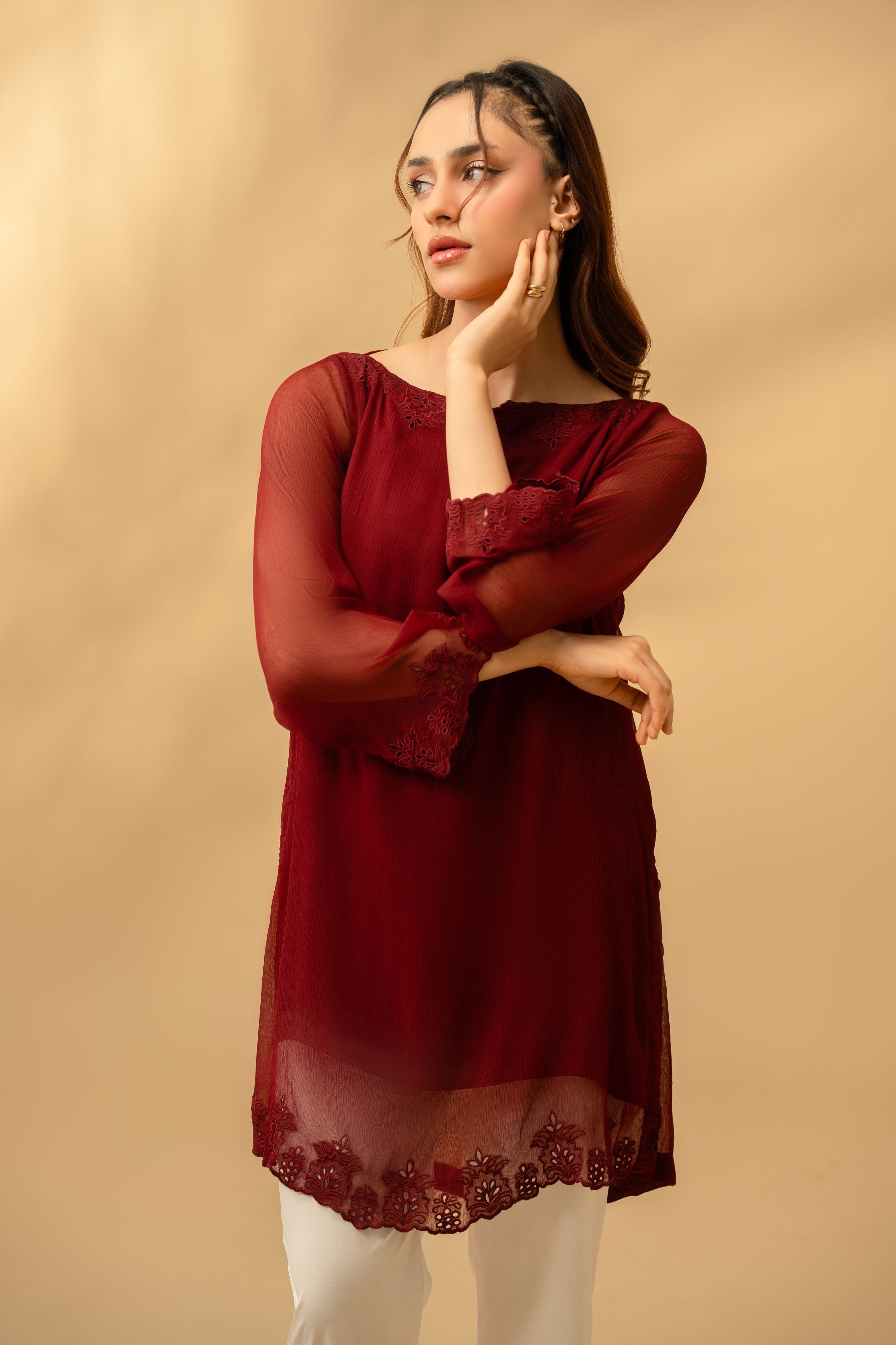 Crafted from a premium georgette-crepe blend, the fabric is breathable, soft to the touch, and fluid in movement, allowing the silhouette to fall with natural grace. Delicate fine-needle embroidery in soft teal and ivory is thoughtfully placed along the neckline and cuffs, subtly framing the face while adding depth without excess.