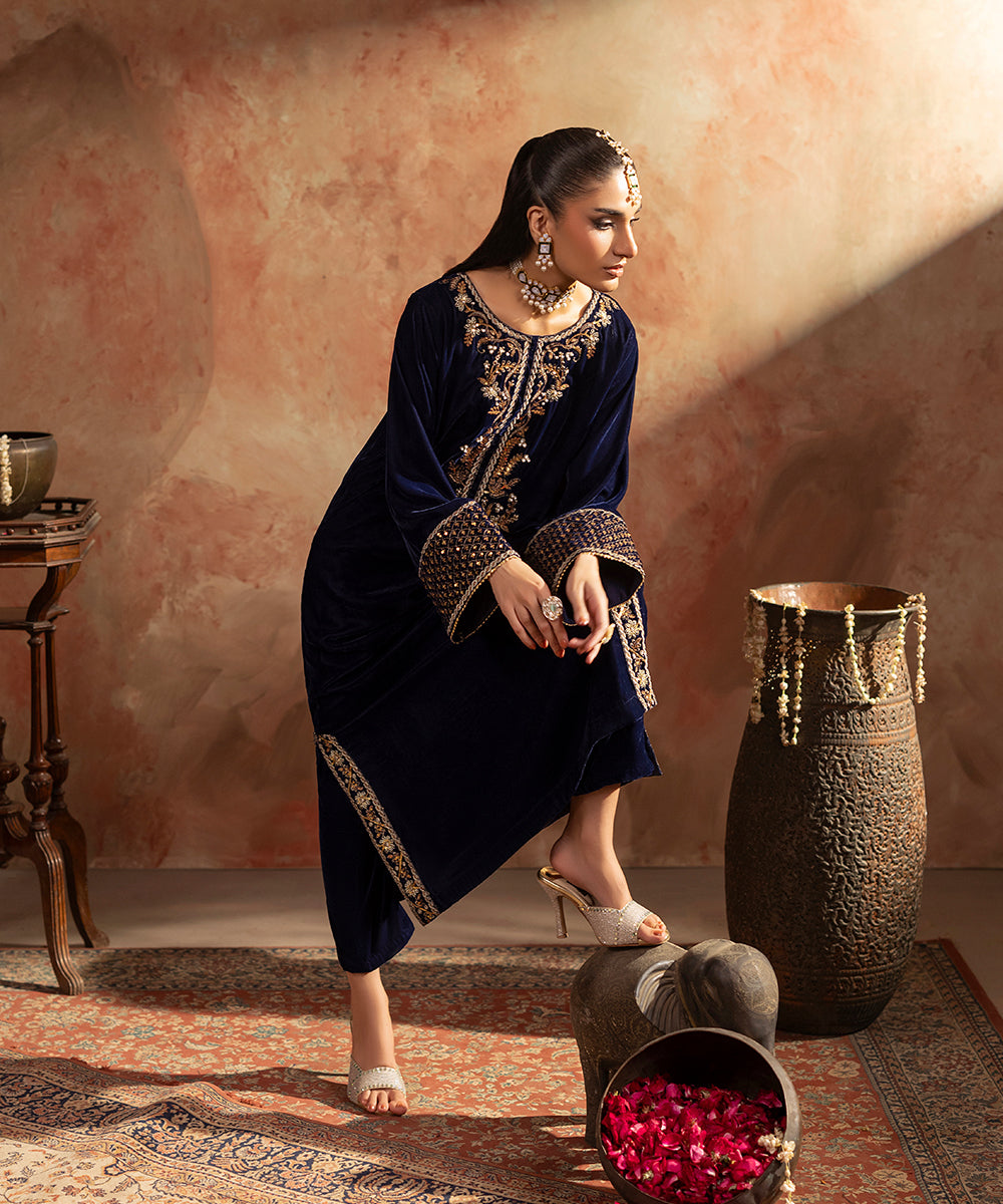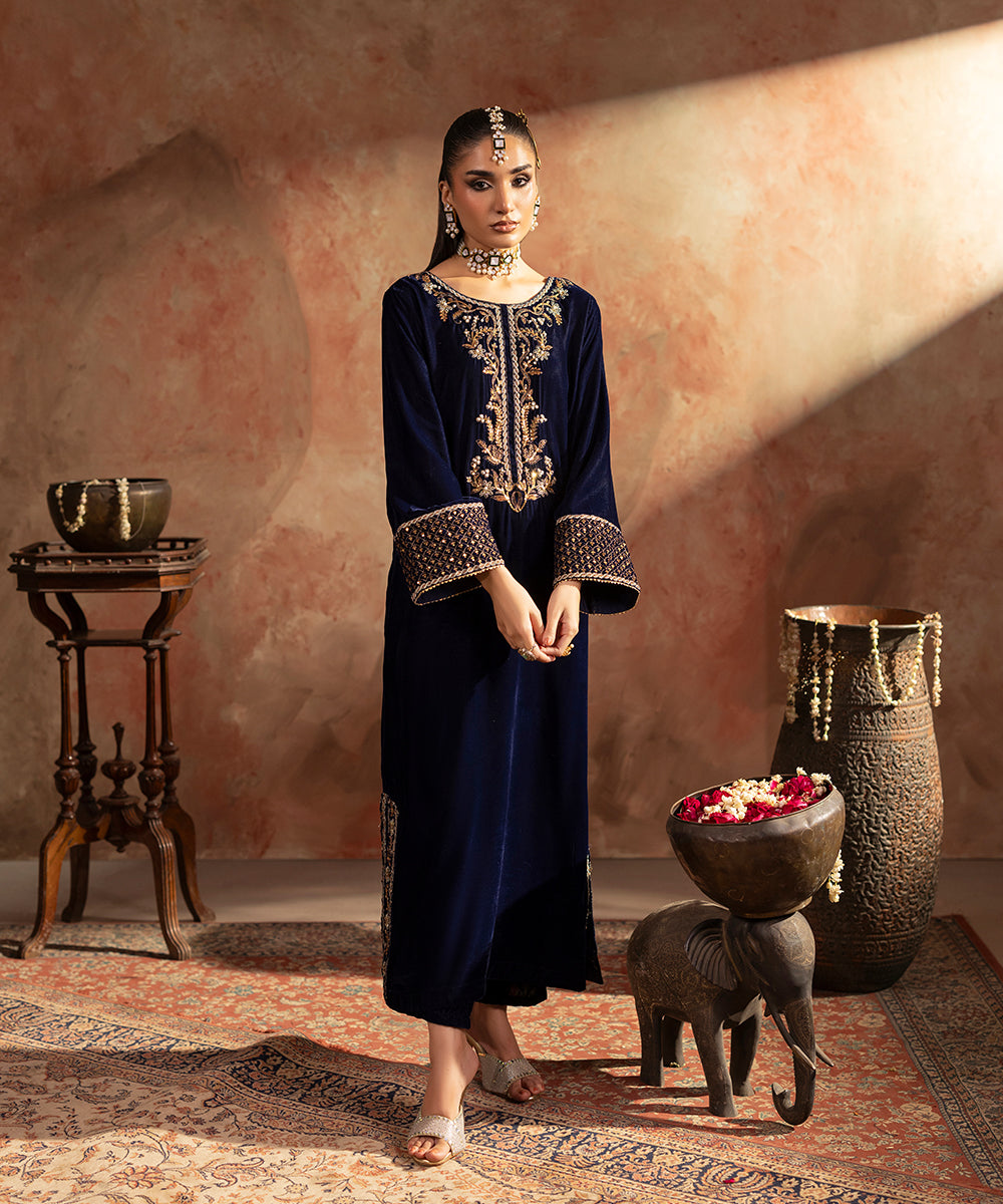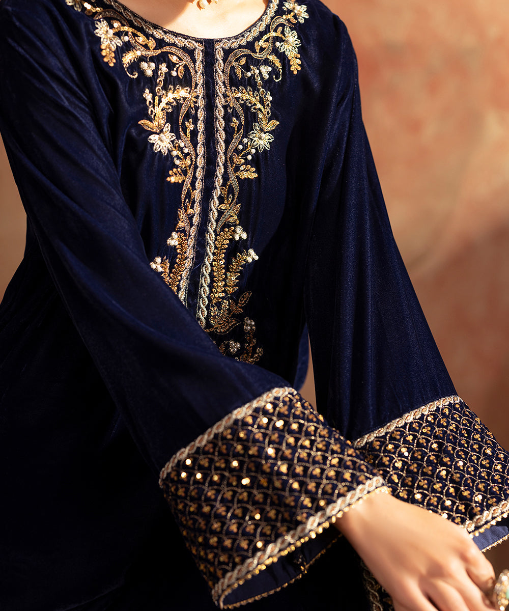 Description: One piece velvet article in a deep navy blue shade, featuring exquisite antique gold and bronze embroidery. The neckline is richly adorned with intricate floral motifs and delicate bead accents that extend gracefully down the front. The wide sleeves showcase heavily embroidered geometric patterns with ornate cuffs, adding a statement touch. Side borders are detailed with matching embroidery, completing the luxurious look.