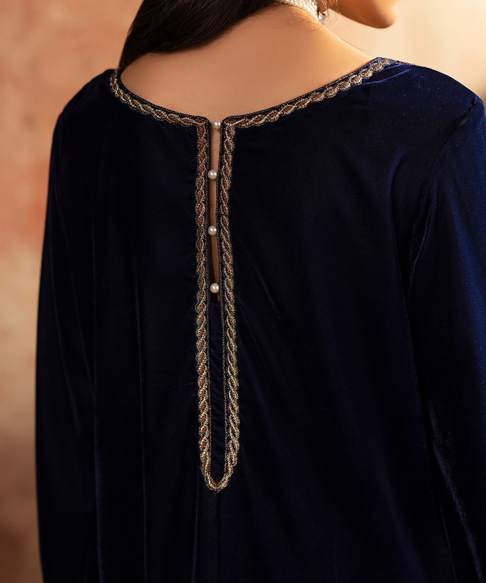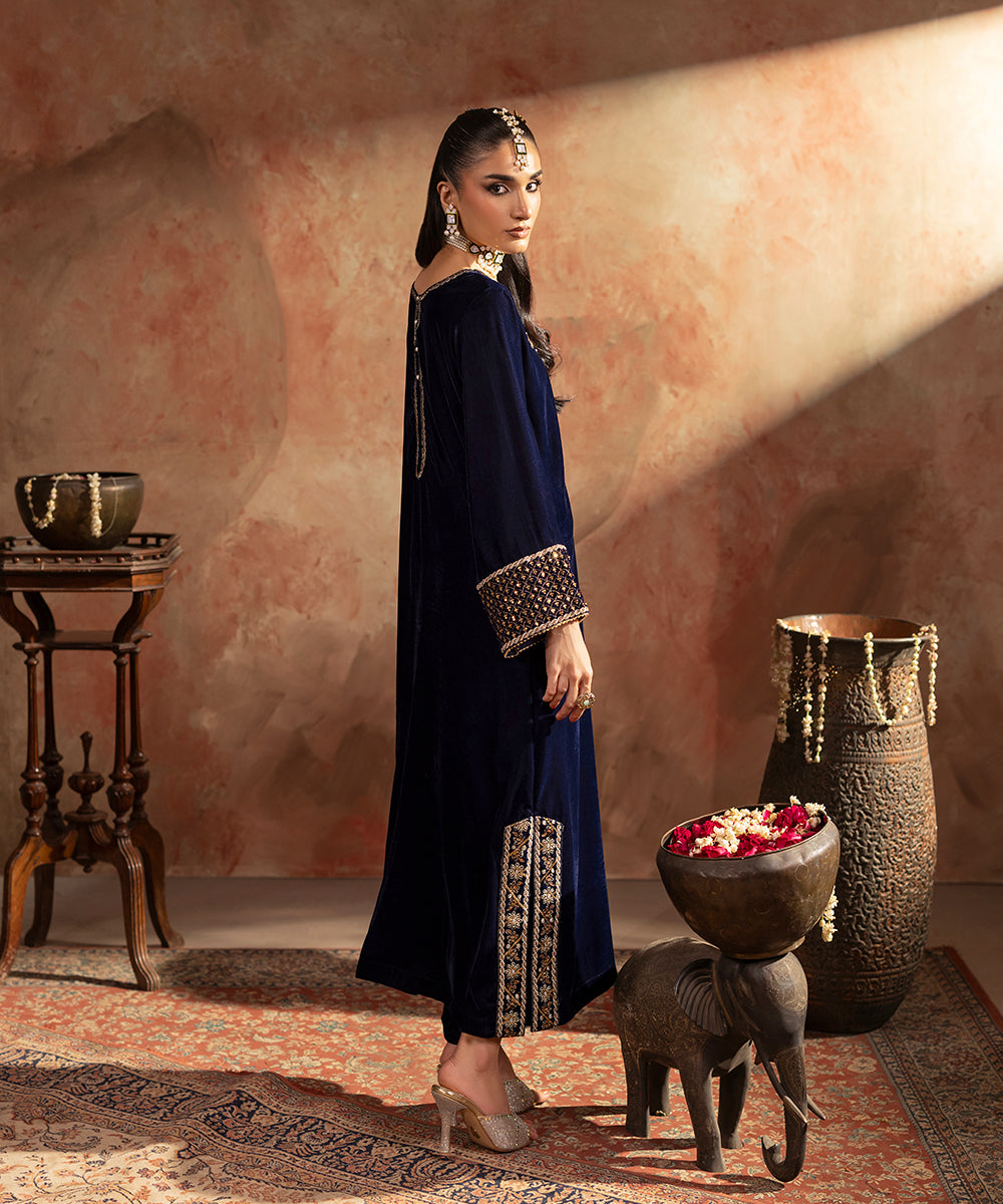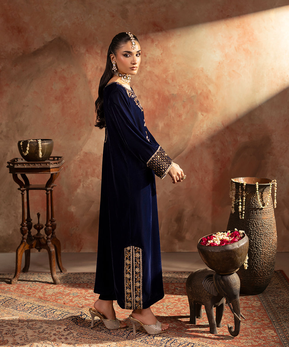 Description: One piece velvet article in a deep navy blue shade, featuring exquisite antique gold and bronze embroidery. The neckline is richly adorned with intricate floral motifs and delicate bead accents that extend gracefully down the front. The wide sleeves showcase heavily embroidered geometric patterns with ornate cuffs, adding a statement touch. Side borders are detailed with matching embroidery, completing the luxurious look.