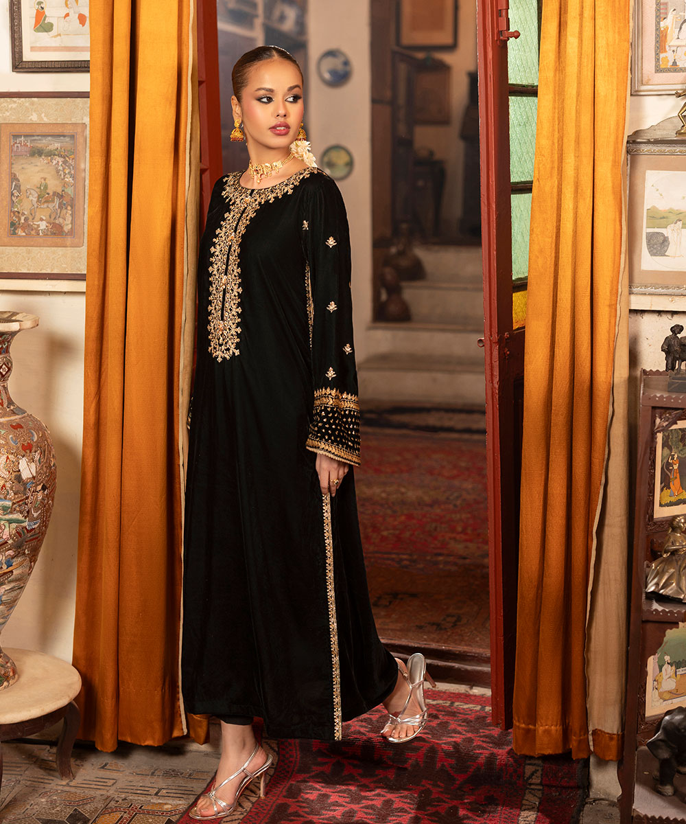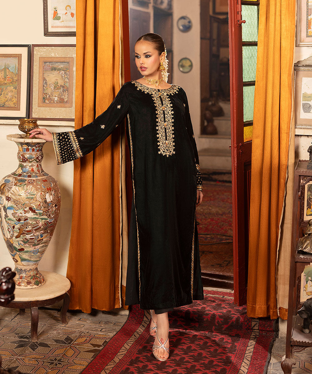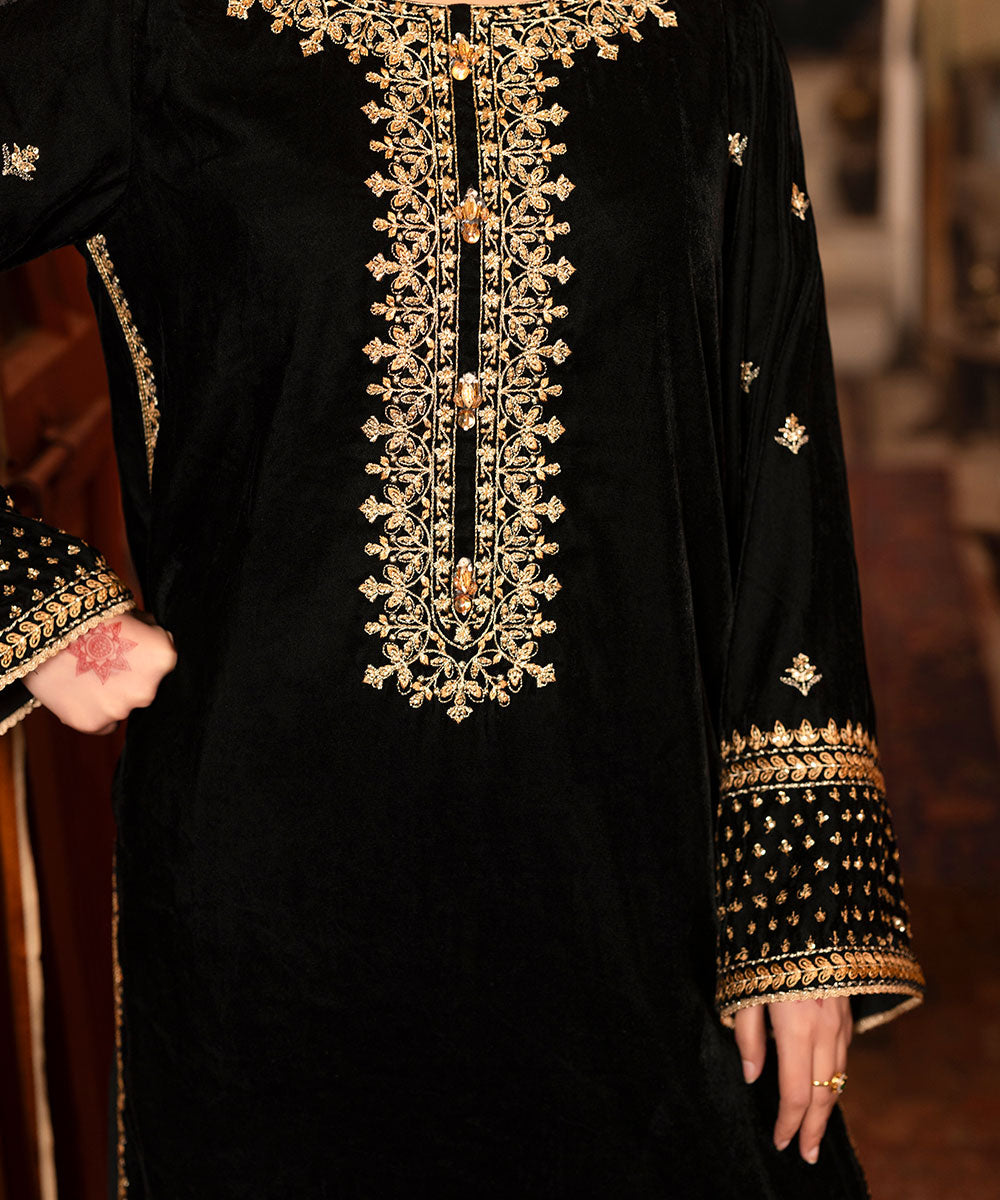 Description: This one-piece velvet shirt in a rich black hue showcases exquisite craftsmanship. It features intricate tilla and sequin embroidery along the front, complemented by delicate ada work buttons, adding a touch of artisanal charm. The loose sleeves are elevated with heavily embellished sequin borders, making it a perfect statement piece for festive and formal occasions.
