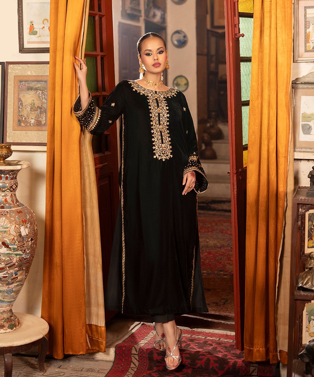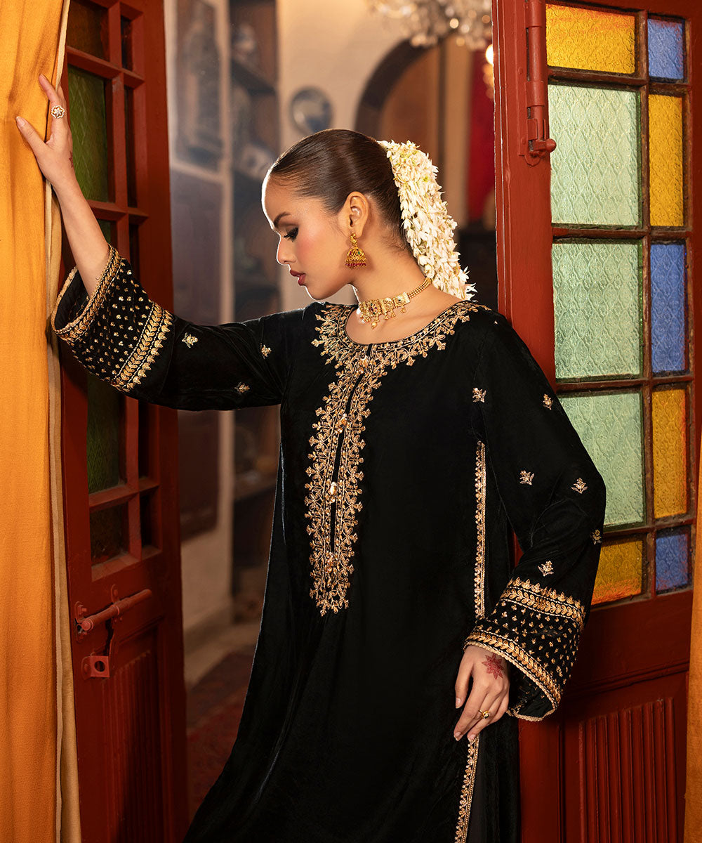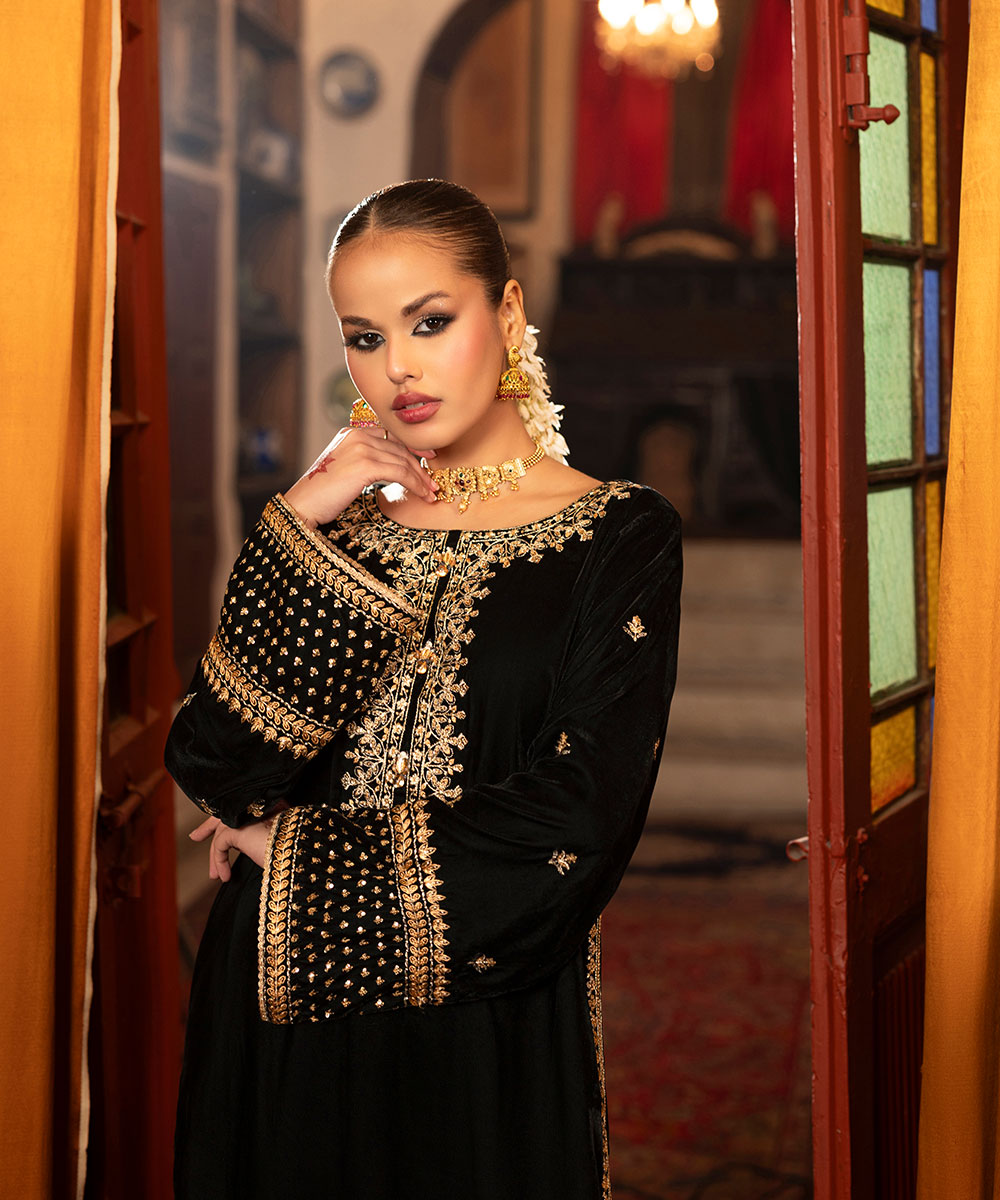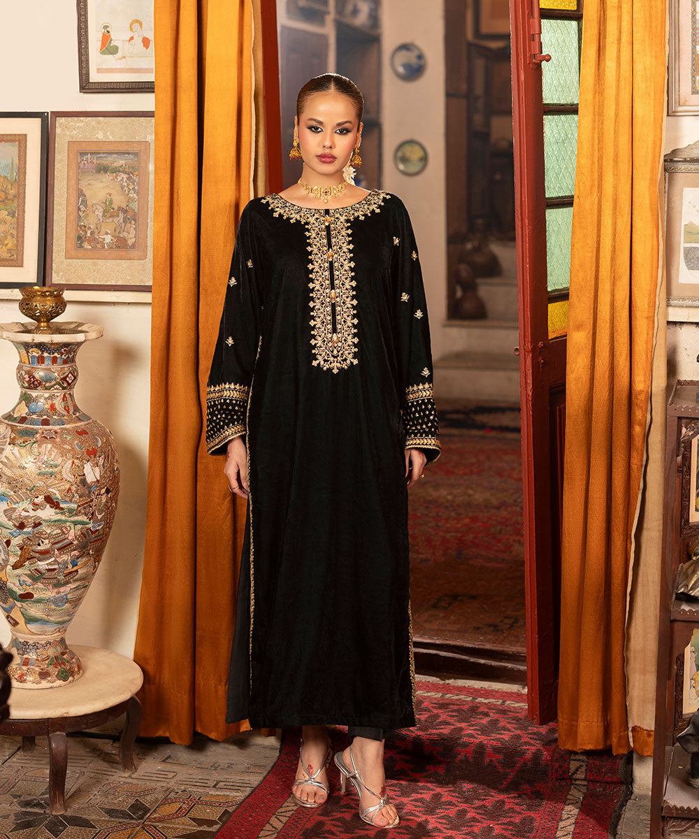 Description: This one-piece velvet shirt in a rich black hue showcases exquisite craftsmanship. It features intricate tilla and sequin embroidery along the front, complemented by delicate ada work buttons, adding a touch of artisanal charm. The loose sleeves are elevated with heavily embellished sequin borders, making it a perfect statement piece for festive and formal occasions.