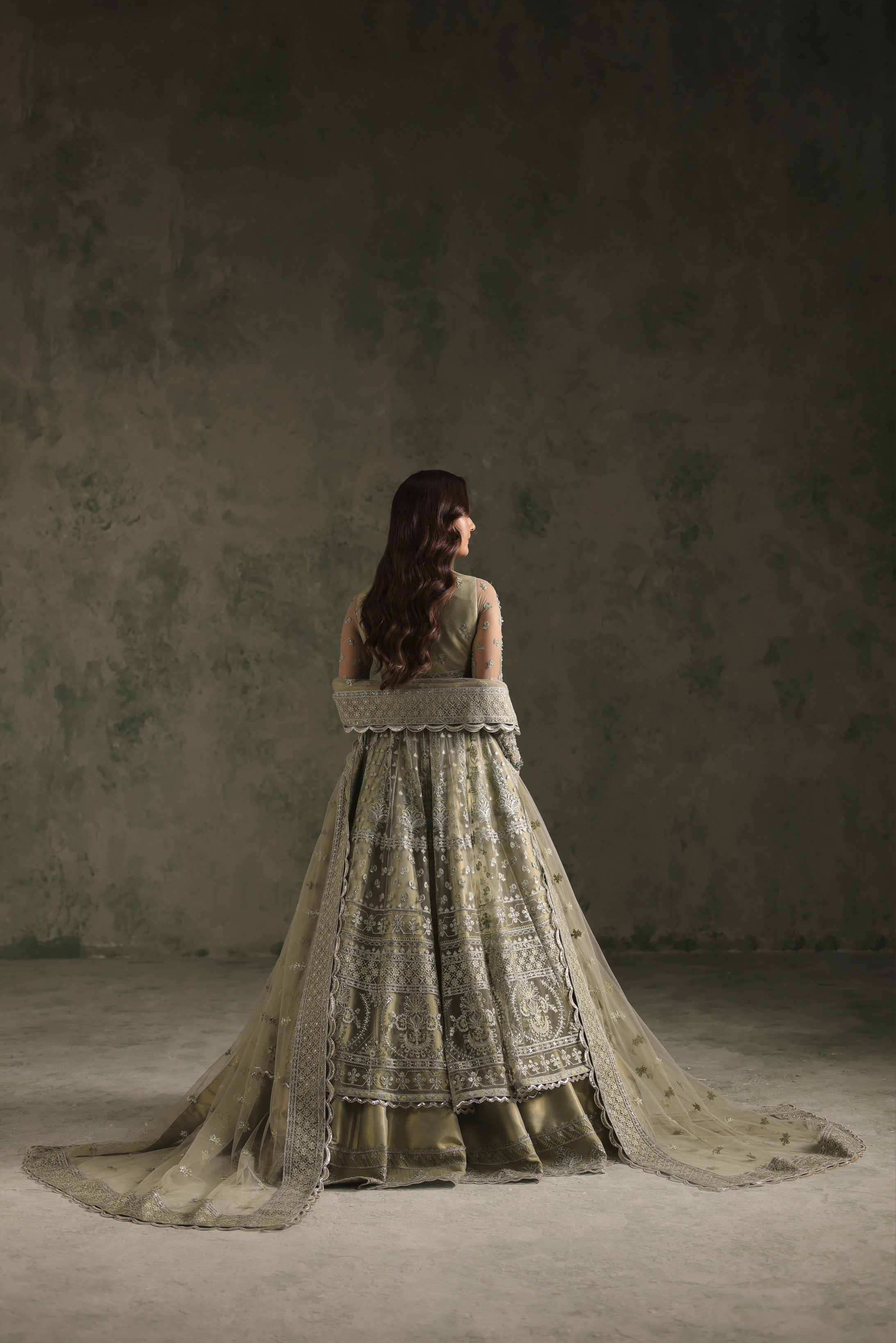 The bodice is crafted from embroidered net with hand-embellished detailing at the front, balanced by a simple back. Embroidered net sleeves add subtle shimmer, while 18 peshwas panels create a graceful, voluminous silhouette. A 2.75-yard embroidered net dupatta frame the look with elegance. The base features 8 yards of shabnam tissue with lining, ensuring both luxury and comfort.