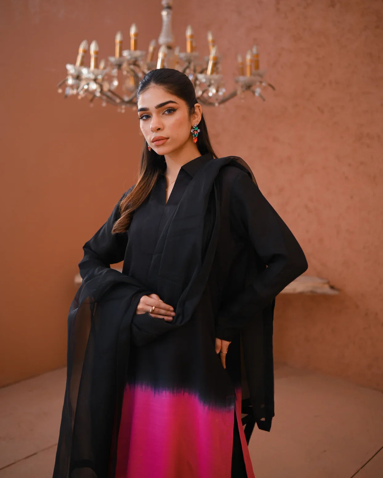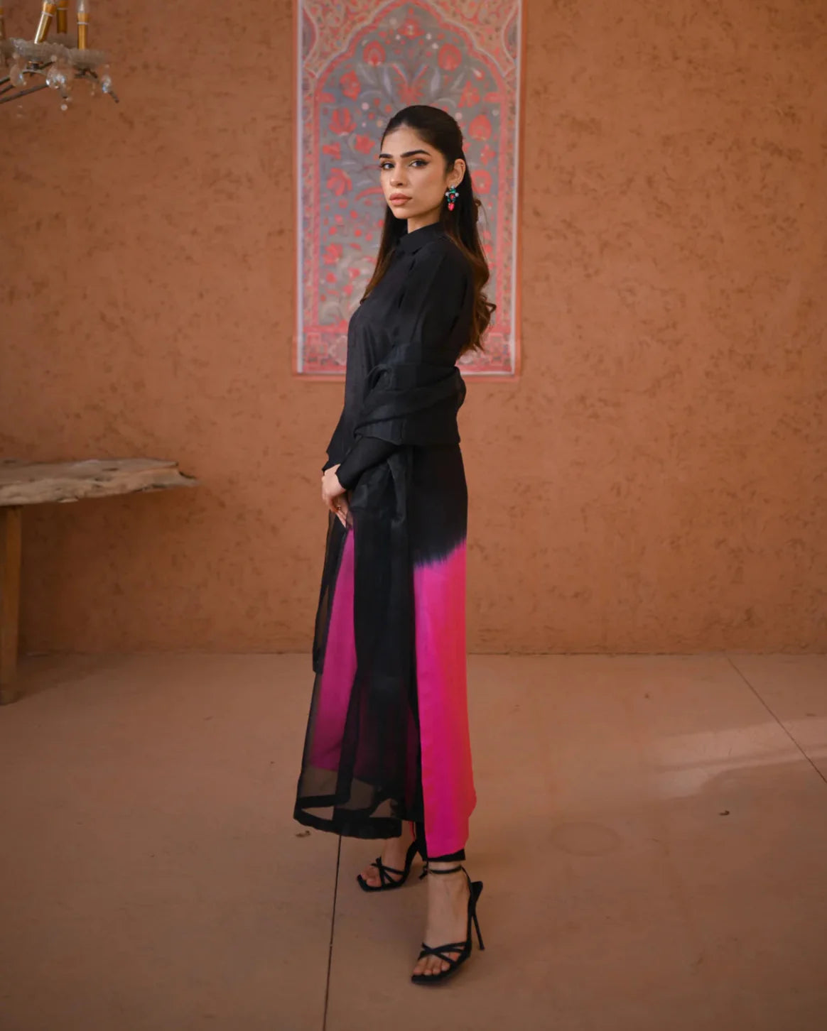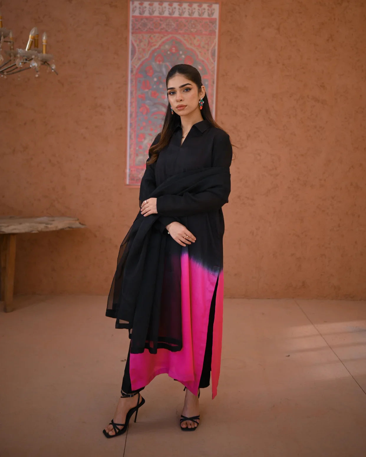 It’s a three piece dress includes a long ombre shirt and trouser along with organza dupatta.