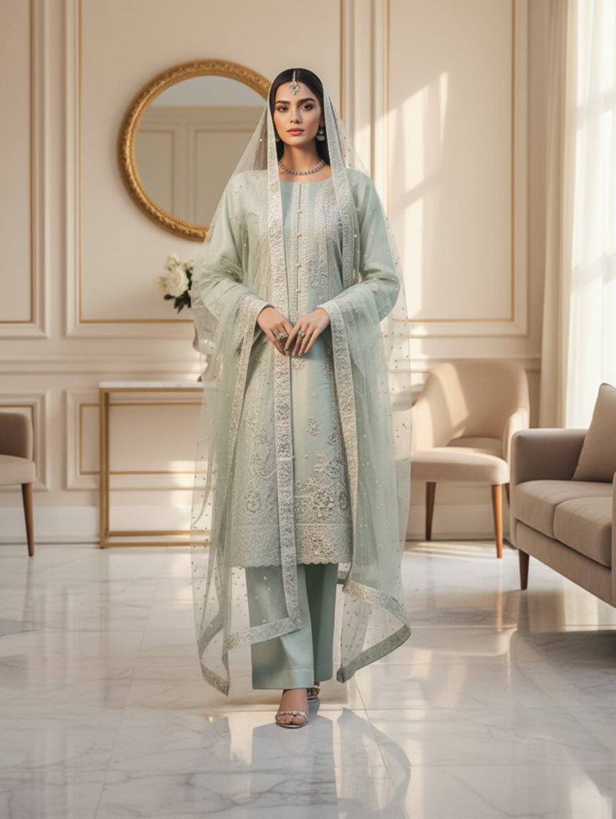 The set includes a fancy heavy embroidered Lava Silk shirt enriched with hand embellishments, a luxury embroidered Chamak Net fancy dupatta that adds graceful texture, and an unstitched raw silk trouser for a polished and premium finish.
