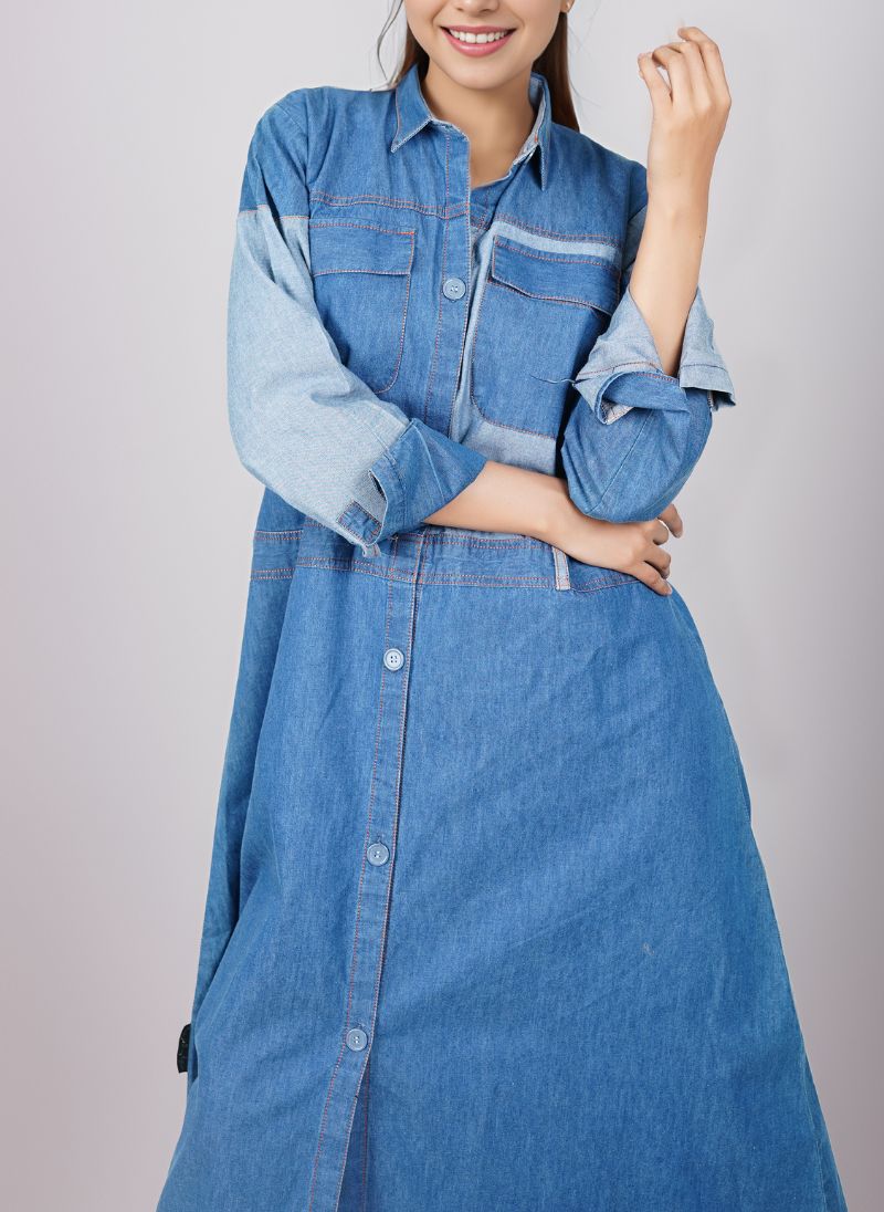 This front open denim abaya features a stylish Barrymore collar and long sleeves, making it a versatile addition to any wardrobe. The design includes flap pockets at the chest for practicality, while contrast denim accents on the left chest panel and both sleeves add a contemporary touch. The cuff of the left sleeve is also highlighted with contrast denim, enhancing the overall aesthetic of this chic and functional piece.