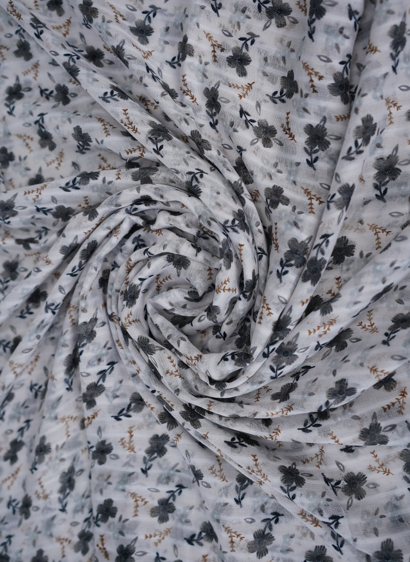 Elevate your style with this charming floral fabric! Featuring a delicate pattern of dark gray flowers and brown accents on a light gray background, this fabric is perfect for adding a touch of elegance to your projects.