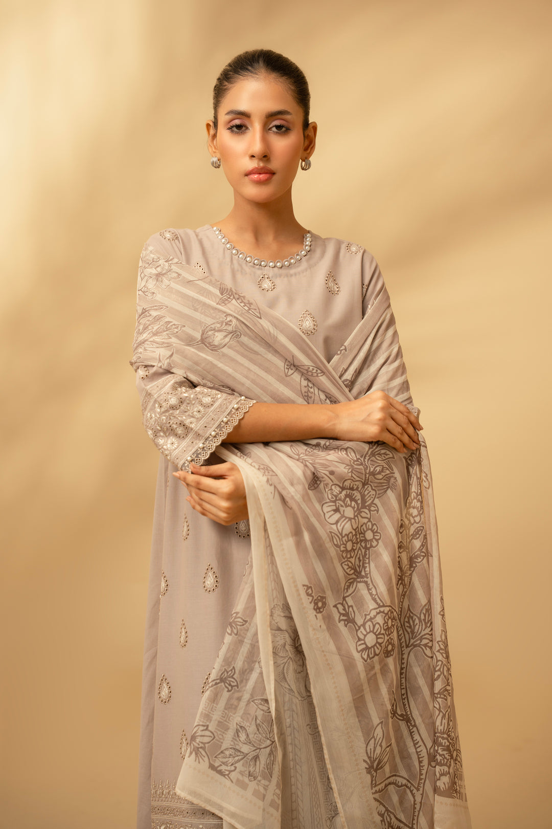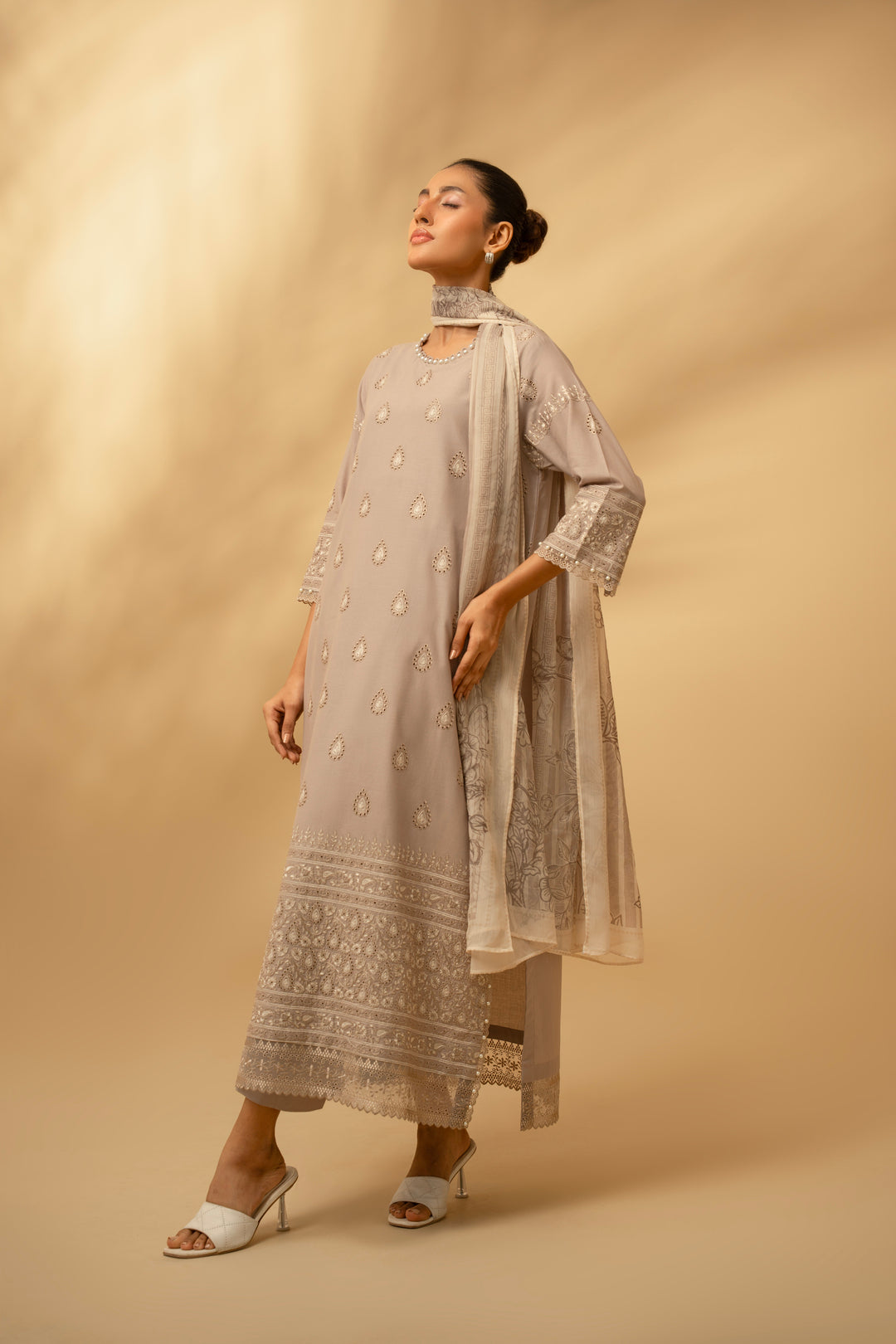 Experience timeless elegance with the Frosted Silver 3-piece Chicken Kari Lawn Suit. Crafted for comfort and style, this suit blends intricate embroidery with lightweight lawn fabric, perfect for warm days. Its sophisticated design enhances your look effortlessly, making it ideal for both casual gatherings and special occasions. Enjoy breathable fabric paired with detailed craftsmanship for a graceful and confident appearance.