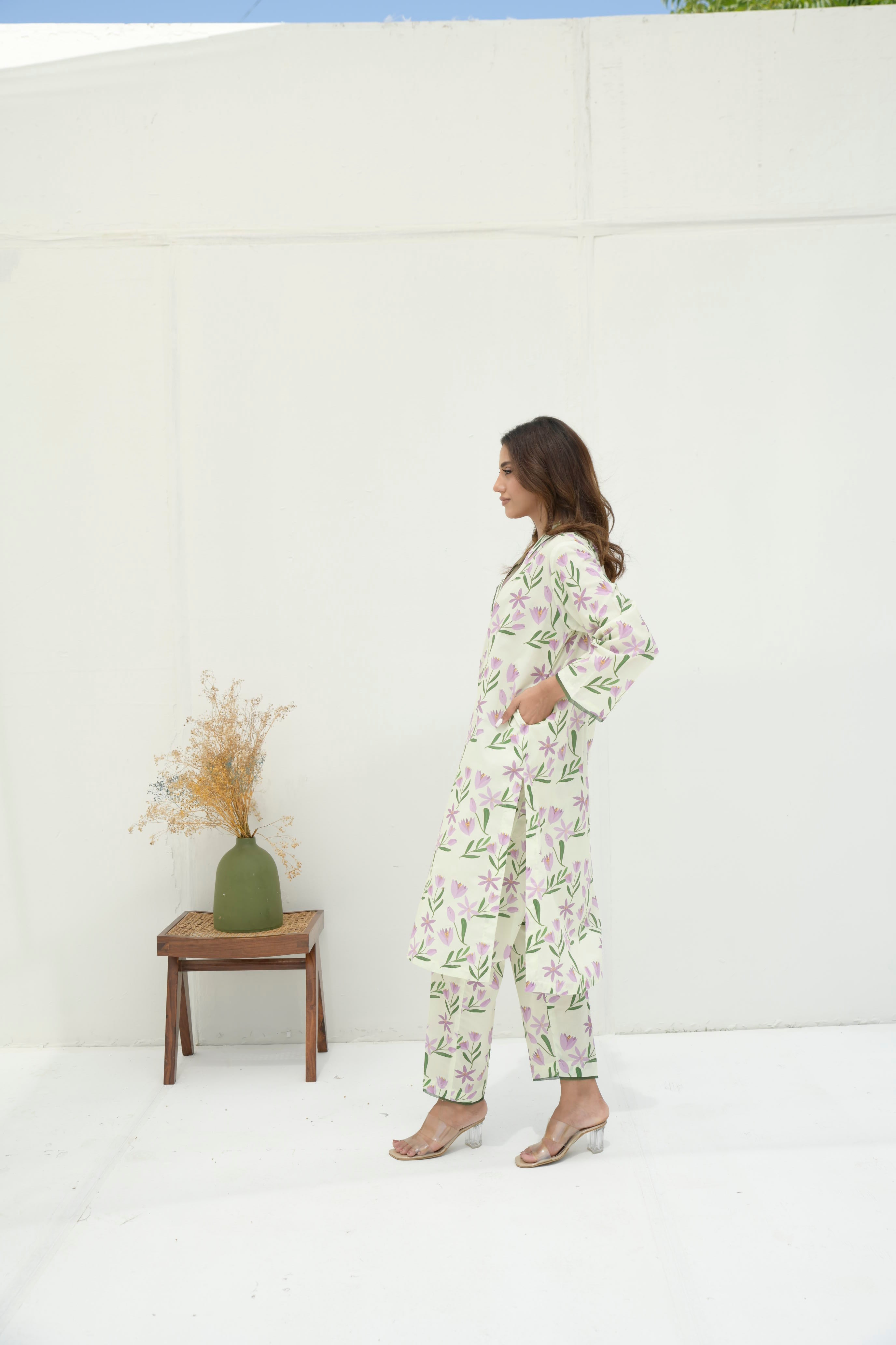 Stay cool and serene this summer with 'Ivy'. This beautiful 2-piece co-ord set exudes grace through its delicate pastel shades and soft floral artistry.