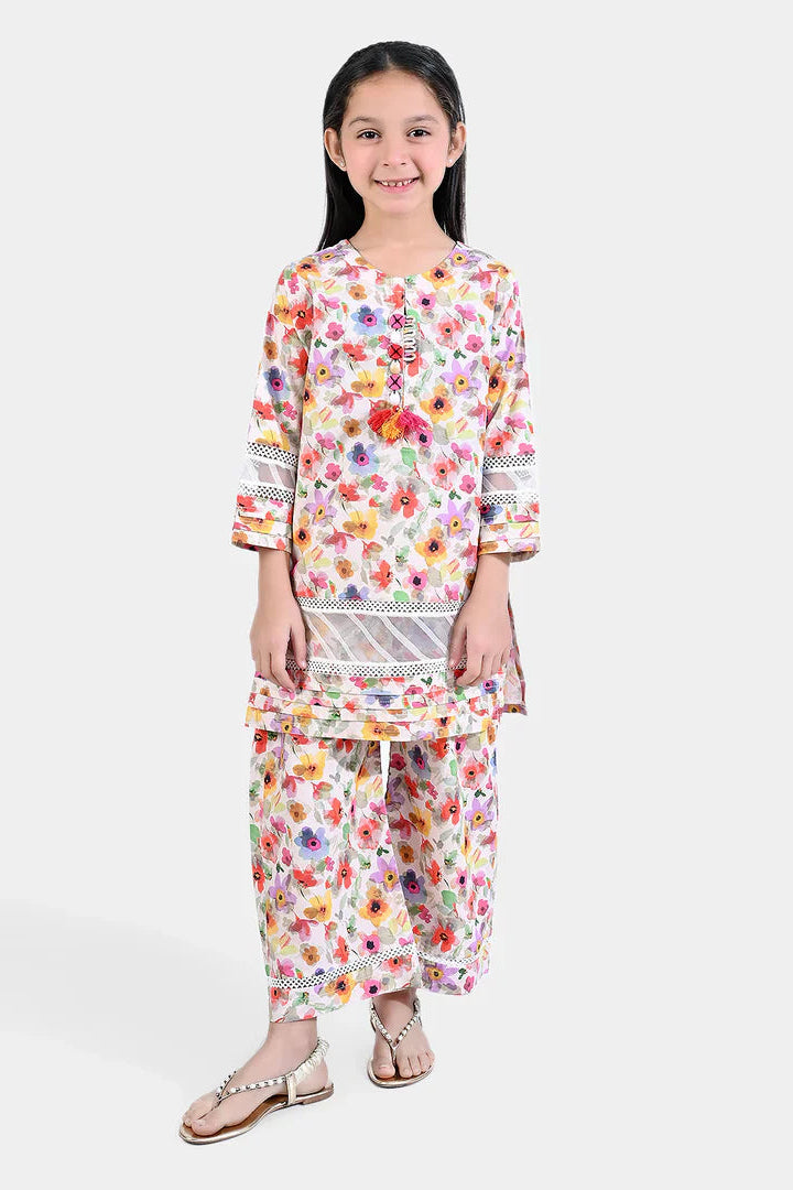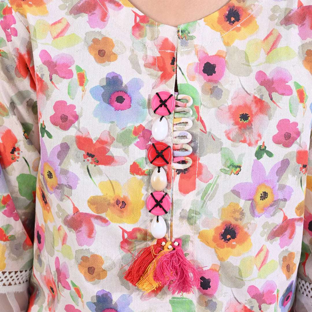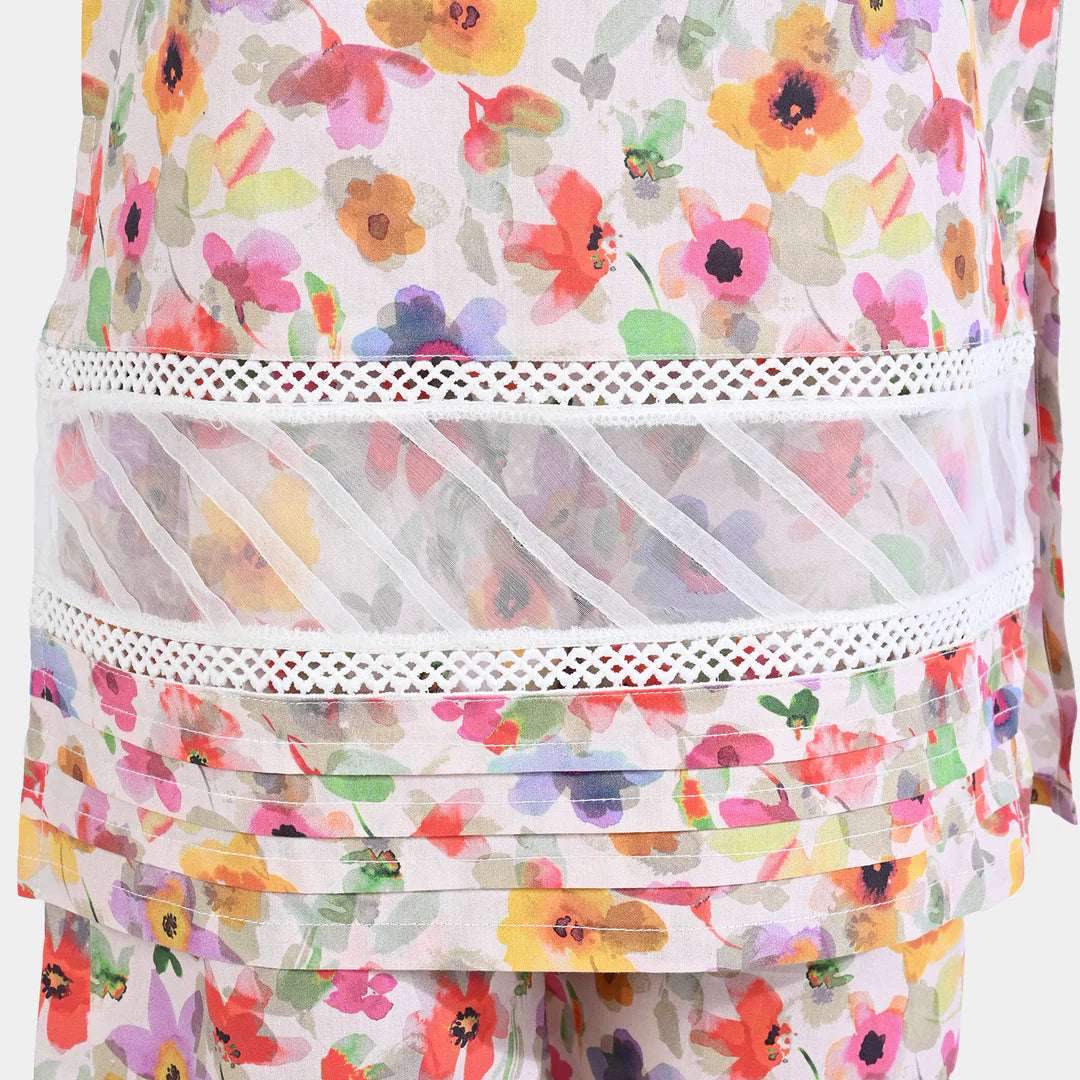 Make a statement in this floral ensemble accented with lace details. It includes a straight shirt, paired with culottes.