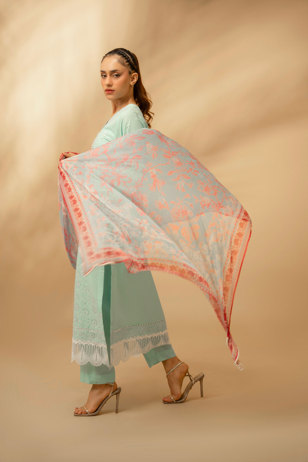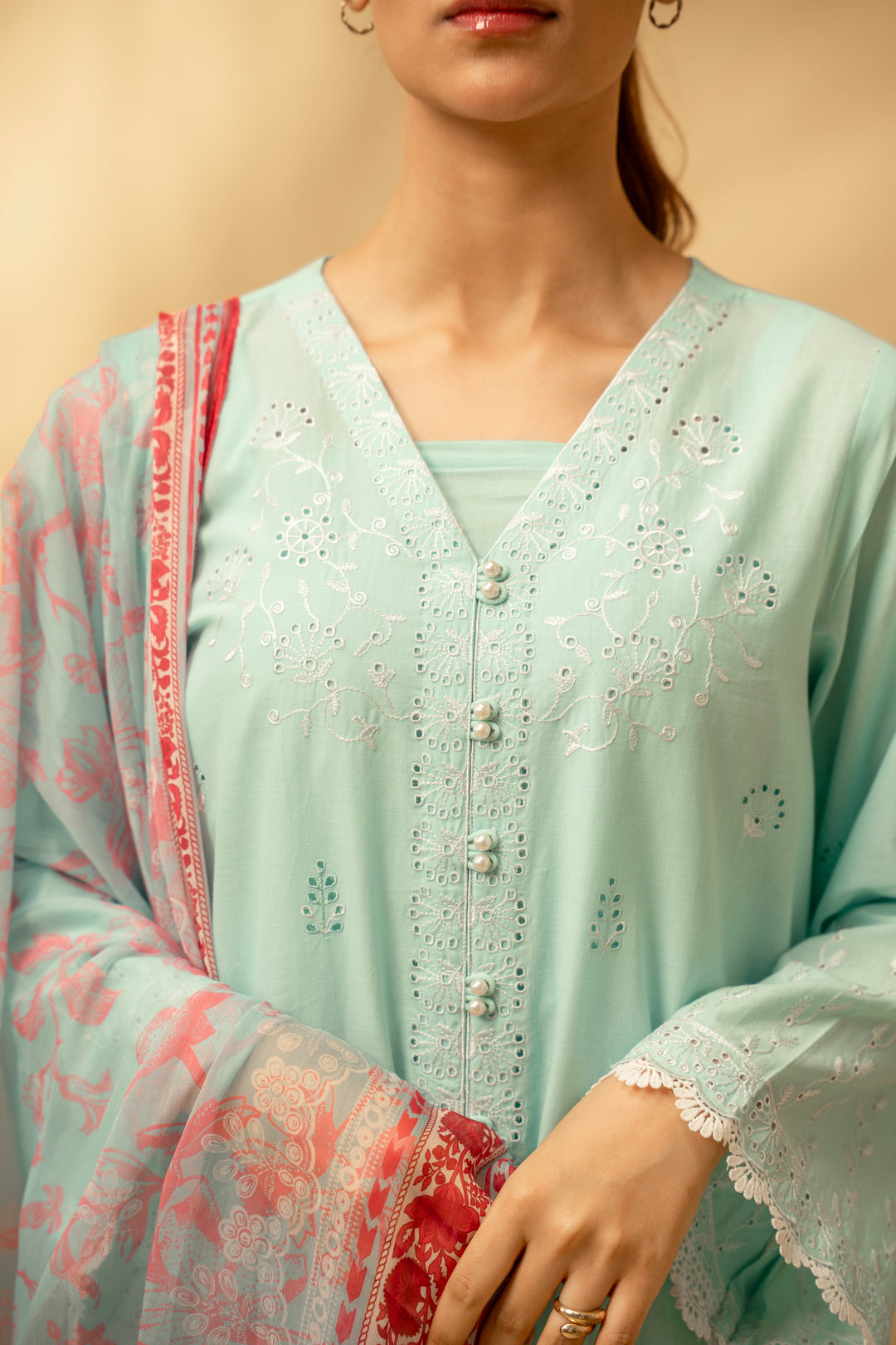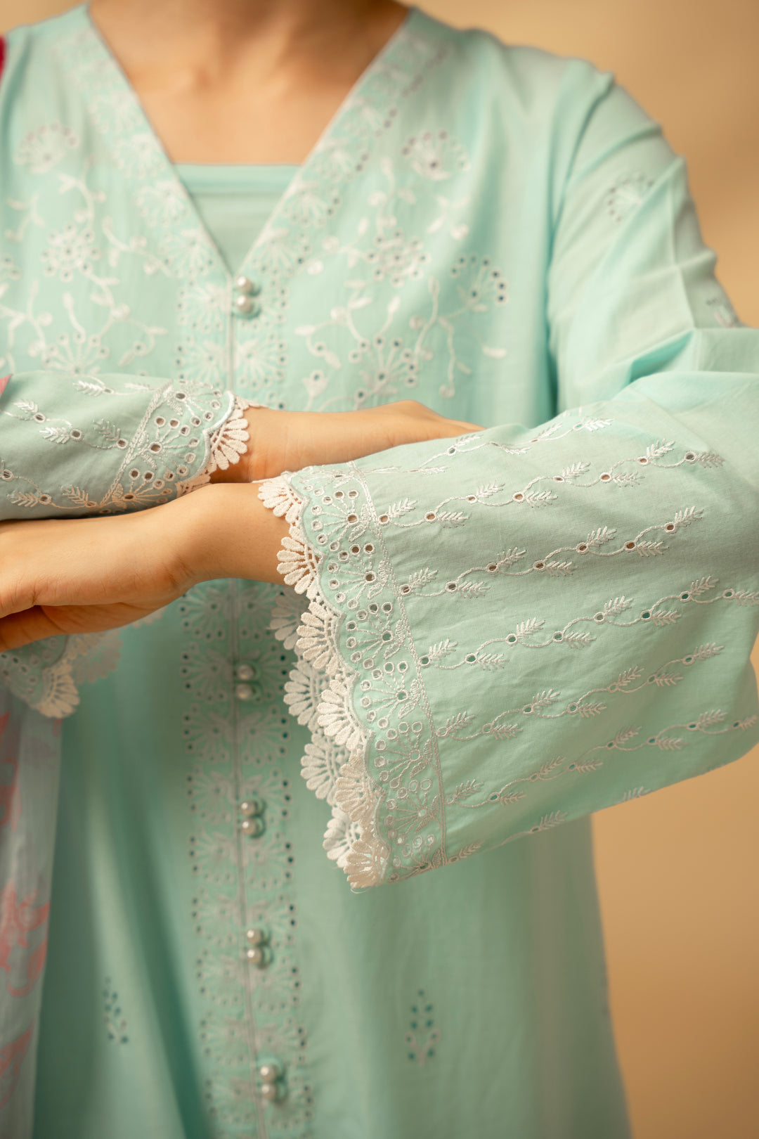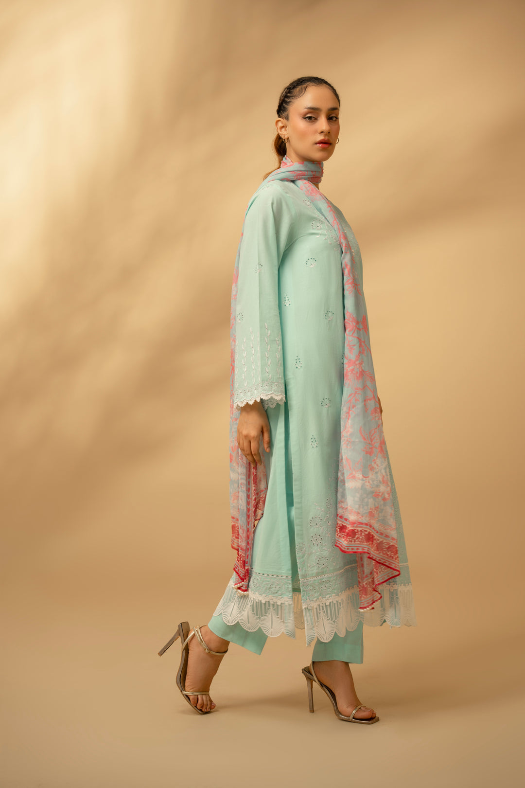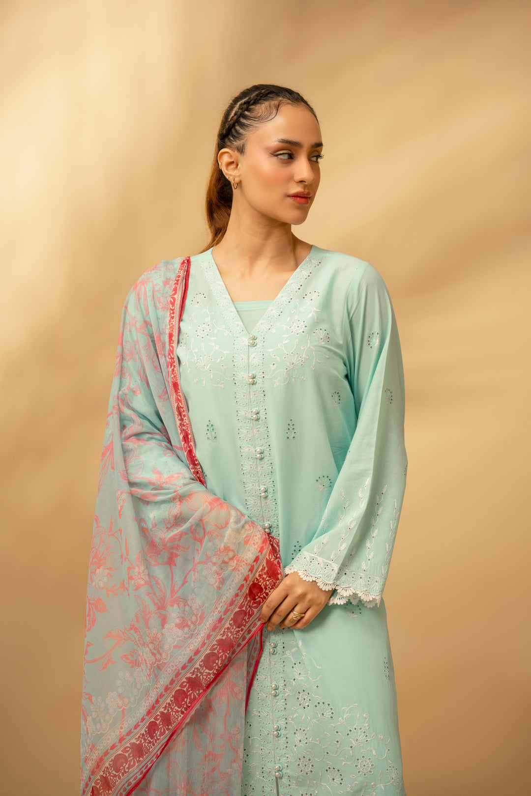 Experience timeless elegance with the Glacier Blue 3-piece Chicken Kari Lawn Suit. Crafted from breathable lawn fabric, this suit offers comfort in warm weather while showcasing exquisite embroidery inspired by traditional craftsmanship. Its soothing glacier blue hue adds a refreshing touch to your wardrobe, making it perfect for both casual and festive occasions. Elegant, comfortable, and versatile?this suit is a must-have for your collection.