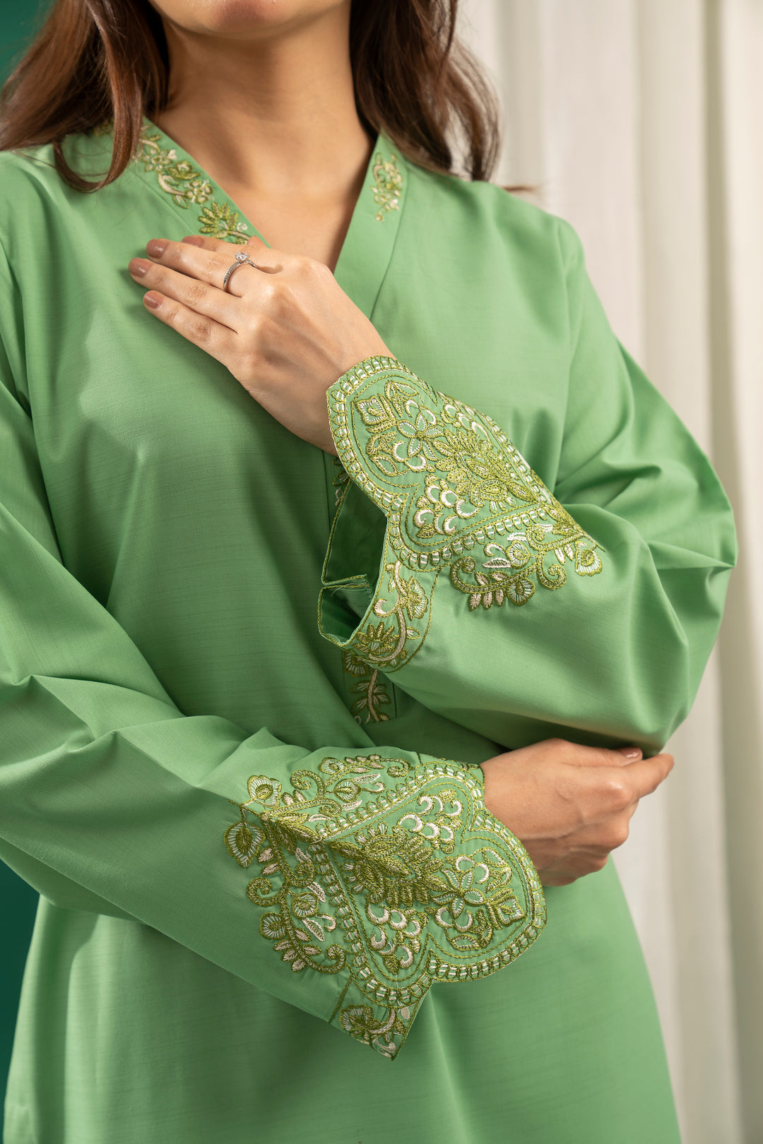 Elevate your style with our Green Embroidered CO-ORD Set. Crafted from a luxurious blended fabric, this set features elegant embroidery on the neckline and sleeves. With a flattering V neckline, this set will add a touch of sophistication to any outfit. Perfect for any occasion.