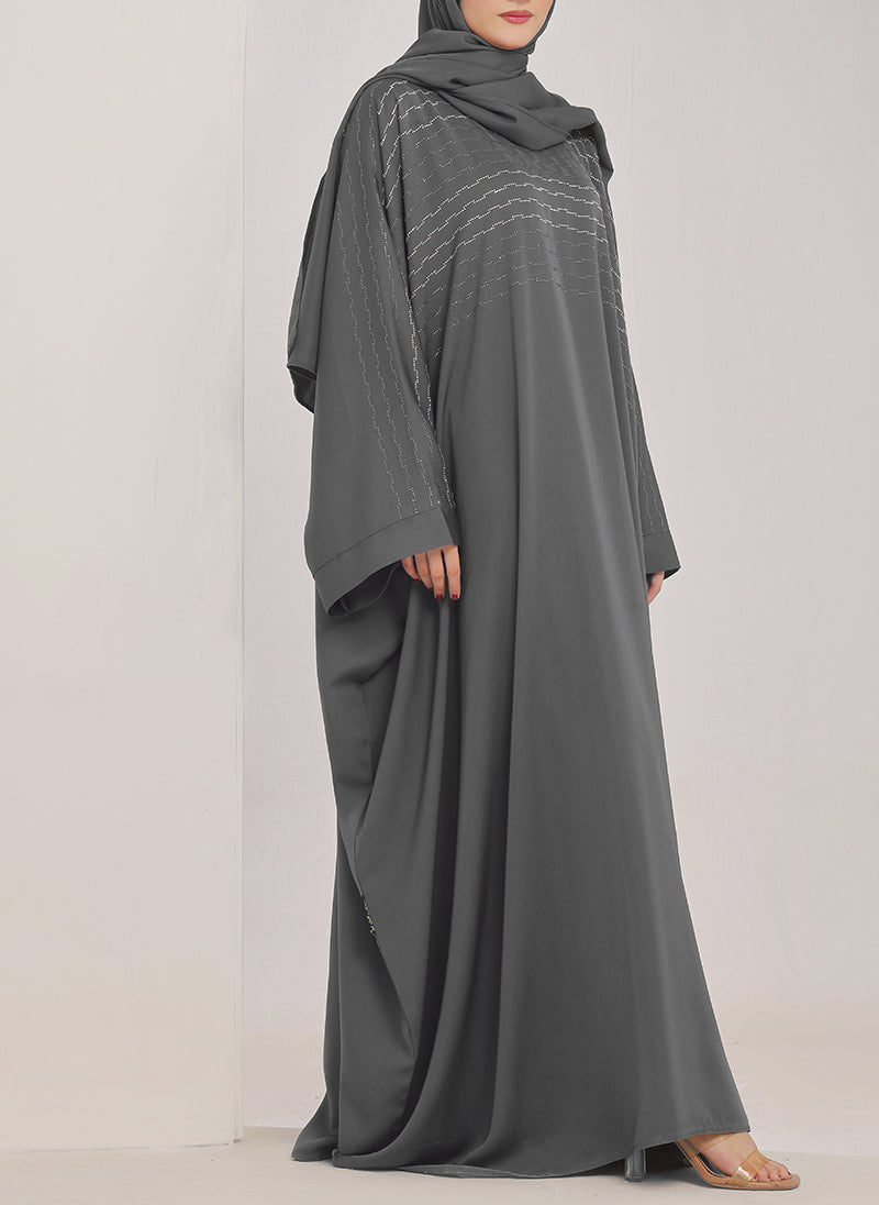 This Grey Jilbab is made from soft Nida fabric and features elegant stone work for a touch of glamour. Comfortable and stylish, it's perfect for everyday wear or special occasions.