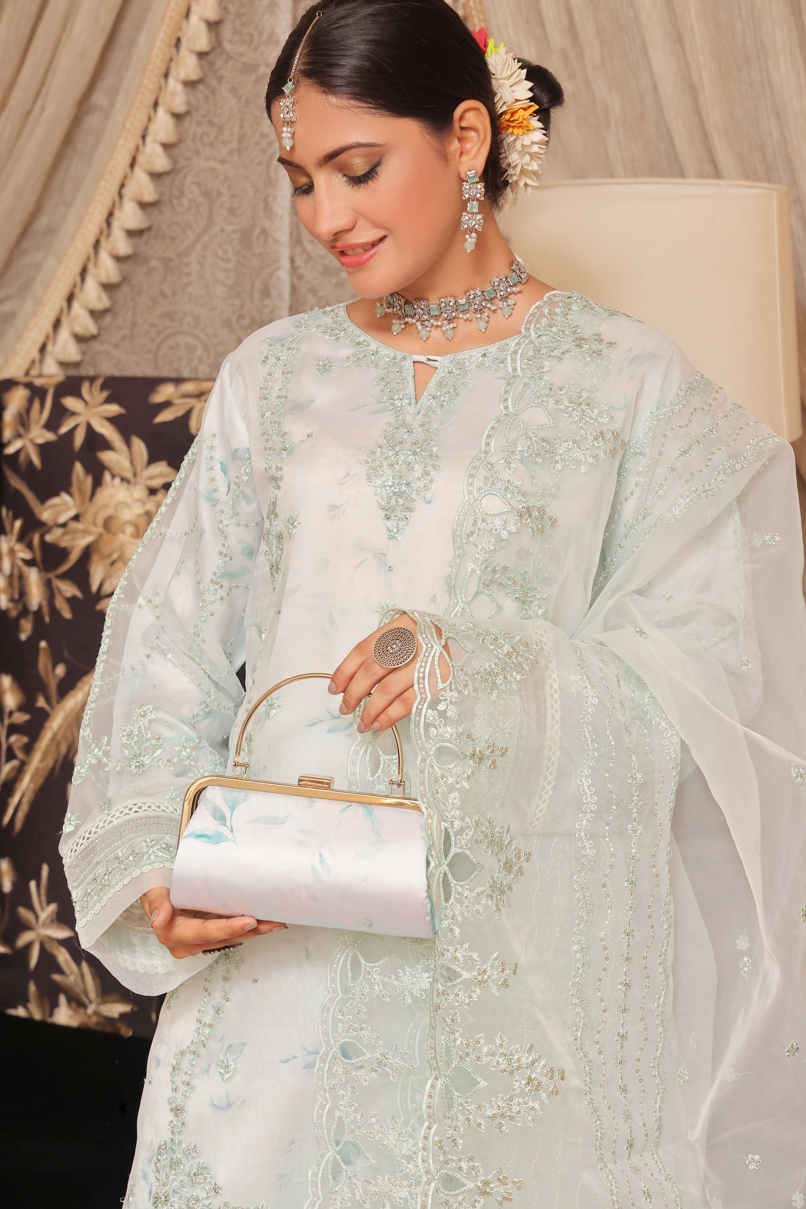 Shirt: Semi-stitched fancy heavy embroidered organza shirt with embellishments, paired with a digital printed silk inner