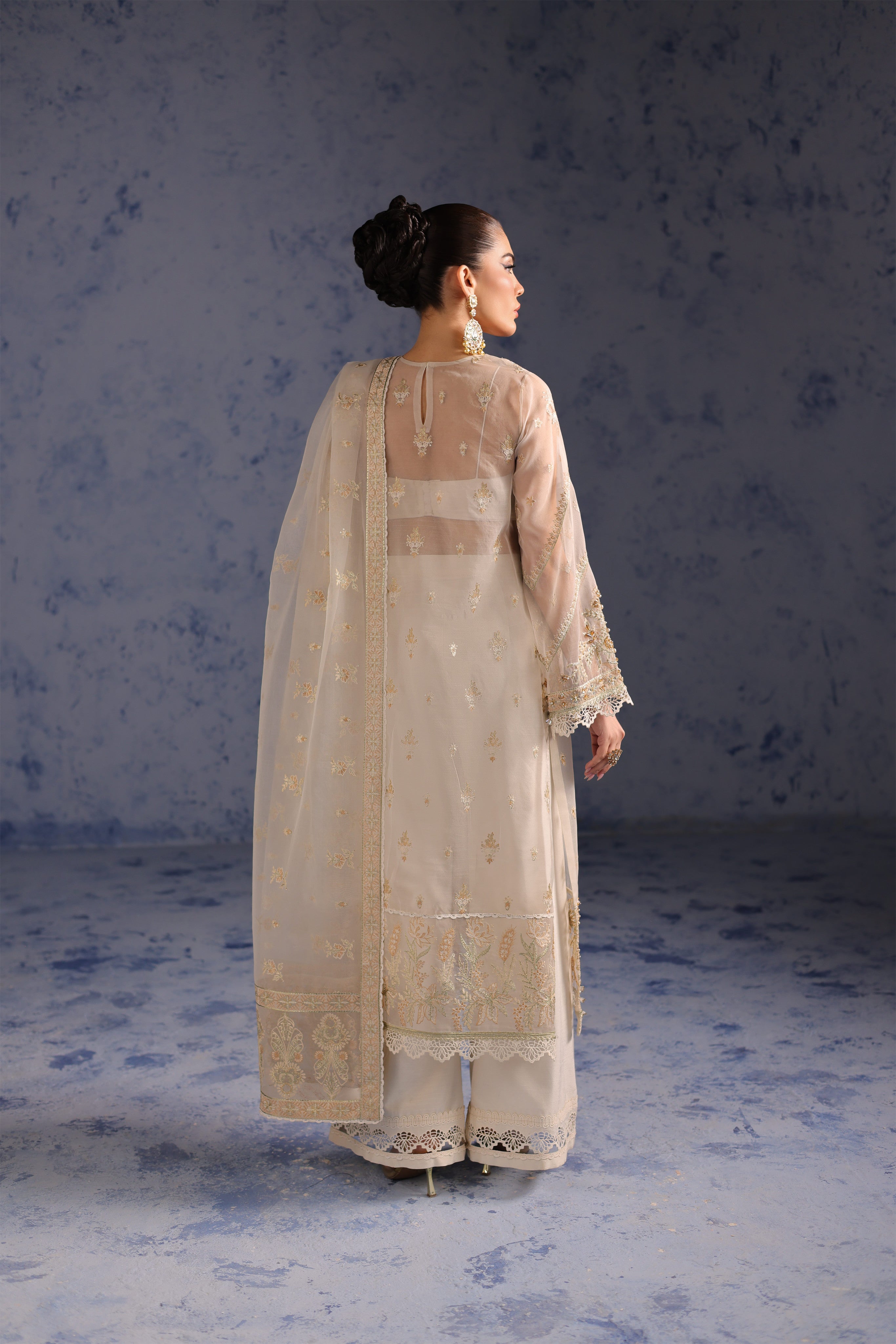 Paired with an embroidered organza dupatta, crafted with exquisite finesse, and a dyed raw silk trouser with coordinated lining fabric, this ensemble balances ethereal beauty with structured elegance.