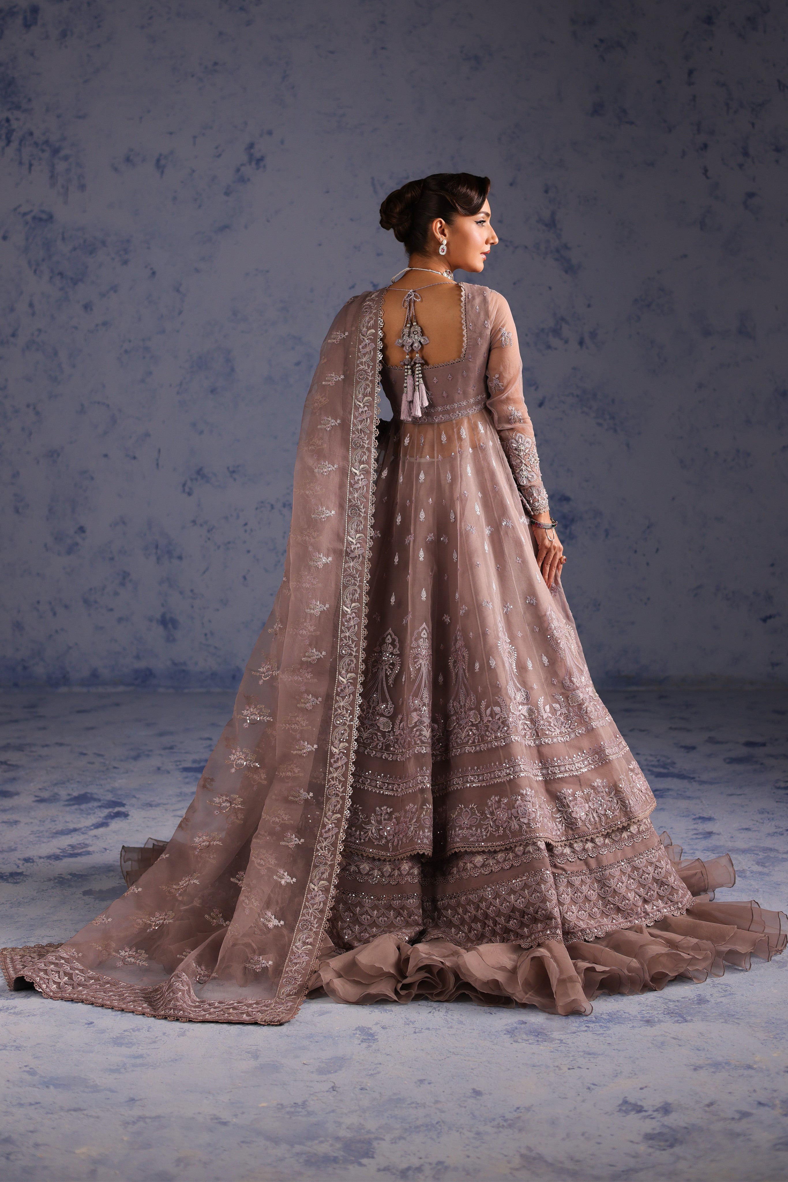 The flowing peshwas-style silhouette features 18 embroidered organza panels, creating a soft, voluminous fall. Two intricately embroidered organza lehenga borders add depth and a luxurious finish to the hemline.