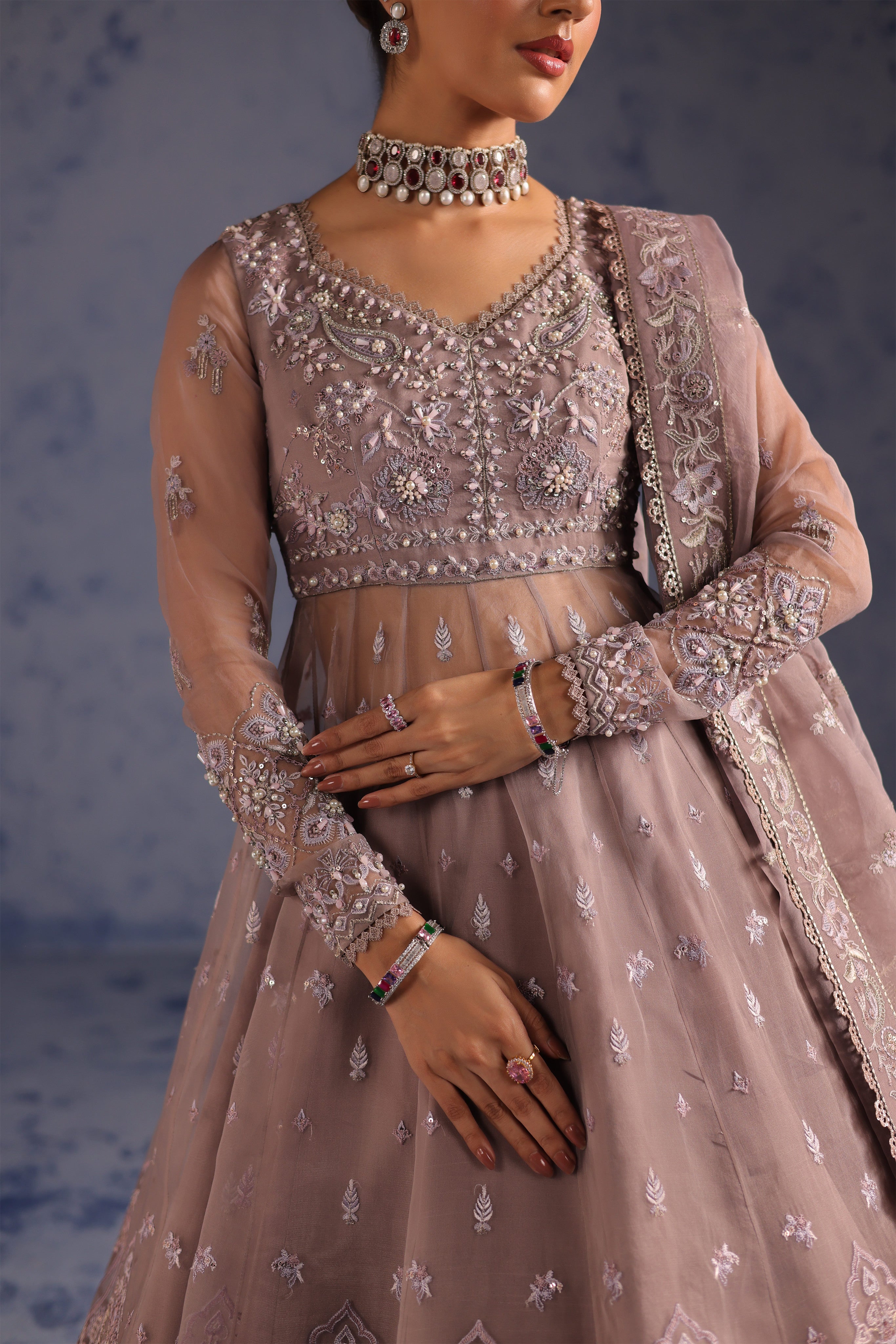 This graceful lavender maxi dress is a celebration of fine craftsmanship and elegant design. The front bodice is crafted from hand-embellished embroidered organza, beautifully balanced by an embroidered organza back and delicately hand-embellished organza sleeves.