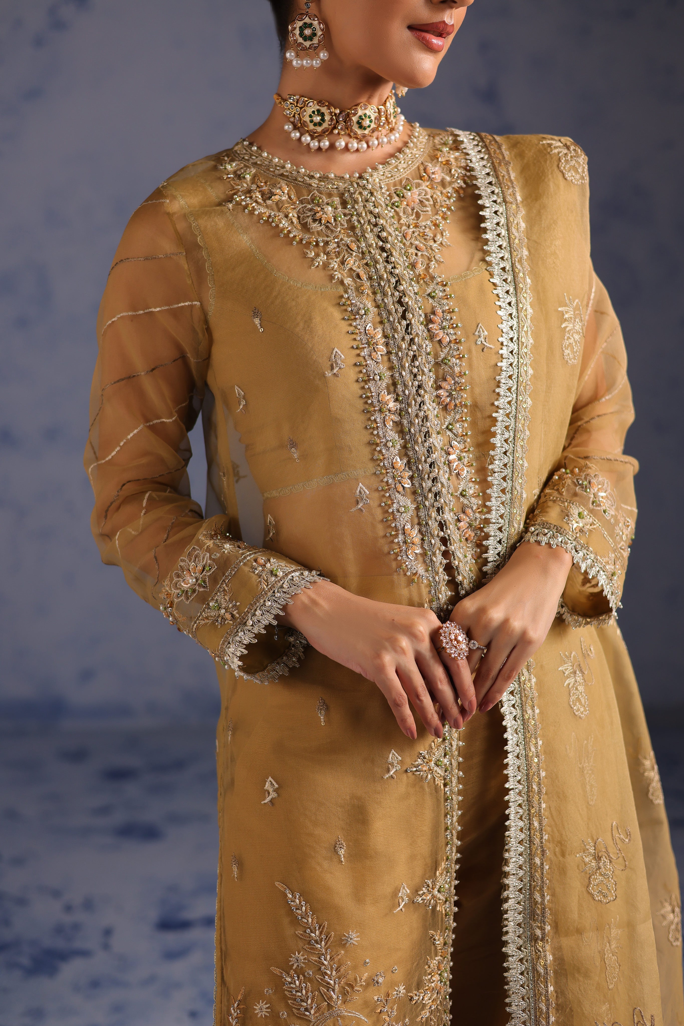 Step into timeless elegance with this exquisitely crafted golden eastern shirt dress, a perfect harmony of traditional artistry and contemporary grace. The organza shirt features meticulously hand-embellished and embroidered front panels, adorned with a rich blend of Japanese cut dana, Indian joun moti, pearls, multi-color crystals, plate kashti sitara, delicate drops, and bethki, creating a luminous, regal finish.