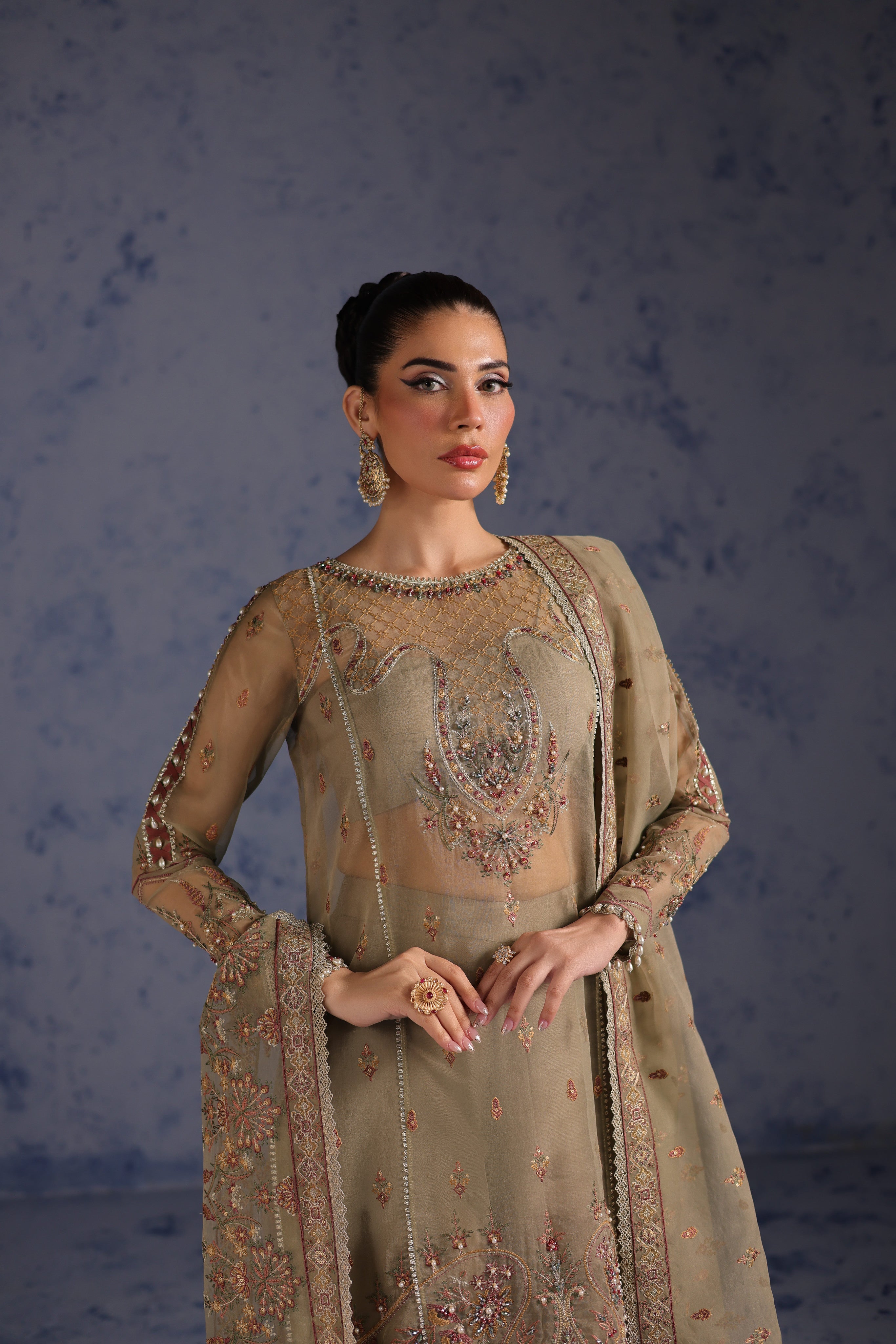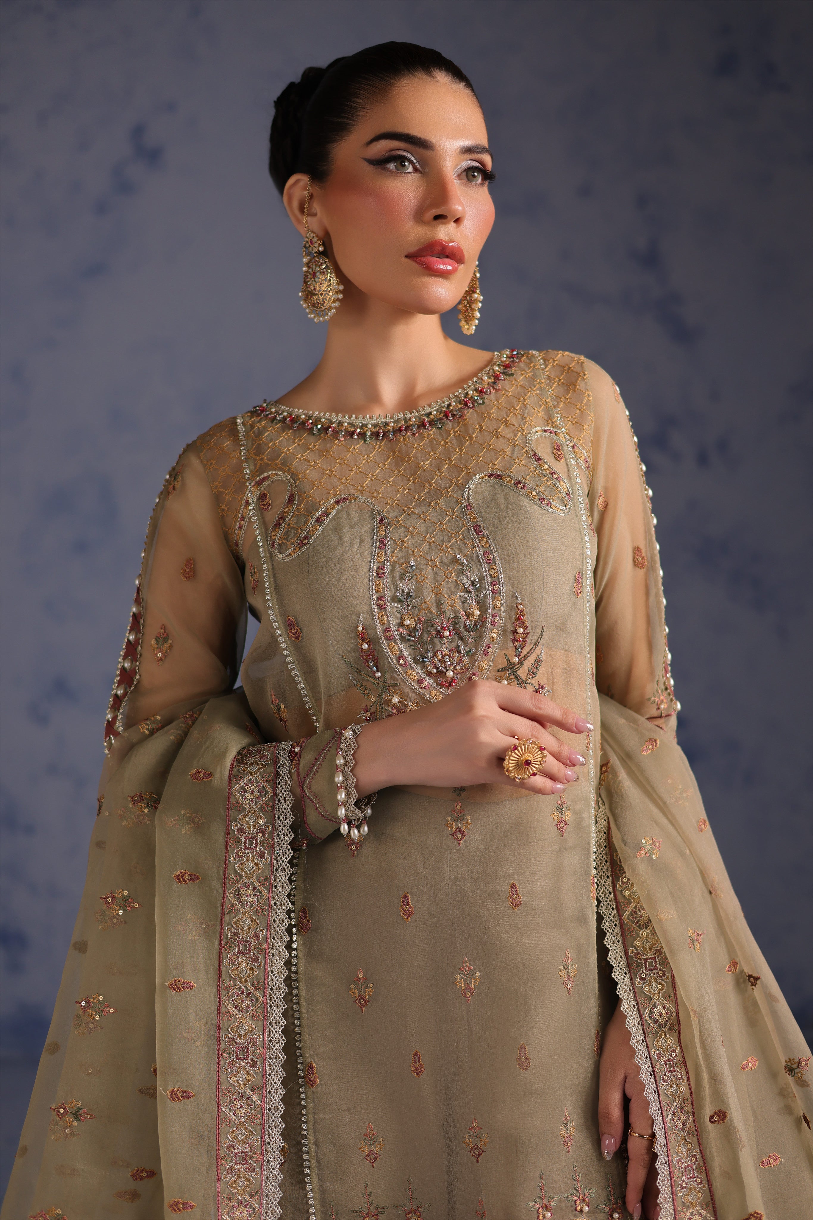 Intricate detailing adorns the organza hem border and sleeves, embellished with a luminous blend of kulfi, bethki, Japanese cut dana, pearls, drops, and multi-colored crystals, adding subtle sparkle and depth to the rich olive tone. The embroidered back and back hem border ensure elegance from every angle, completing the shirt with refined craftsmanship.