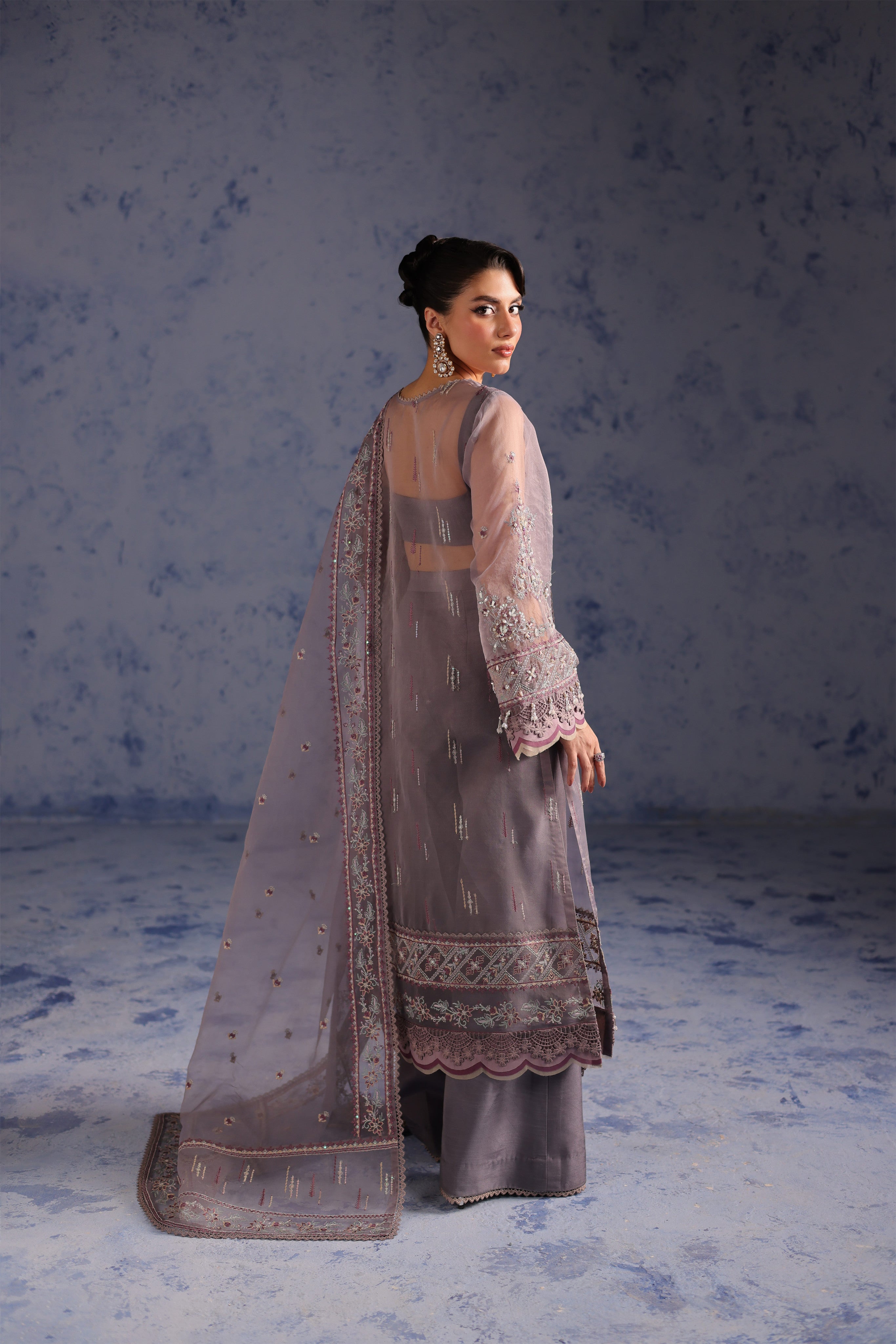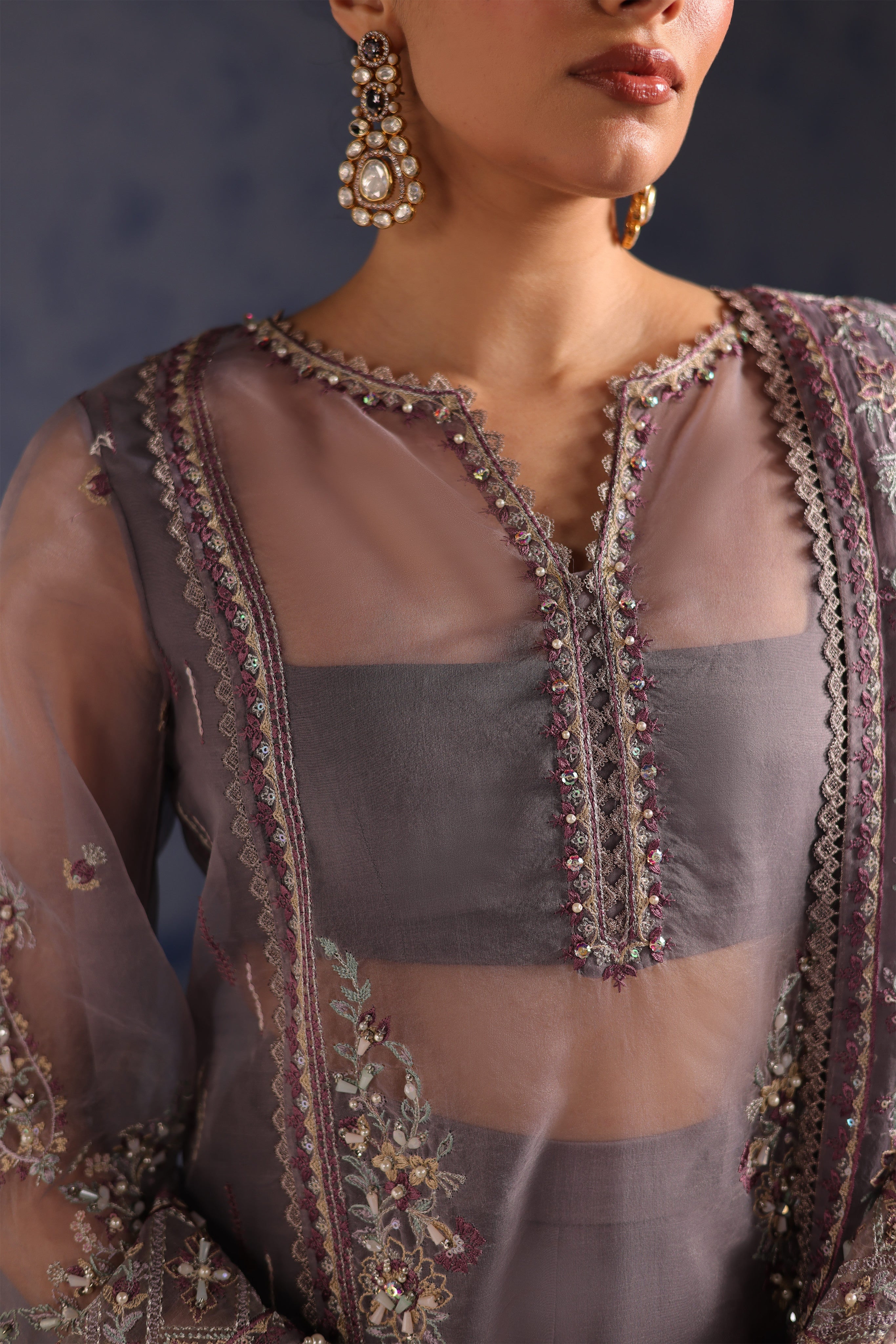 Exuding refined sophistication, this grey luxury eastern ensemble is a testament to ultimate elegance and masterful craftsmanship. The organza shirt is meticulously hand-embellished and embroidered, featuring a statement front center panel beautifully balanced with front left and right panels, creating a graceful and structured silhouette.