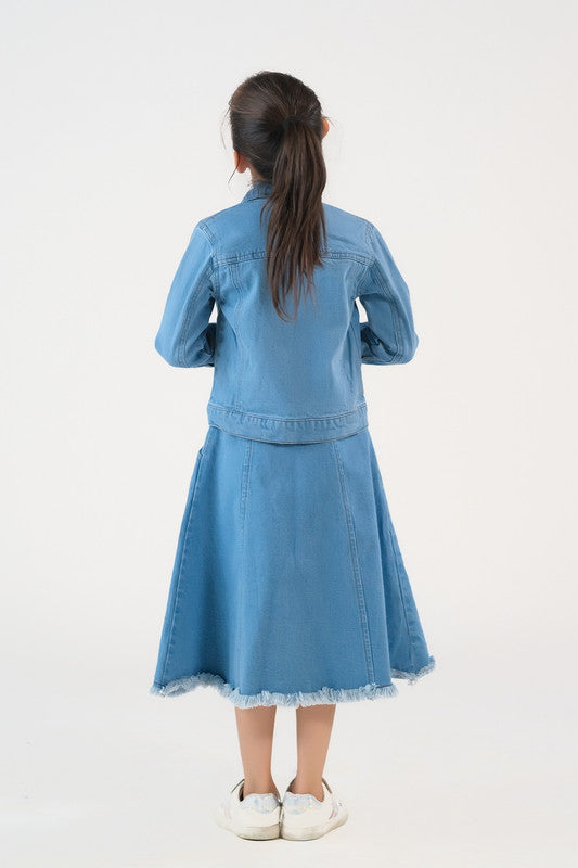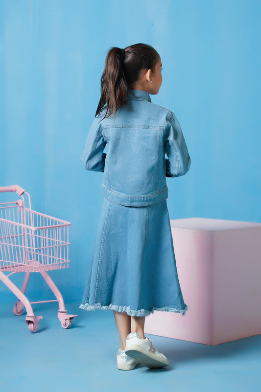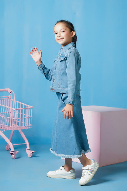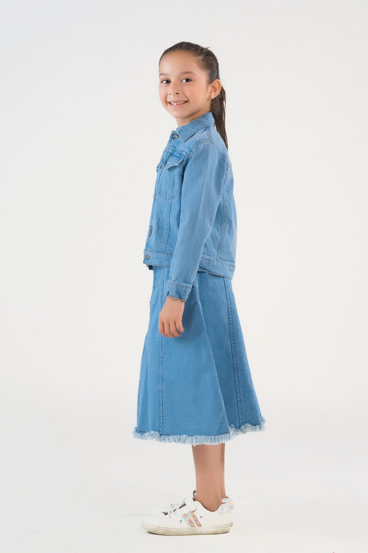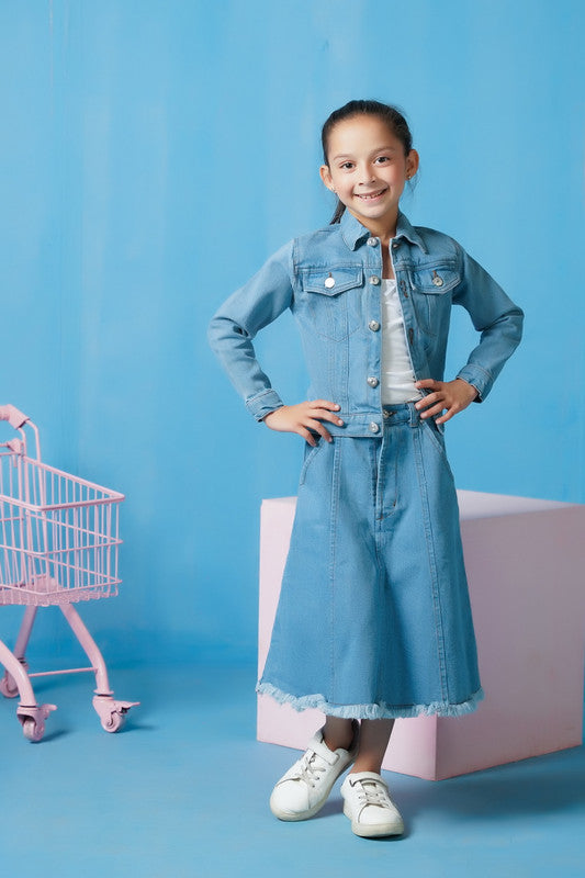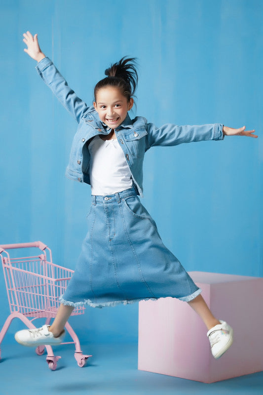 This light wash denim jacket is perfect for girls looking for a stylish and versatile addition to their wardrobe. Made with durable denim material, this jacket will keep you warm and add a touch of edge to any outfit. The timeless design and comfortable fit make it a must-have for any fashion-forward girl.