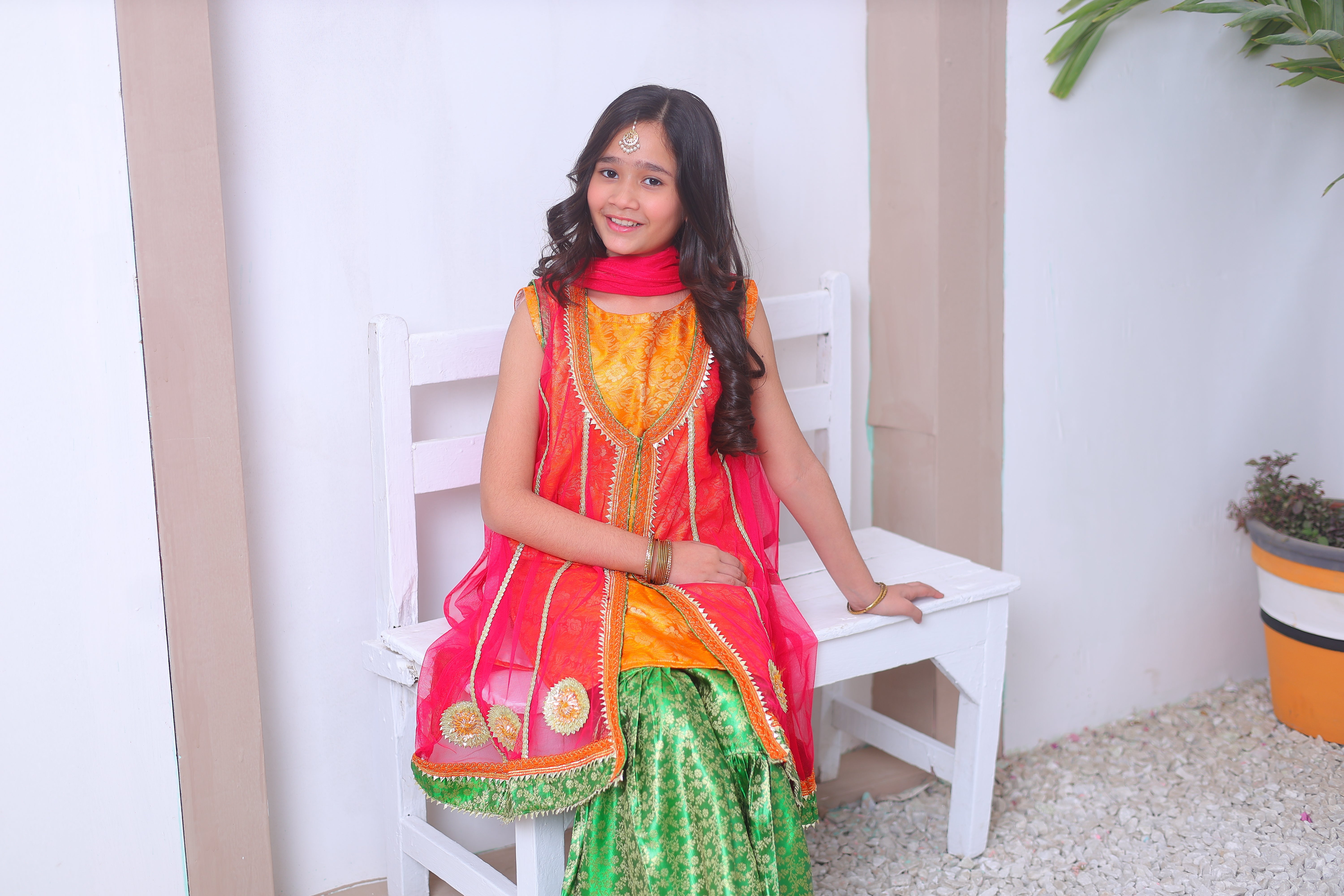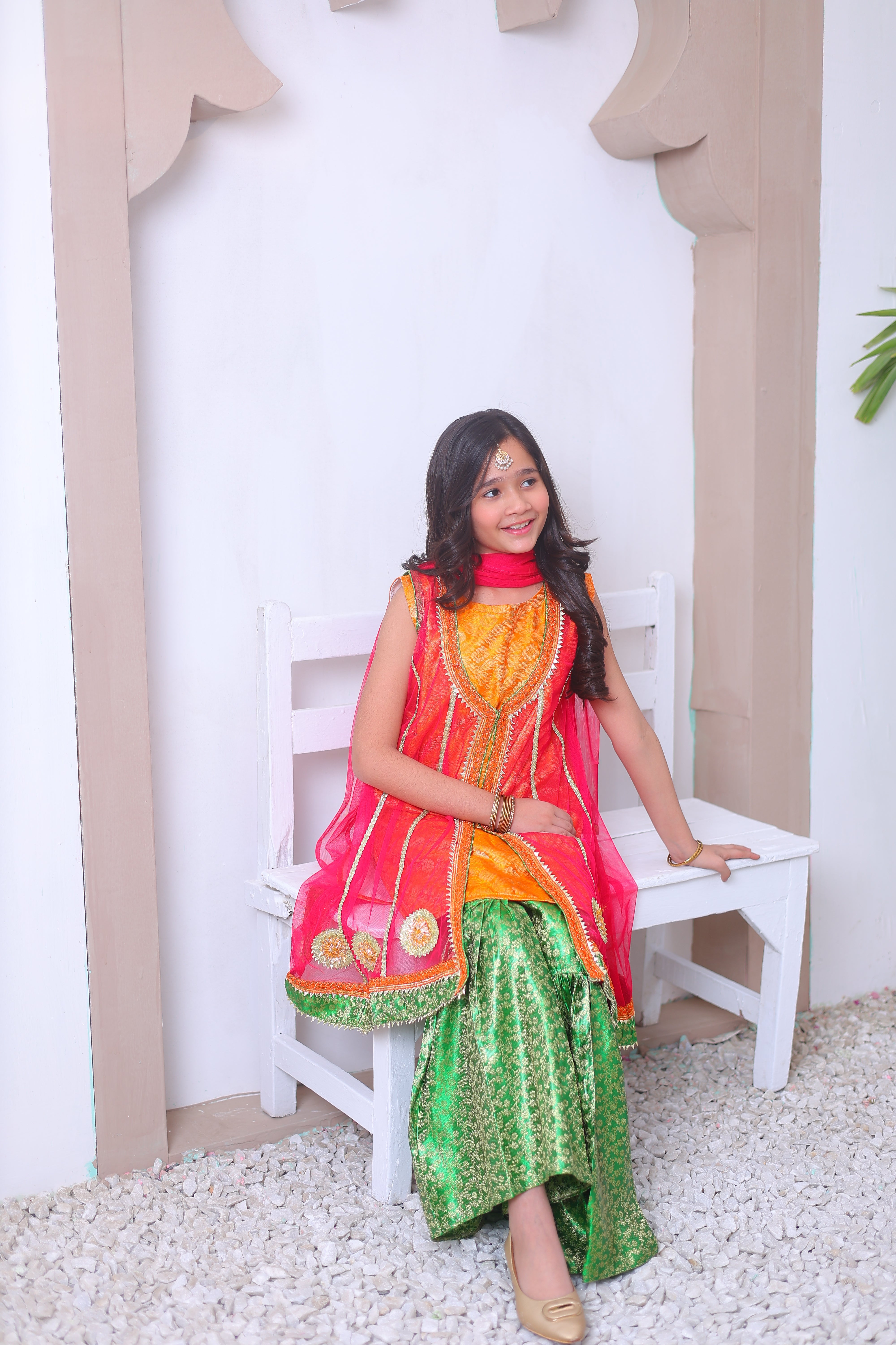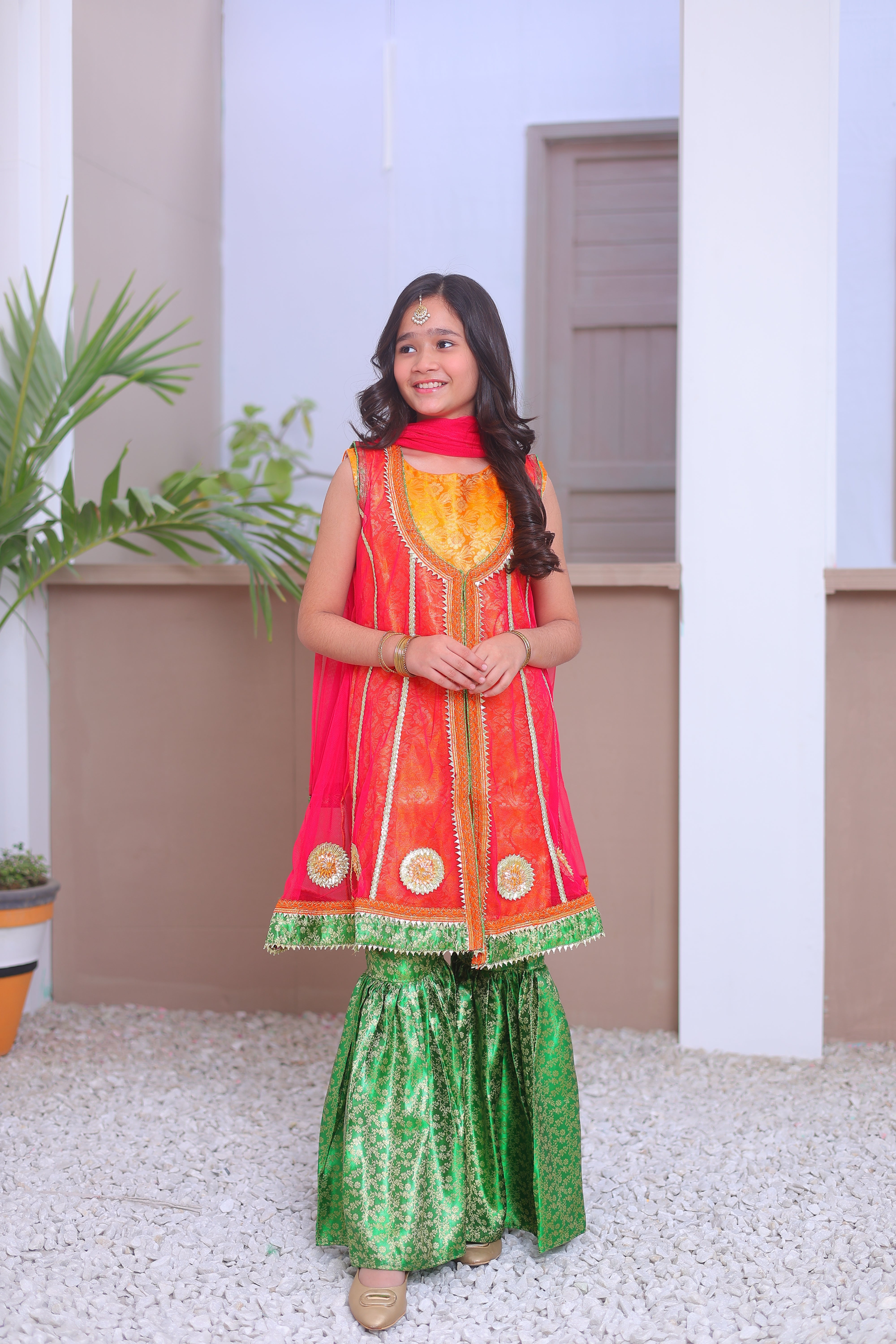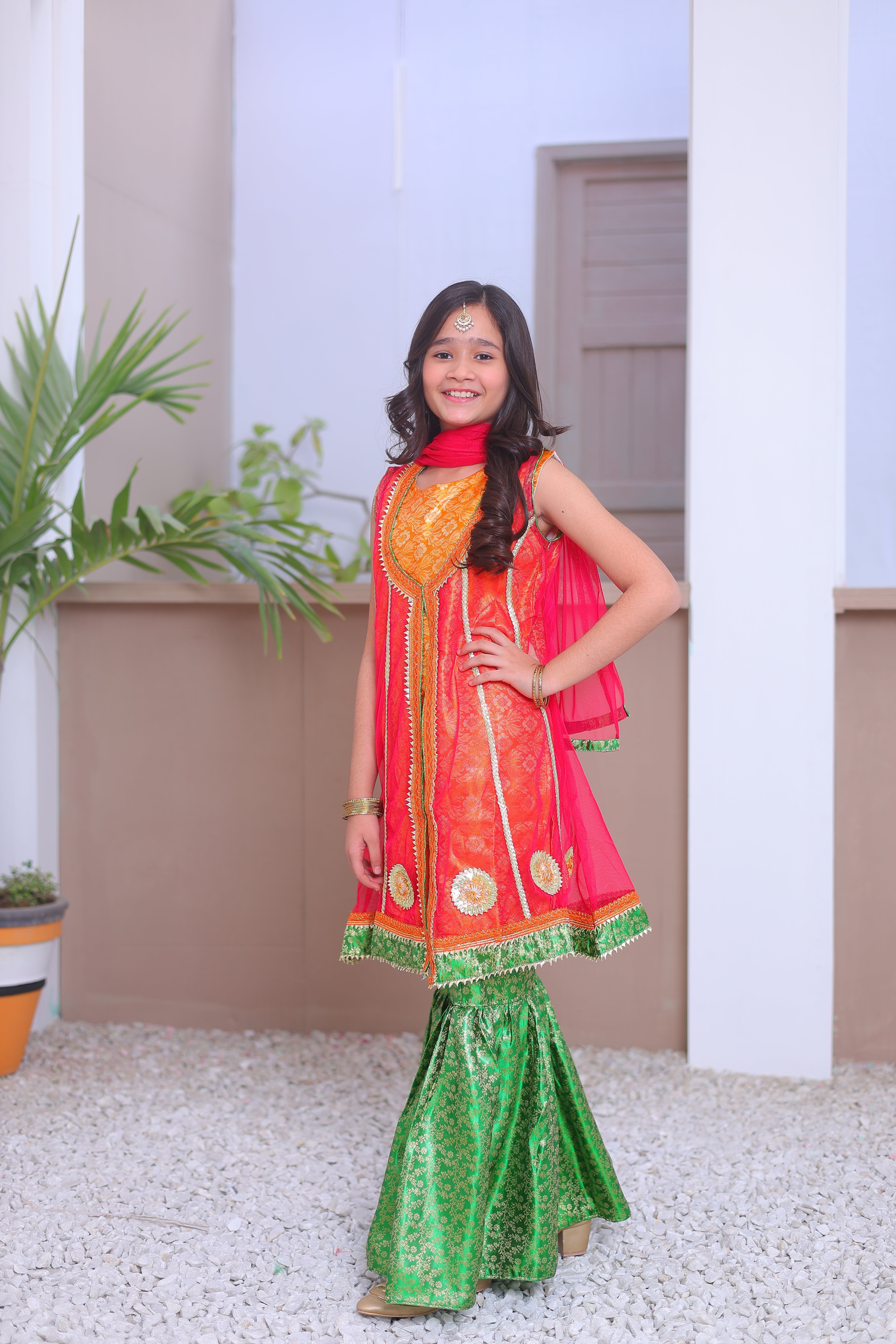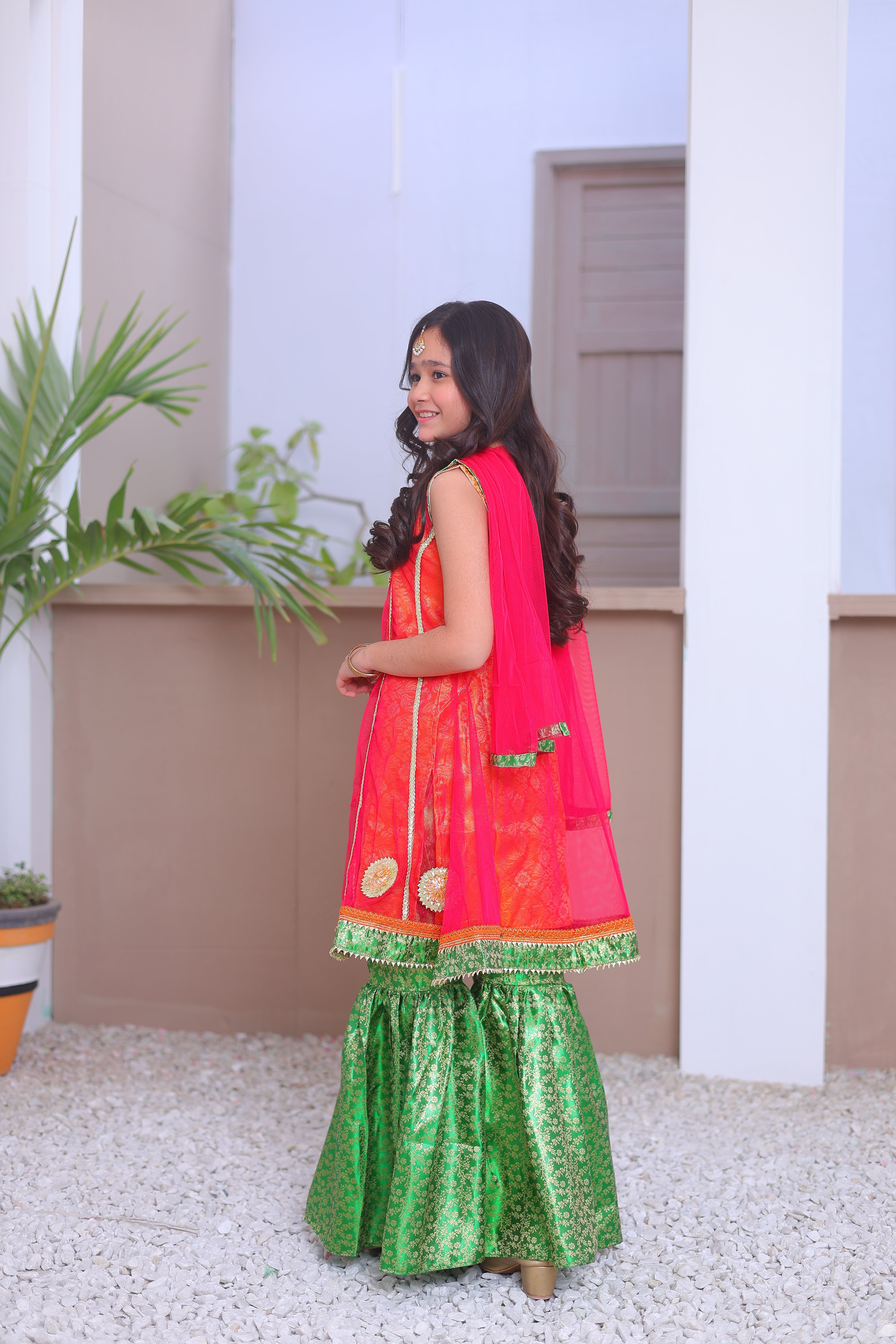 Mix of jamawar and banarsi fabric is adorned with exquisite Gota embroided gharara is a testament to craftsmanship.