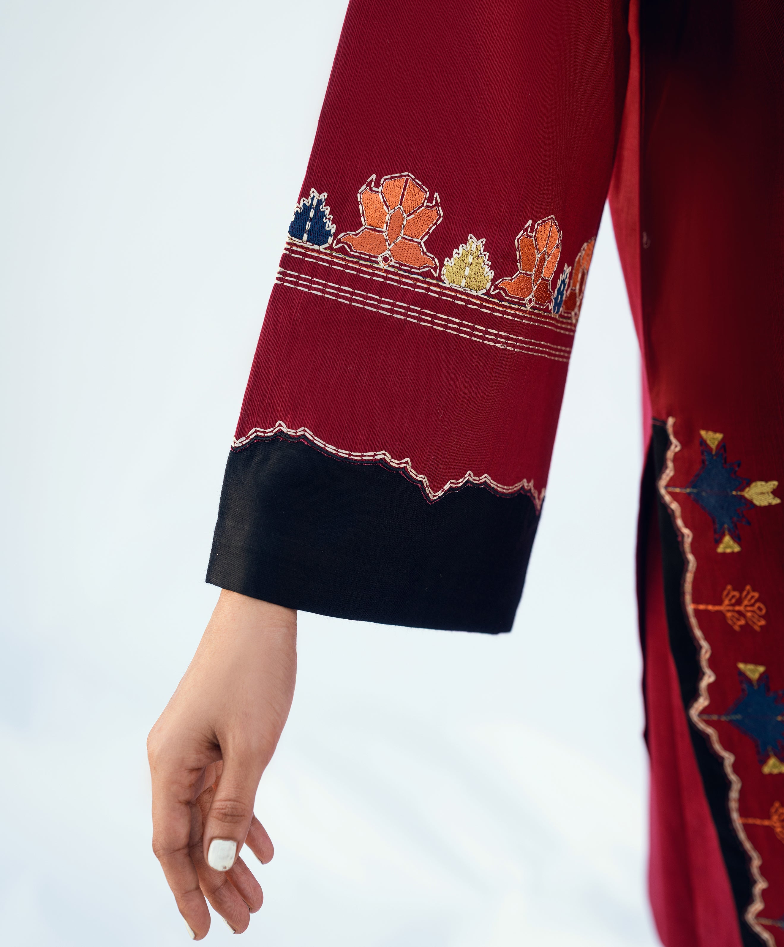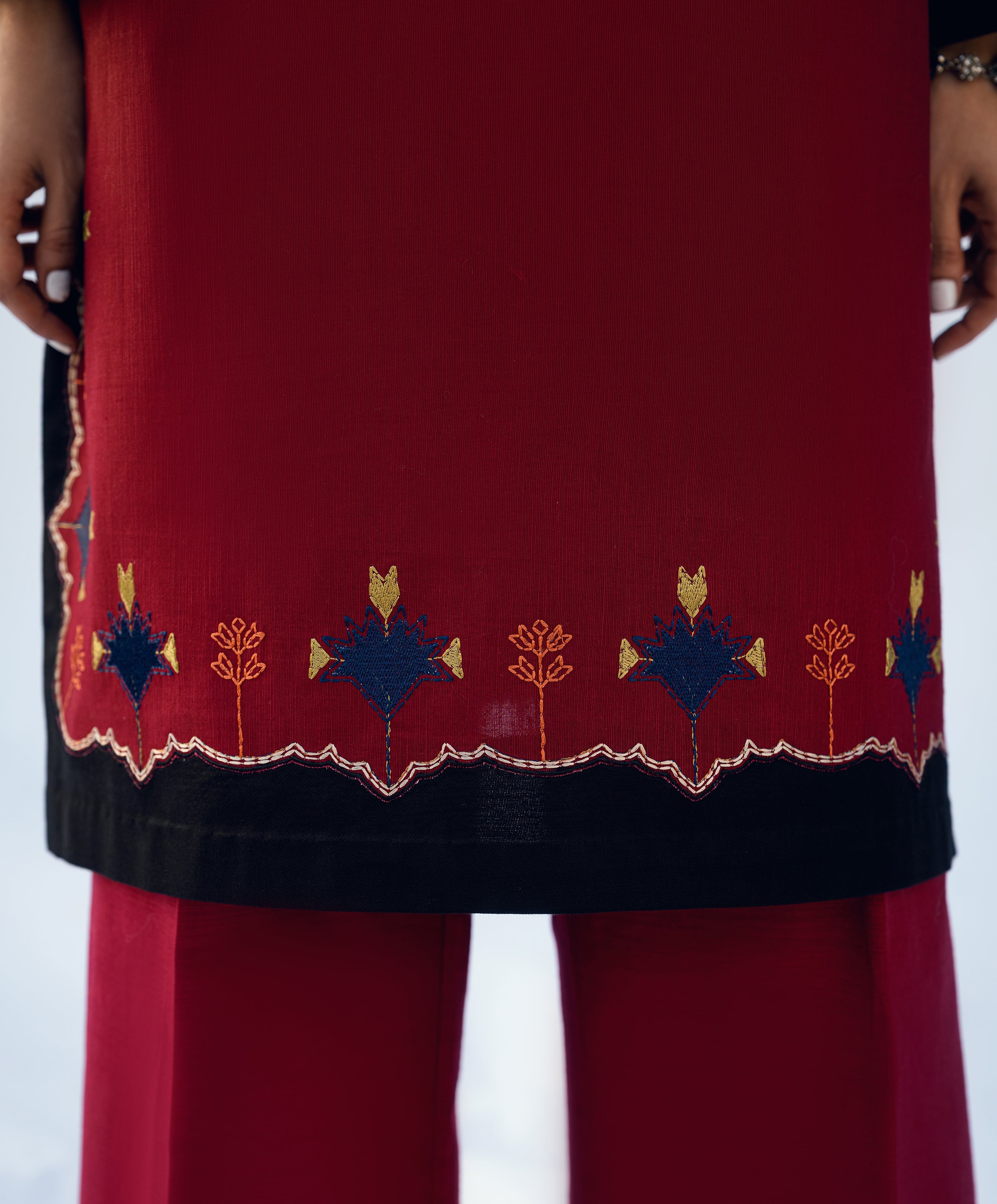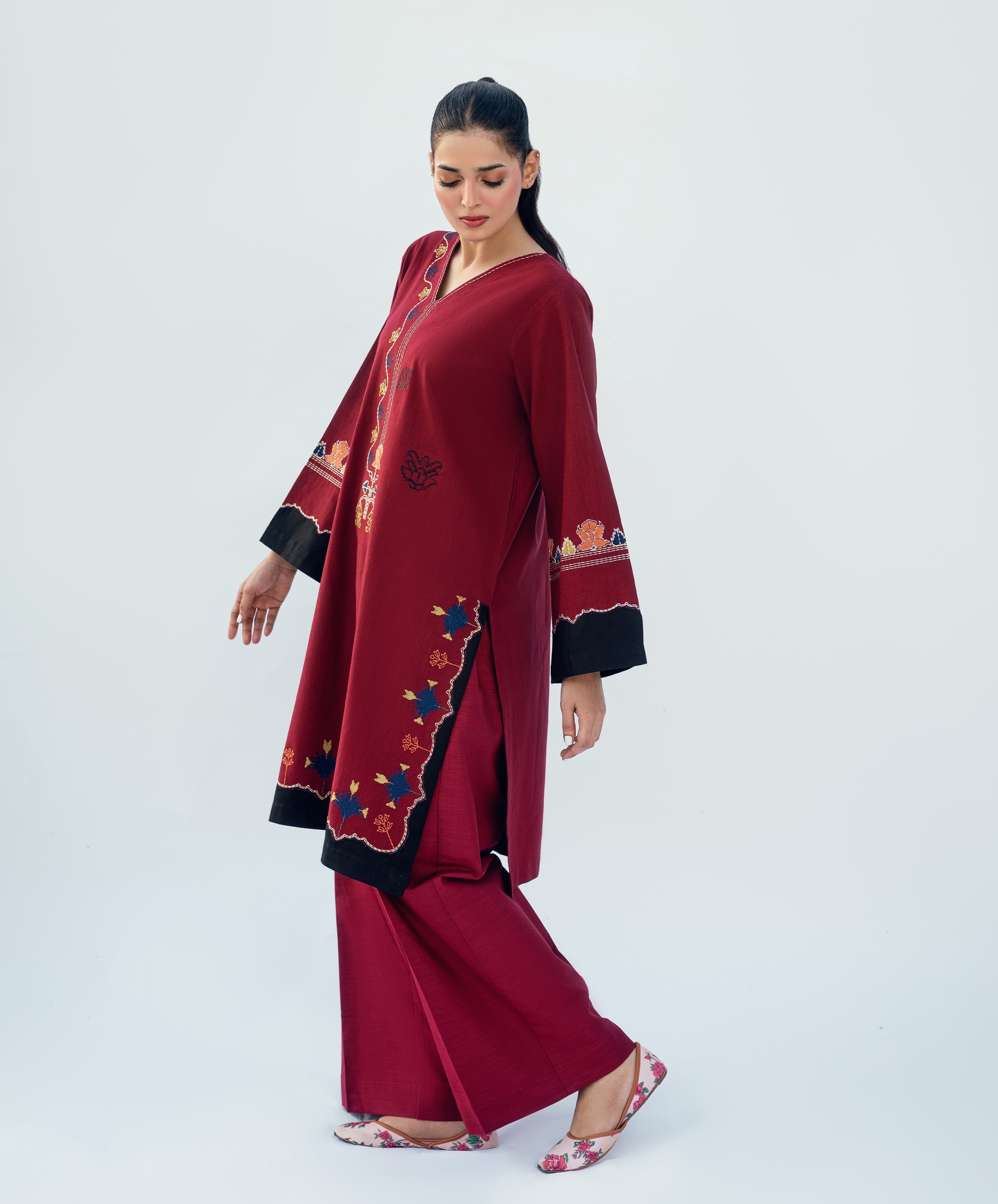Red khaddar two-piece embroidered set. Phulkari-inspired embroidery with signature kaanthaa touch on front and sleeves. Straight shirt and wide-legged straight pants.