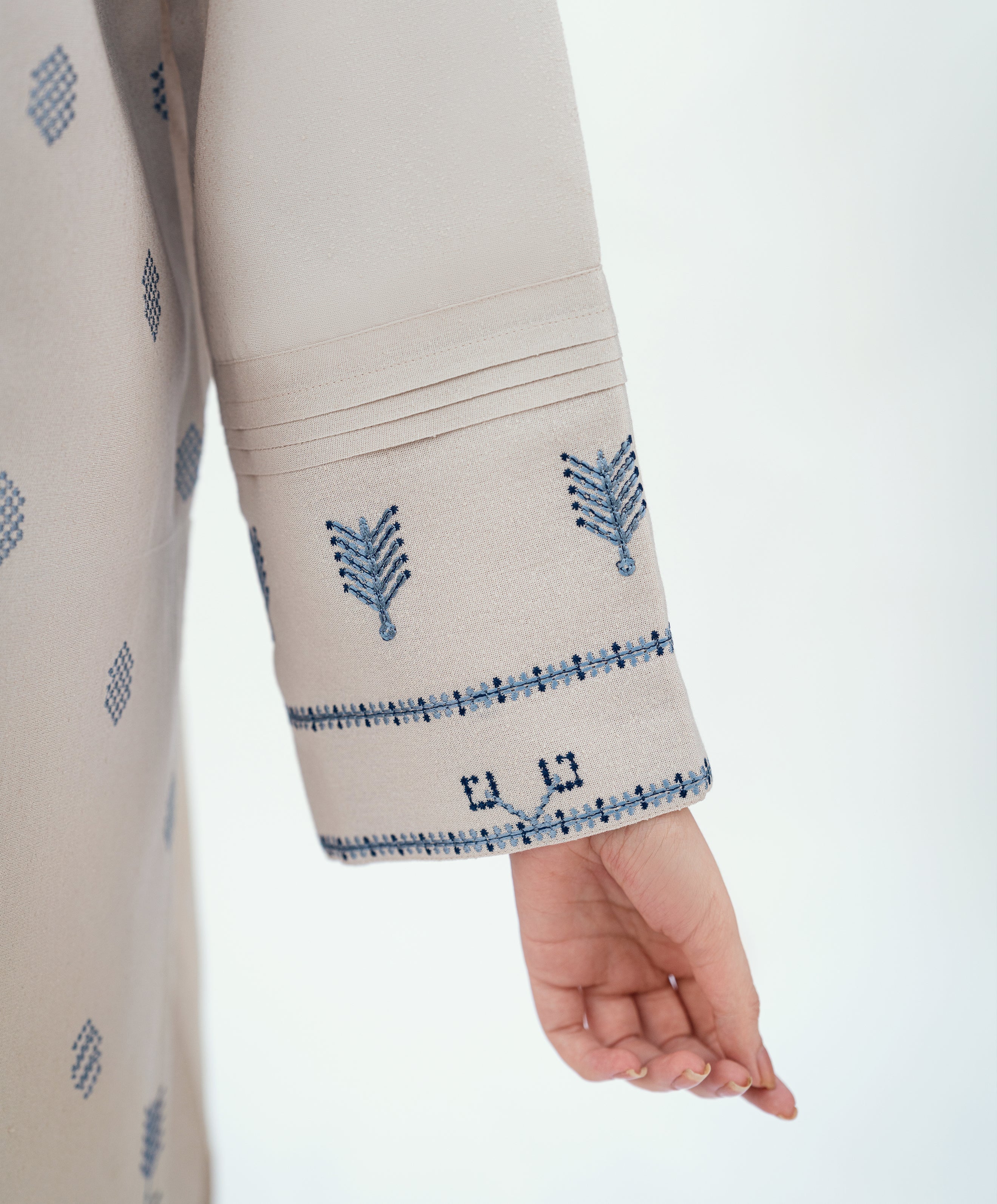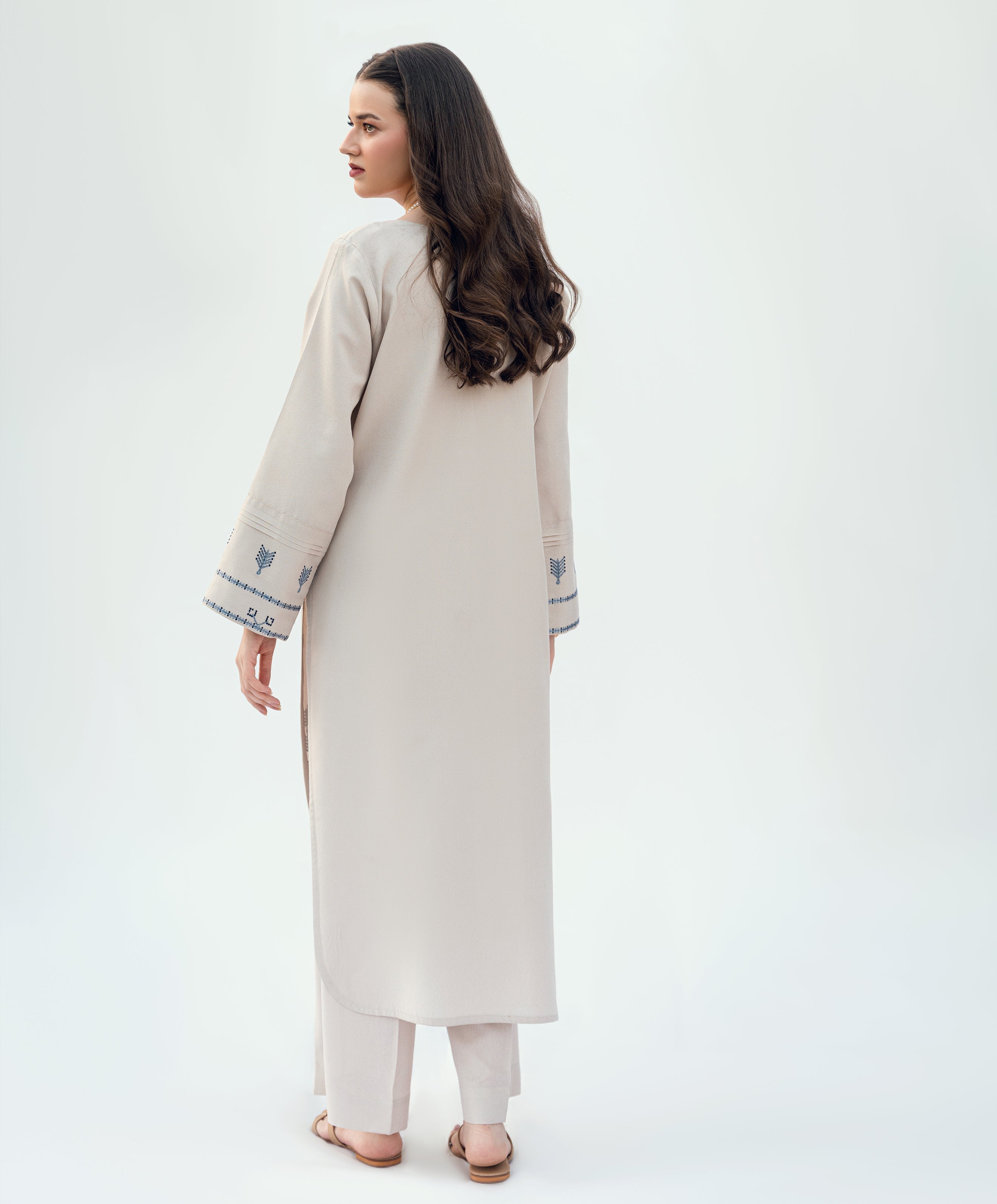 Ivory / (Dirty White) karandi two piece set. embroidered front and sleeves (with mystery kaanthaa work). Neckline embellished with pearl handwork. Straight long shirt with wide legged straight pants.