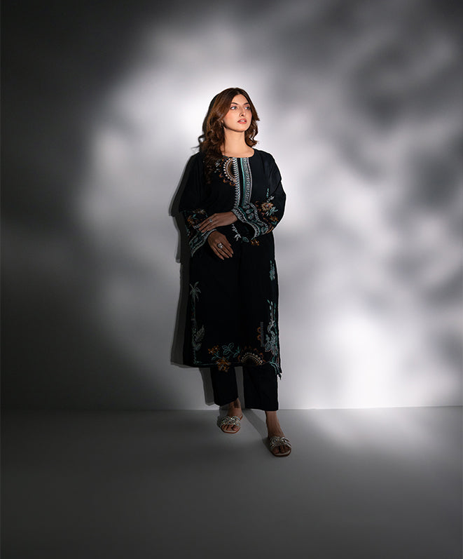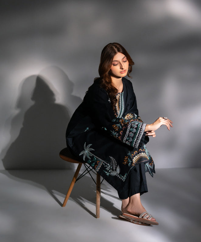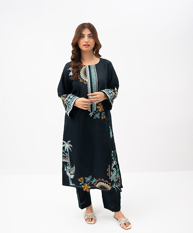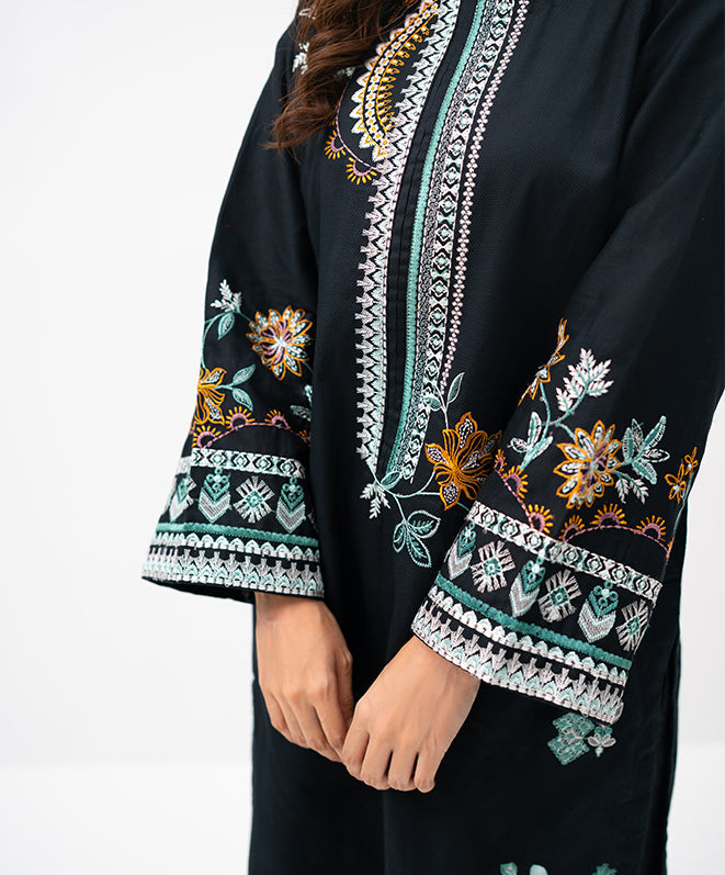 Jet black textured cotton co-ord set featuring a long straight shirt paired with straight pants. The shirt is embroidered with multicolored viscose threads, showcasing the signature Kaanthaa stitch intricately woven into the design. The scalloped hem, detailed along the embroidery, adds a soft three-dimensional finish