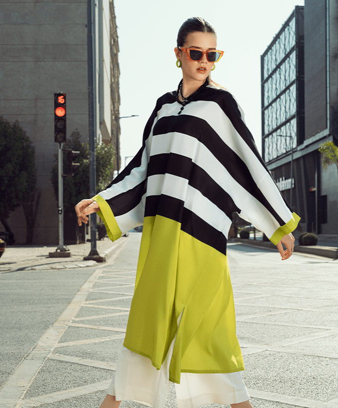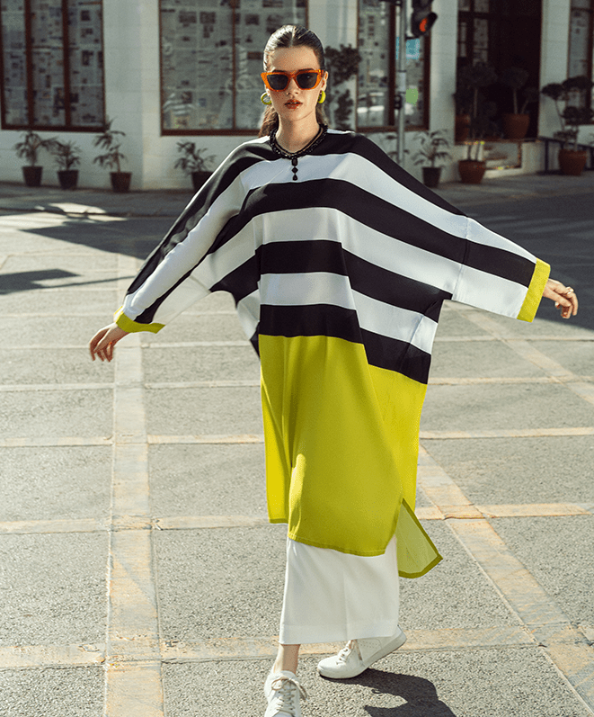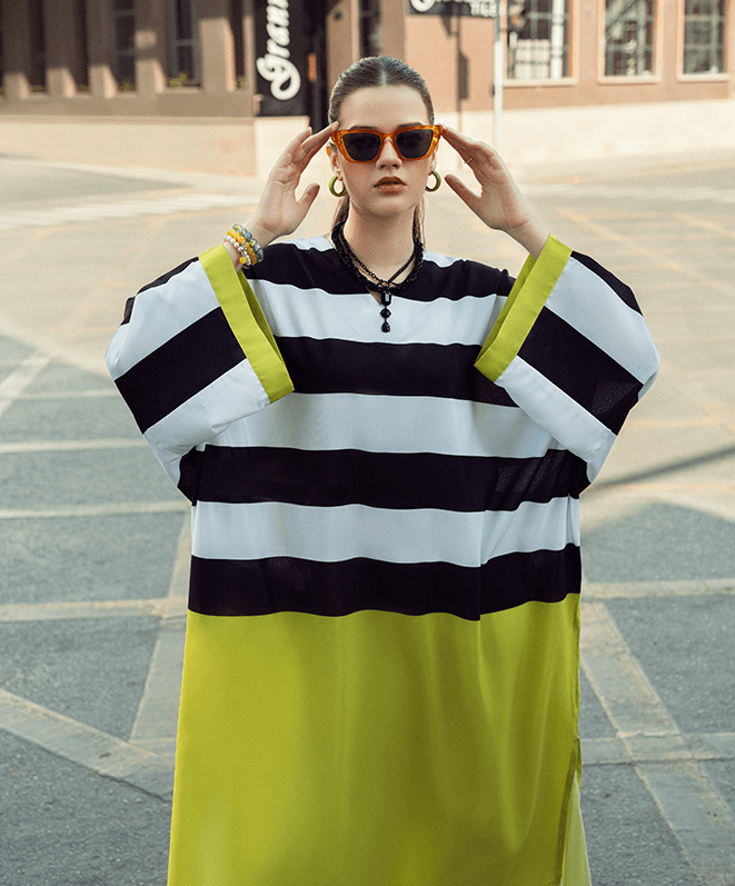 Light up your evenings with Neon Nights. This bold piece includes bold black-and-white striped top with vibrant lime-green lower detailing and cuffs. This outfit embodies an eye-catching contrast that is perfect for outdoors and casual wear.