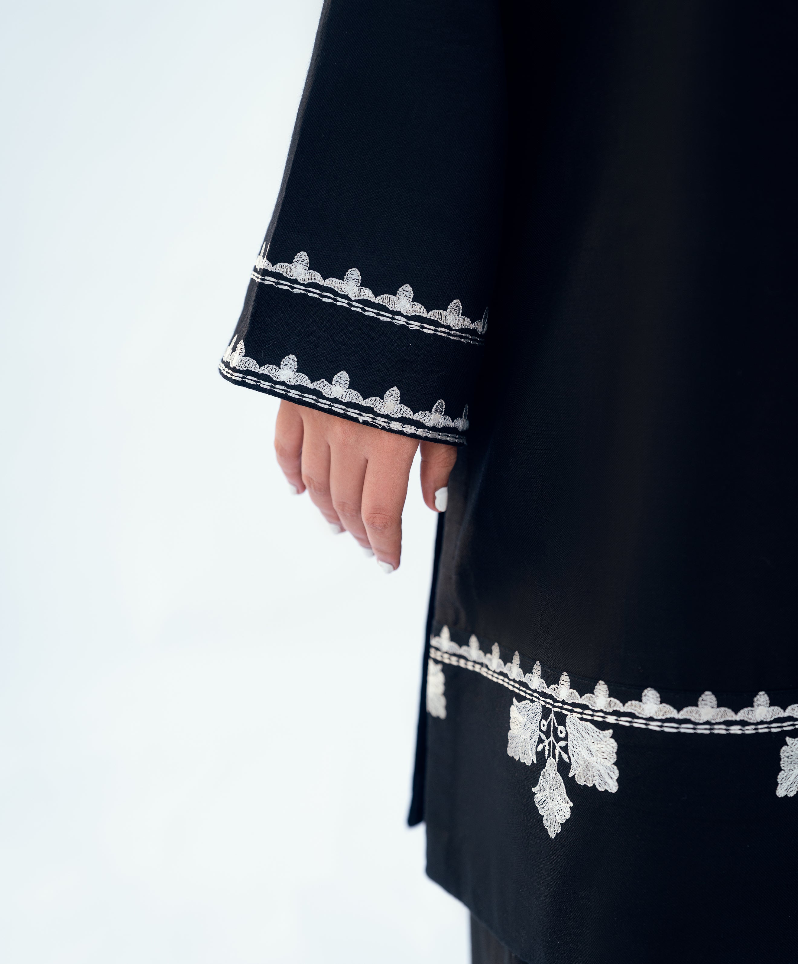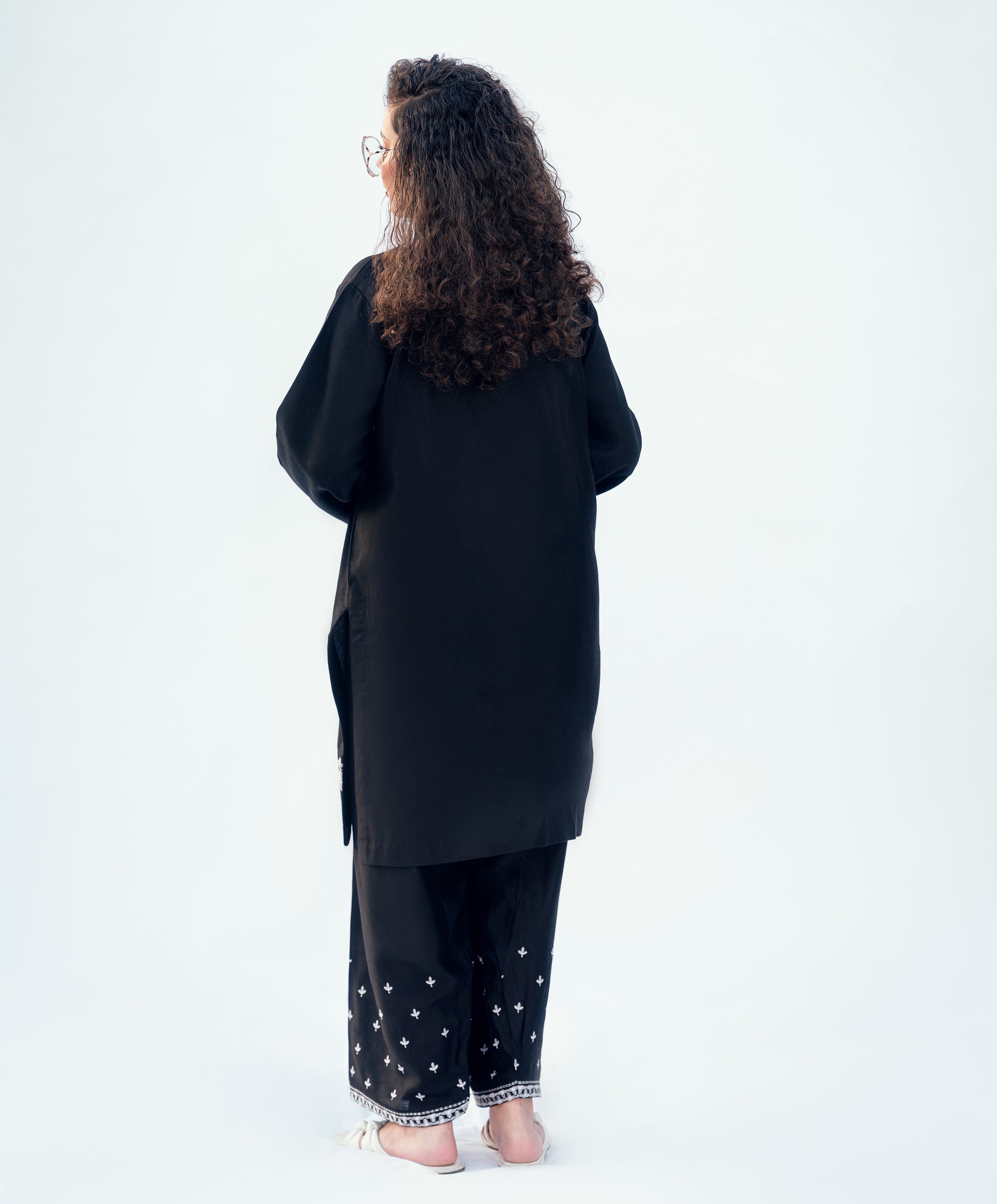 Embroidered black shalwar suit in pure twill viscose.Tatami and kaanthaa embroidery on shirt and shalwar. Short shirt, regular shalwar.
