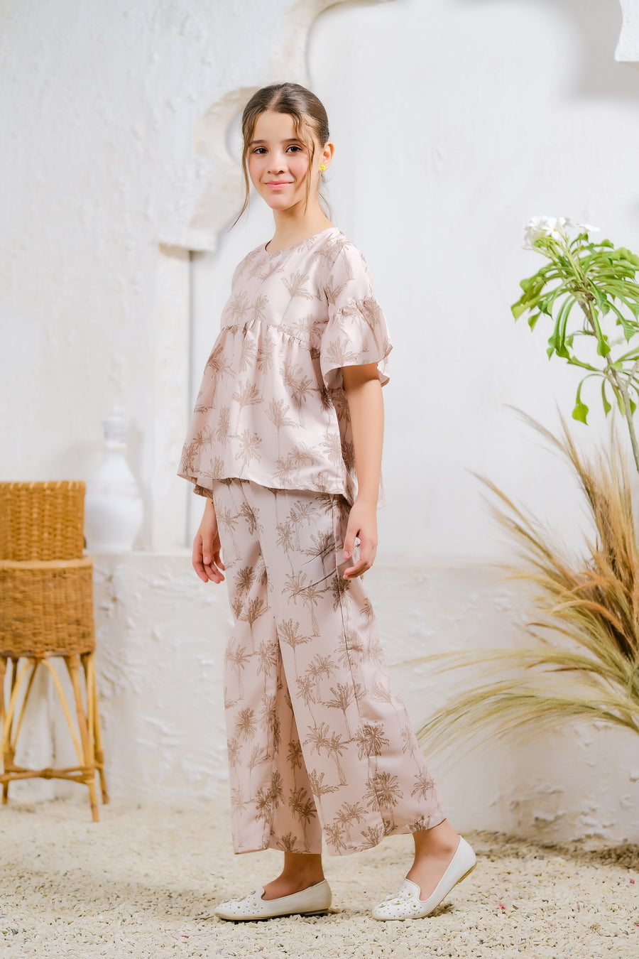 This adorable co-ord set features a breezy top with fluttery sleeves and wide-legged pants adorned with delicate palm tree motifs. Crafted from soft fabric, it's perfect for casual outings and playdates, offering both comfort and style for your little one.
