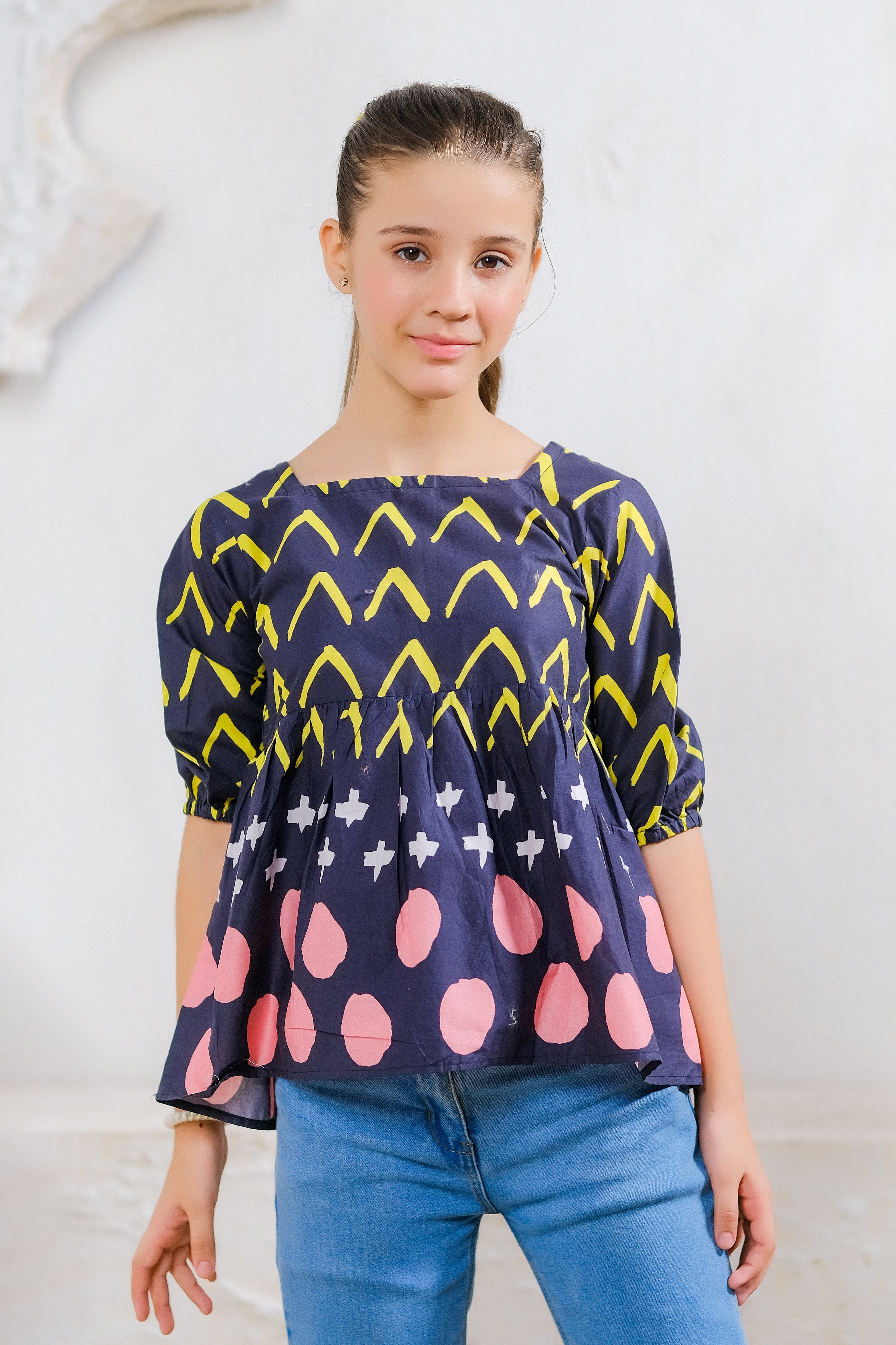 A fun and lively dress featuring a bold chevron pattern in yellow against a black background, accented with playful pink dots and white crosses. Perfect for adding a pop of color to any occasion.