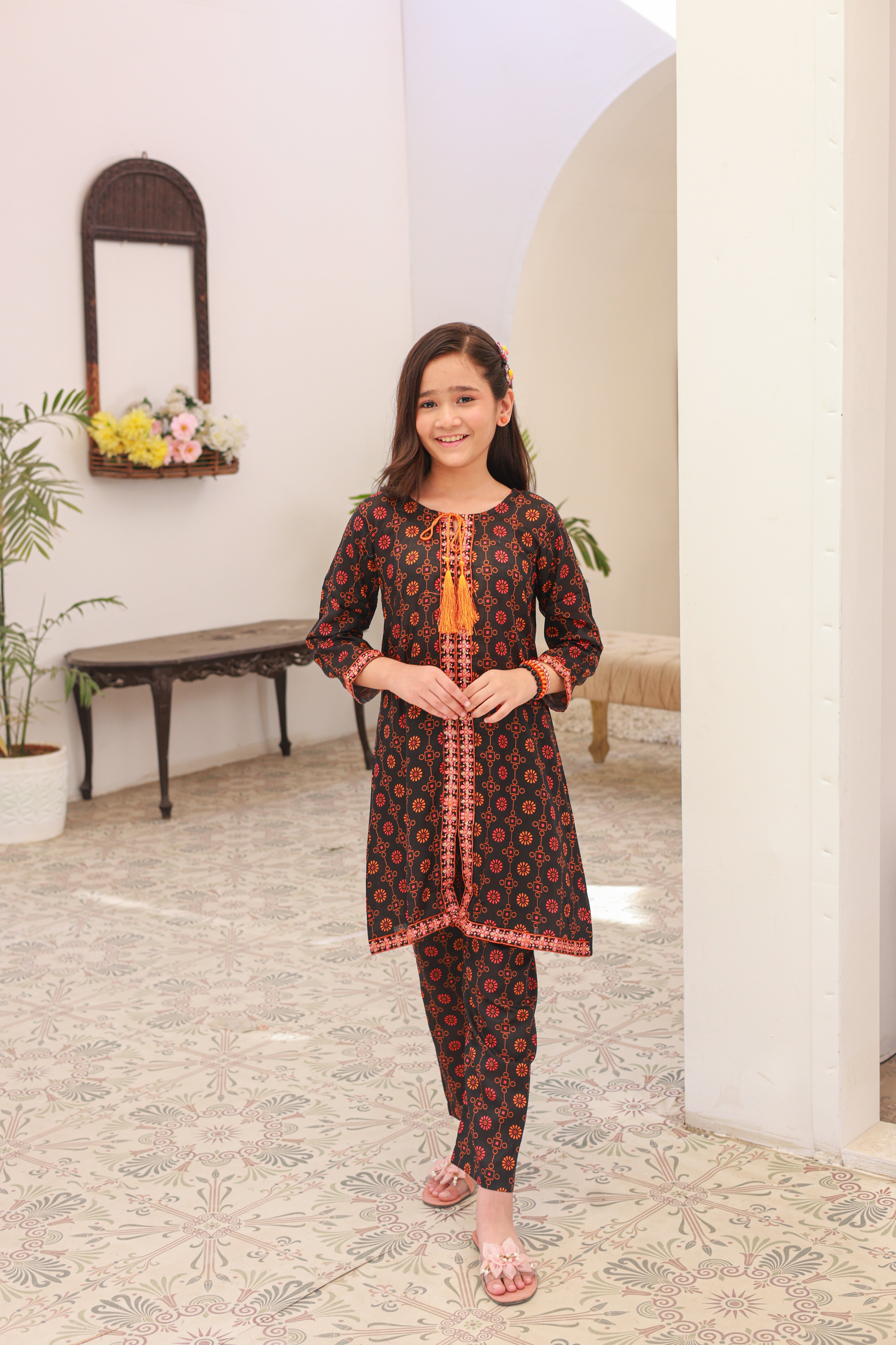 Enhance your child's wardrobe with Khanak's Printed and Embroided Lawn Stitched 2-Piece set. This stylish ensemble includes a digitally printed shirt and cozy trousers, making it the ideal choice for casual outings or fun-filled adventures.