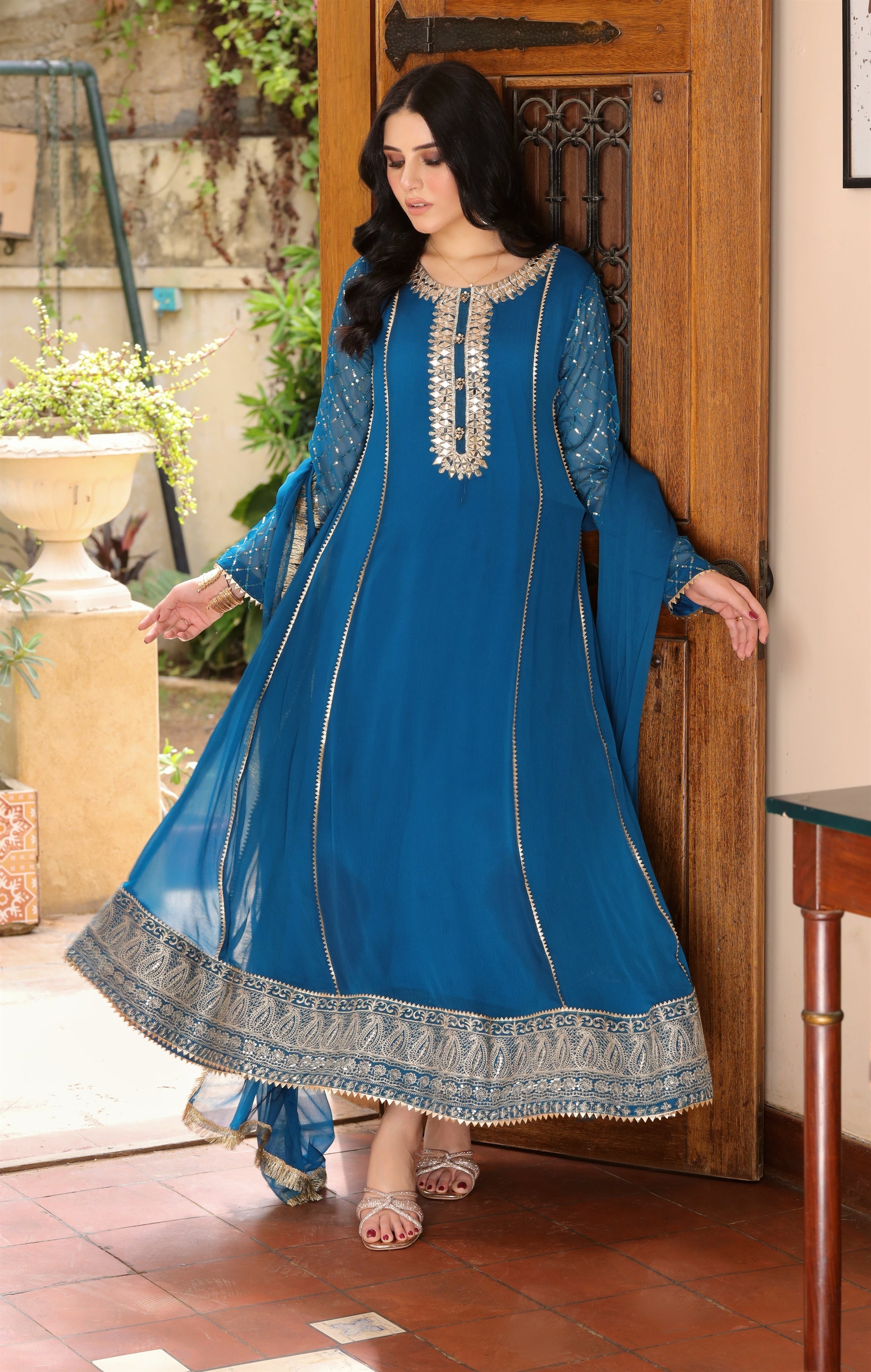 Description: Elevate your wardrobe with this beautiful dress. The front panel is plain chiffon, with an embellished neckline mirror work....