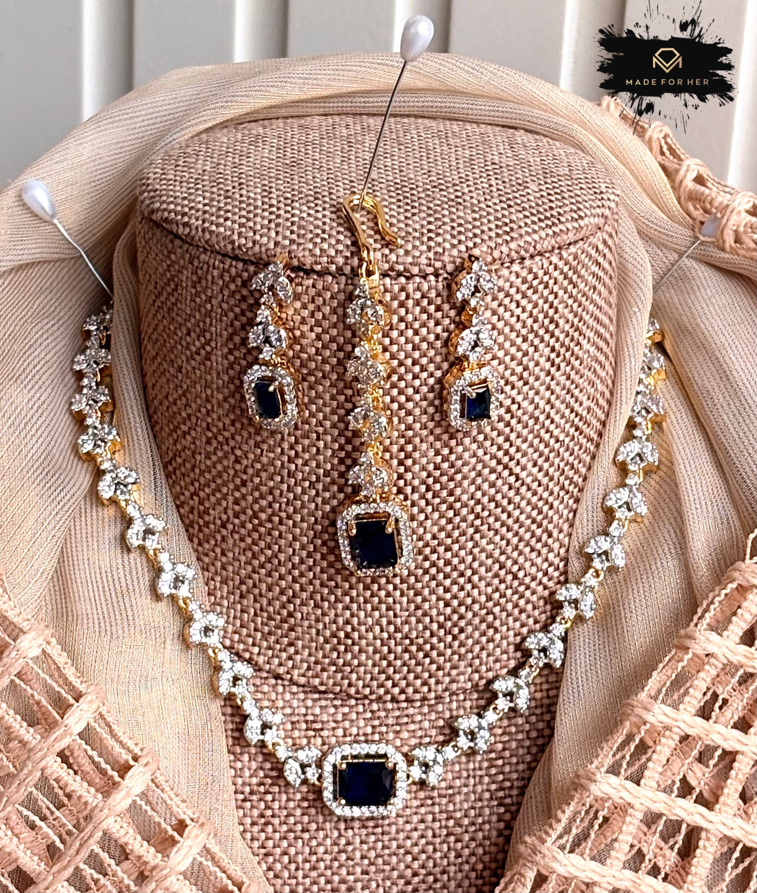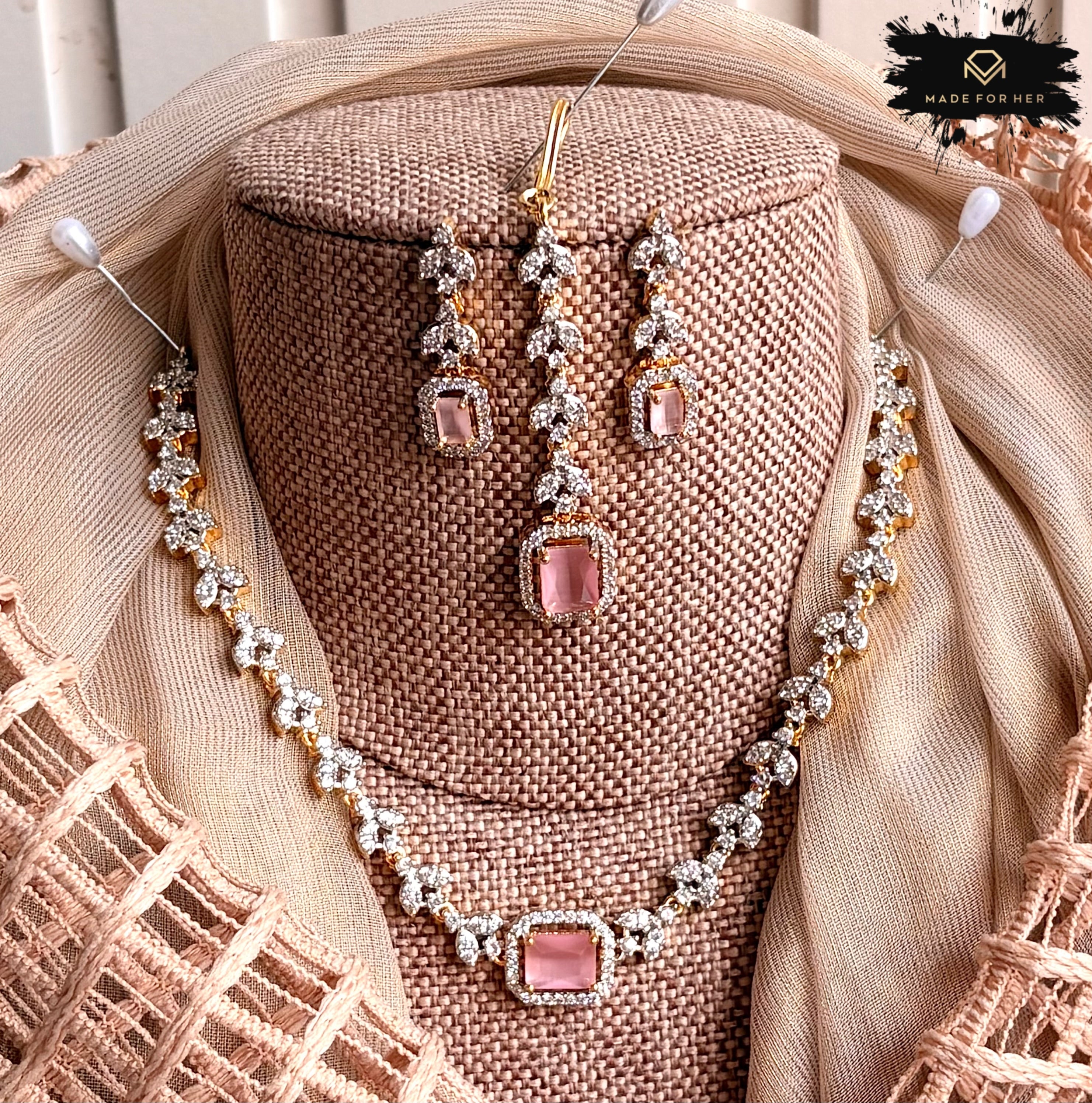 Elevate your look with the timeless elegance of the Elanza Zircon Necklace Set. Designed with finely cut zircon stones and a radiant finish, this set adds a graceful sparkle to both festive and formal outfits. Its balanced design makes it a perfect choice for weddings, parties, and special occasions where you want a refined yet eye-catching statement.