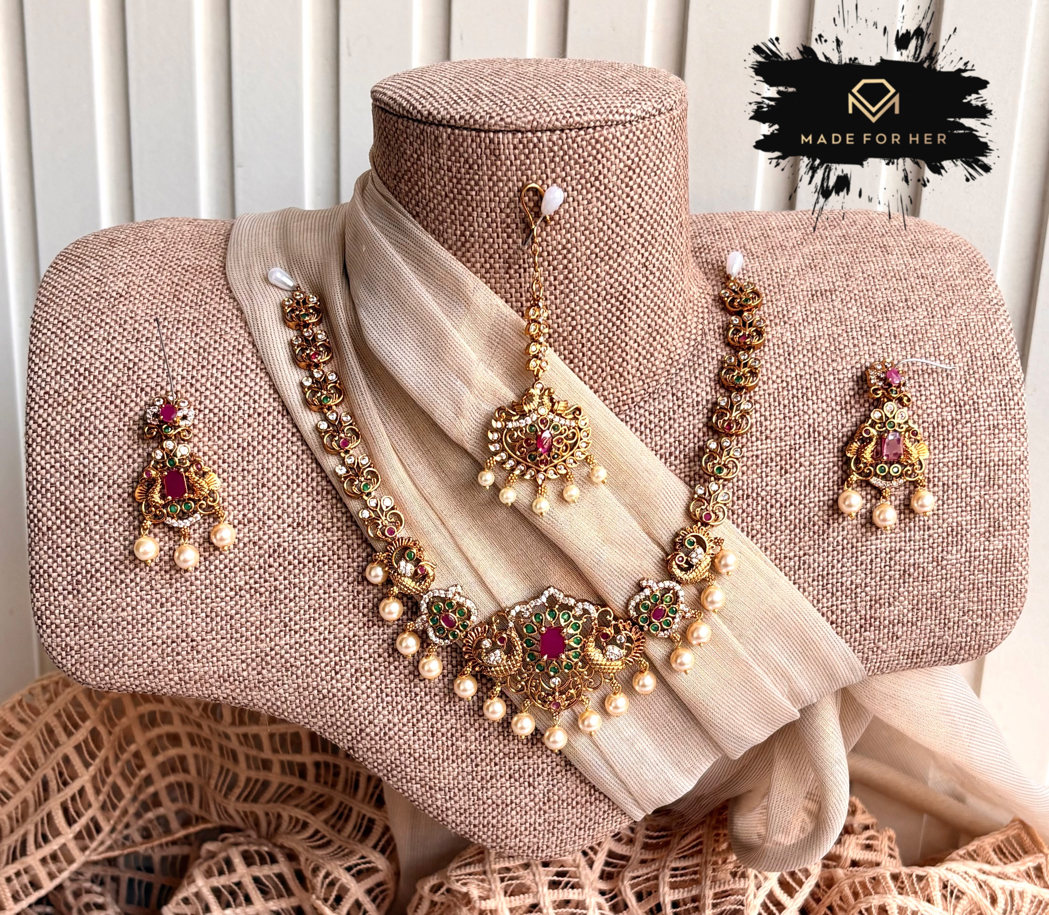 A timeless ethnic necklace set crafted to elevate traditional and festive looks. Designed with intricate detailing and a rich finish, this set adds elegance and grace to weddings, celebrations, and formal occasions. Lightweight yet statement-making, it pairs beautifully with sarees, lehengas, and formal wear.